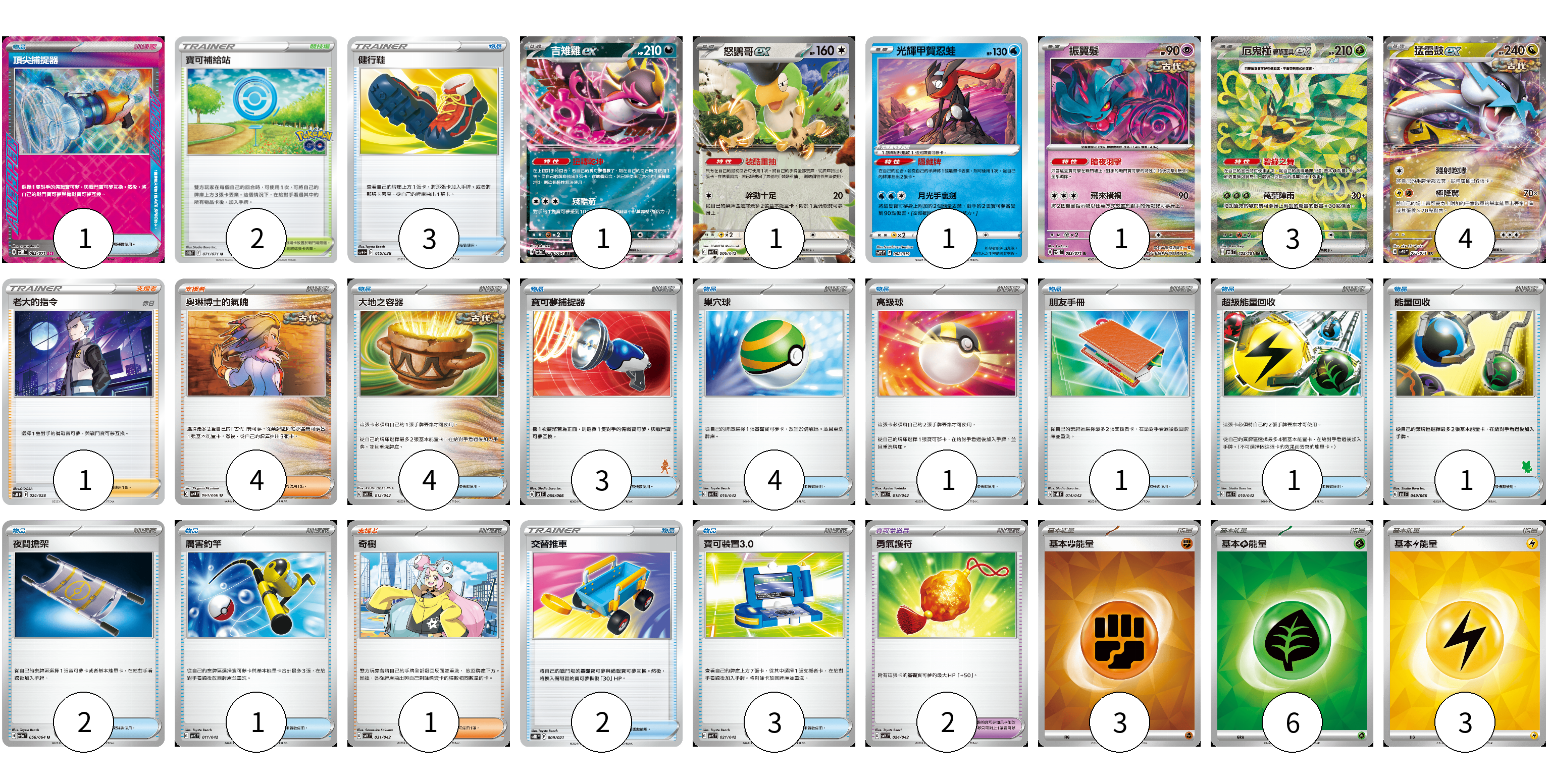牌組構築方案 以此牌組為基礎新構築牌組 顯示卡面 顯示列表 寶可夢卡(11) 1 1 1 1 3 4 寶可夢道具(2) 2 物品卡(27) 1 3 4 3 4 1 1 1 1 2 1 2 3 支援者卡(6) 1 4 1 競技場卡(2) 2 能量卡(12) 3 6 3 寶可夢卡(11) 卡牌名稱 張數 卡牌名稱 張數 吉雉雞ex SV6a 038/064 01 怒鸚哥ex SVK 006/042 01 光輝甲賀忍蛙 SVTG 002/019 01 振翼髮 SV5K 033/071 01 厄鬼椪 碧草面具ex SV6 125/101 03 猛雷鼓ex SV5K 053/071 04 寶可夢道具(2) 卡牌名稱 張數 卡牌名稱 張數 勇氣護符 SVK 024/042 02 物品卡(27) 卡牌名稱 張數 卡牌名稱 張數 頂尖捕捉器 SV5M 062/071 01 健行鞋 SVF 015/038 03 大地之容器 SVK 012/042 04 寶可夢捕捉器 SVI 055/066 03 巢穴球 SVK 016/042 04 高級球 SVK 018/042 01 朋友手冊 SVK 014/042 01 超級能量回收 SVK 010/042 01 能量回收 SVI 049/066 01 夜間擔架 SV6a 056/064 02 厲害釣竿 SVK 011/042 01 交替推車 SVTR 009/021 02 寶可裝置3.0 SVK 021/042 03 支援者卡(6) 卡牌名稱 張數 卡牌名稱 張數 老大的指令(赤日) SVB 024/028 01 奧琳博士的氣魄 SV4K 064/066 04 奇樹 SVK 031/042 01 競技場卡(2) 卡牌名稱 張數 卡牌名稱 張數 寶可補給站 S10b 071/071 02 能量卡(12) 卡牌名稱 張數 卡牌名稱 張數 基本【鬥】能量 SVK FIG 03 基本【草】能量 SVK GRA 06 基本【雷】能量 SVK LIG 03 以此牌組為基礎新構築牌組 牌組編碼 ridlhG-pEQyVL-ssNAbX copy 列印牌組單 牌組編碼已複製 分享至SNS