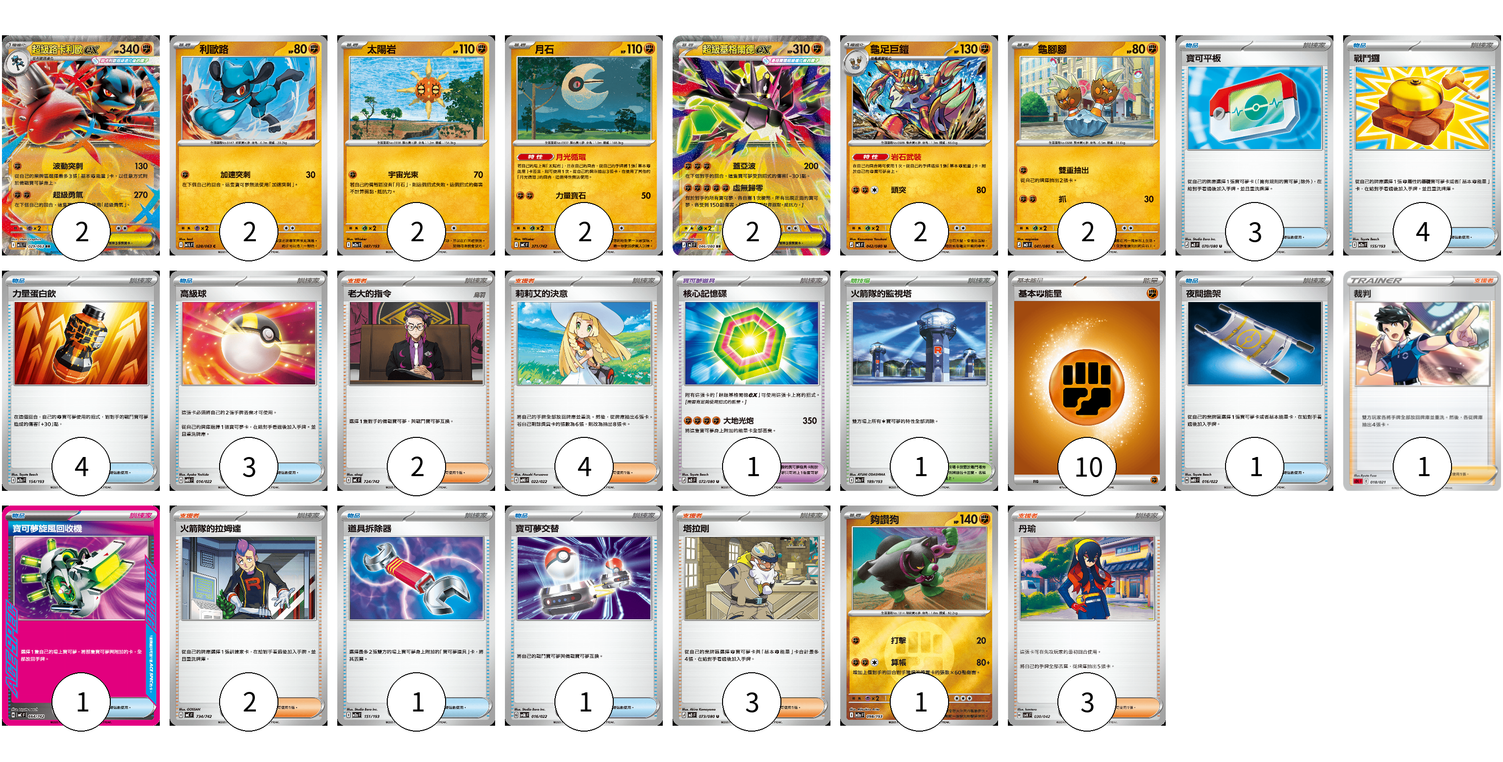 牌組構築方案 以此牌組為基礎新構築牌組 顯示卡面 顯示列表 寶可夢卡(15) 2 2 2 2 2 2 2 1 寶可夢道具(1) 1 物品卡(18) 3 4 4 3 1 1 1 1 支援者卡(15) 2 4 1 2 3 3 競技場卡(1) 1 能量卡(10) 10 寶可夢卡(15) 卡牌名稱 張數 卡牌名稱 張數 超級路卡利歐ex M1L 029/063 02 利歐路 M1L 028/063 02 太陽岩 M2a 087/193 02 月石 MC 371/742 02 超級基格爾德ex M3 046/080 02 龜足巨鎧 M3 042/080 02 龜腳腳 M3 041/080 02 夠讚狗 M2a 098/193 01 寶可夢道具(1) 卡牌名稱 張數 卡牌名稱 張數 核心記憶碟 M3 072/080 01 物品卡(18) 卡牌名稱 張數 卡牌名稱 張數 寶可平板 M3 070/080 03 戰鬥鑼 M2a 155/193 04 力量蛋白飲 M2a 154/193 04 高級球 MBD 014/022 03 夜間擔架 MBD 016/022 01 寶可夢旋風回收機 MC 664/742 01 道具拆除器 M2a 151/193 01 寶可夢交替 SVQL 016/022 01 支援者卡(15) 卡牌名稱 張數 卡牌名稱 張數 老大的指令 MC 724/742 02 莉莉艾的決意 MBG 022/022 04 裁判 SDL 018/021 01 火箭隊的拉姆達 MC 734/742 02 塔拉剛 M3 073/080 03 丹瑜 SVK 030/042 03 競技場卡(1) 卡牌名稱 張數 卡牌名稱 張數 火箭隊的監視塔 M2a 189/193 01 能量卡(10) 卡牌名稱 張數 卡牌名稱 張數 基本【鬥】能量 MC FIG 10 以此牌組為基礎新構築牌組 牌組編碼 rlKkXD-EOEwYT-BdoBom copy 列印牌組單 牌組編碼已複製 分享至SNS
