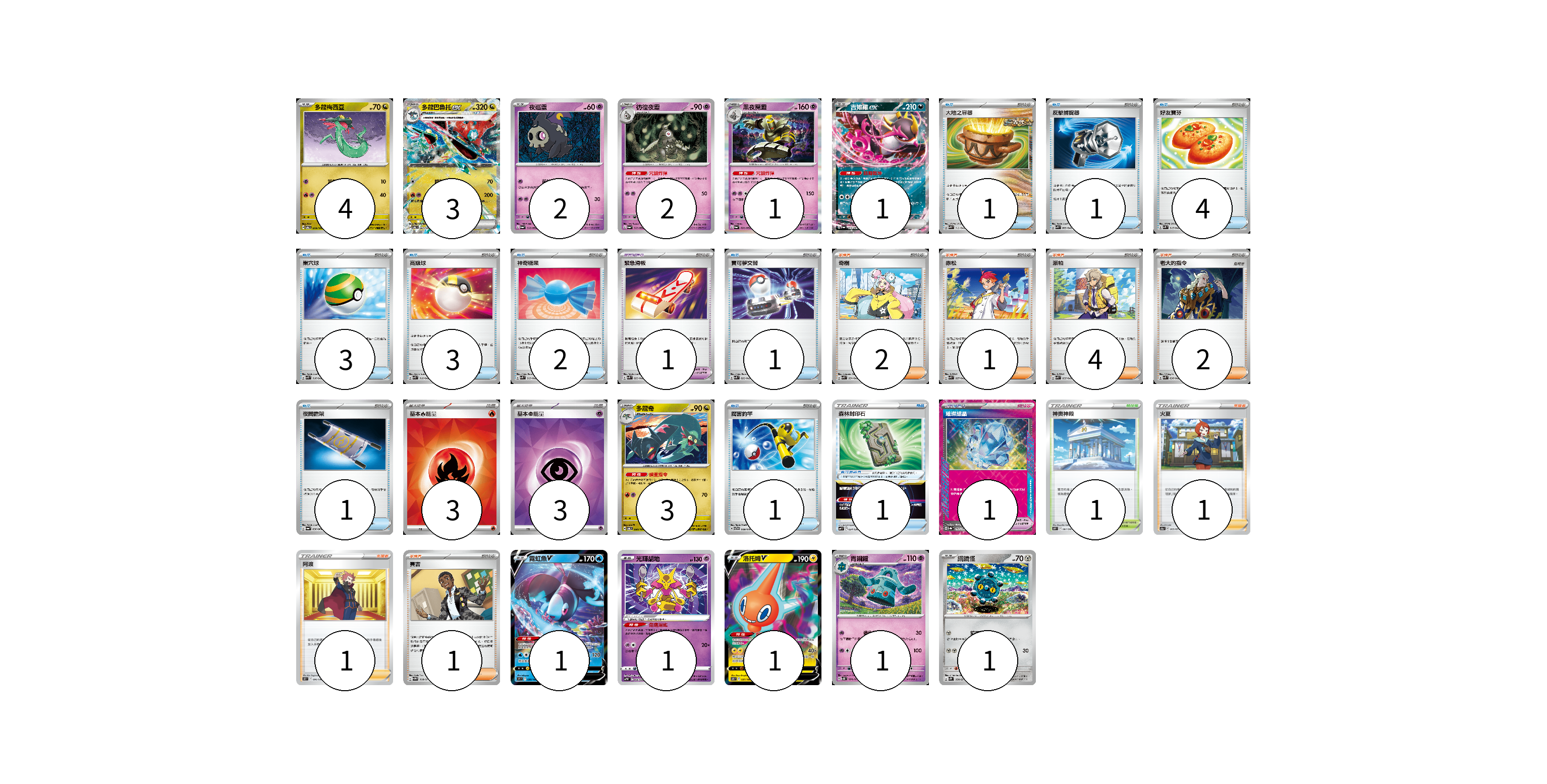 牌組構築方案 以此牌組為基礎新構築牌組 顯示卡面 顯示列表 寶可夢卡(21) 4 3 2 2 1 1 3 1 1 1 1 1 寶可夢道具(2) 1 1 物品卡(18) 1 1 4 3 3 2 1 1 1 1 支援者卡(12) 2 1 4 2 1 1 1 競技場卡(1) 1 能量卡(6) 3 3 寶可夢卡(21) 卡牌名稱 張數 卡牌名稱 張數 多龍梅西亞 SV6 079/101 04 多龍巴魯托ex SV6 081/101 03 夜巡靈 SV6a 018/064 02 彷徨夜靈 SV6a 019/064 02 黑夜魔靈 SV6a 020/064 01 吉雉雞ex SV6a 038/064 01 多龍奇 SV6 080/101 03 霓虹魚V S9 030/100 01 光輝胡地 SVTM 006/022 01 洛托姆V S11 037/100 01 青銅鐘 SV5K 029/071 01 銅鏡怪 SV2P 050/071 01 寶可夢道具(2) 卡牌名稱 張數 卡牌名稱 張數 緊急滑板 SVK 023/042 01 璀璨結晶 SV8a 152/187 01 物品卡(18) 卡牌名稱 張數 卡牌名稱 張數 大地之容器 SVK 012/042 01 反擊捕捉器 SVK 009/042 01 好友寶芬 SVK 015/042 04 巢穴球 SVK 016/042 03 高級球 SVK 018/042 03 神奇糖果 SVK 019/042 02 寶可夢交替 SVK 022/042 01 夜間擔架 SV6a 056/064 01 厲害釣竿 SVTG 009/019 01 森林封印石 SVF 024/038 01 支援者卡(12) 卡牌名稱 張數 卡牌名稱 張數 奇樹 SVK 031/042 02 赤松 SVK 027/042 01 派帕 SVK 035/042 04 老大的指令 SVK 036/042 02 火夏 S10a 069/071 01 阿渡 S12 096/098 01 賽吉 SV5M 068/071 01 競技場卡(1) 卡牌名稱 張數 卡牌名稱 張數 神奧神殿 S10P 067/067 01 能量卡(6) 卡牌名稱 張數 卡牌名稱 張數 基本【火】能量 SVK FIR 03 基本【超】能量 SVK PSY 03 以此牌組為基礎新構築牌組 牌組編碼 rlPSej-PSltSQ-enGrxm copy 列印牌組單 牌組編碼已複製 分享至SNS
