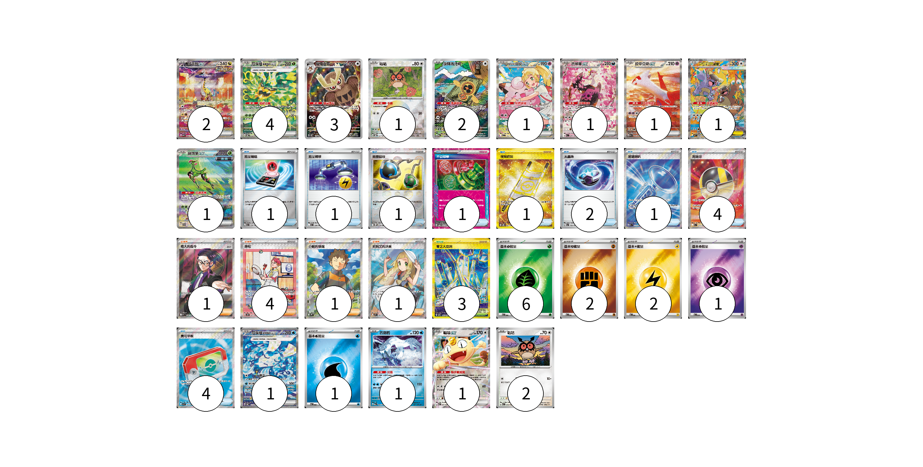 牌組構築方案 以此牌組為基礎新構築牌組 顯示卡面 顯示列表 寶可夢卡(22) 2 4 3 1 2 1 1 1 1 1 1 1 1 2 物品卡(16) 1 1 1 1 1 2 1 4 4 支援者卡(7) 1 4 1 1 競技場卡(3) 3 能量卡(12) 6 2 2 1 1 寶可夢卡(22) 卡牌名稱 張數 卡牌名稱 張數 猛雷鼓ex SV5K 095/071 02 厄鬼椪 碧草面具ex SV6 125/101 04 貓頭夜鷹 SV7 114/102 03 咕咕 SV8a 127/187 01 旋轉洛托姆 M2a 213/193 02 莉莉艾的皮皮ex MC 765/742 01 吉雉雞ex M2a 244/193 01 拉帝亞斯ex SV7a 087/064 01 超級袋獸ex M1S 089/063 01 鐵斑葉ex SV5M 093/071 01 厄鬼椪 水井面具ex SV6 127/101 01 古劍豹 M2a 043/193 01 喵喵ex M3 061/080 01 咕咕 MC 572/742 02 物品卡(16) 卡牌名稱 張數 卡牌名稱 張數 能量輸送 MC 639/742 01 能量轉移 MC 638/742 01 能量回收 SV11W 079/086 01 不公印章 SV5a 053/066 01 夜間擔架 SV8 137/106 01 太晶珠 M2a 152/193 02 玻璃喇叭 M2a 215/193 01 高級球 M2a 216/193 04 寶可平板 M3 103/080 04 支援者卡(7) 卡牌名稱 張數 卡牌名稱 張數 老大的指令(烏羽) MC 760/742 01 赤松 SV8a 227/187 04 小剛的發掘 SV9 123/100 01 莉莉艾的決意 M1L 086/063 01 競技場卡(3) 卡牌名稱 張數 卡牌名稱 張數 零之大空洞 SV7 135/102 03 能量卡(12) 卡牌名稱 張數 卡牌名稱 張數 基本【草】能量 MC GRA 06 基本【鬥】能量 MC FIG 02 基本【雷】能量 MC LIG 02 基本【超】能量 MC PSY 01 基本【水】能量 MC WAT 01 以此牌組為基礎新構築牌組 牌組編碼 rmZAXx-XbQvTj-jgRnkO copy 列印牌組單 牌組編碼已複製 分享至SNS