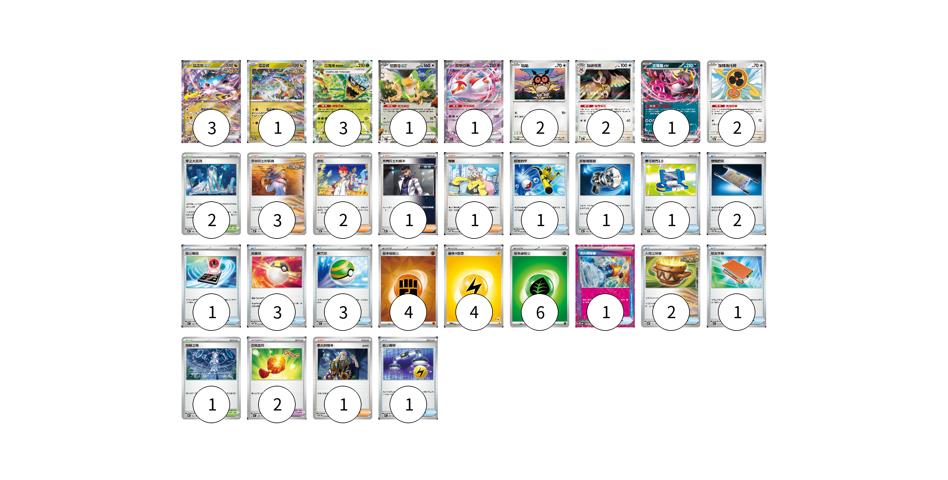 牌組構築方案 以此牌組為基礎新構築牌組 顯示卡面 顯示列表 寶可夢卡(16) 3 1 3 1 1 2 2 1 2 寶可夢道具(2) 2 物品卡(17) 1 1 1 2 1 3 3 1 2 1 1 支援者卡(8) 3 2 1 1 1 競技場卡(3) 2 1 能量卡(14) 4 4 6 寶可夢卡(16) 卡牌名稱 張數 卡牌名稱 張數 猛雷鼓ex SV8a 124/187 03 猛雷鼓 SV7 075/102 01 厄鬼椪 碧草面具ex SV8a 020/187 03 怒鸚哥ex SVK 006/042 01 拉帝亞斯ex SV7a 019/064 01 咕咕 SV7 076/102 02 貓頭夜鷹 SV8a 128/187 02 吉雉雞ex SVOD 004/020 01 旋轉洛托姆 SV8a 131/187 02 寶可夢道具(2) 卡牌名稱 張數 卡牌名稱 張數 勇氣護符 SVM 142/175 02 物品卡(17) 卡牌名稱 張數 卡牌名稱 張數 厲害釣竿 SVOD 010/020 01 反擊捕捉器 SV8a 139/187 01 寶可裝置3.0 SVK 021/042 01 夜間擔架 SVOM 016/021 02 能量輸送 SVM 128/175 01 高級球 SVOD 012/020 03 巢穴球 SVM 133/175 03 頂尖捕捉器 SV8a 148/187 01 大地之容器 SV8a 143/187 02 朋友手冊 SVK 014/042 01 能量轉移 SVK 008/042 01 支援者卡(8) 卡牌名稱 張數 卡牌名稱 張數 奧琳博士的氣魄 SV8a 167/187 03 赤松 SV8a 163/187 02 弗圖博士的劇本 SV8a 175/187 01 奇樹 SVOD 016/020 01 老大的指令 SVOD 019/020 01 競技場卡(3) 卡牌名稱 張數 卡牌名稱 張數 零之大空洞 SV8a 182/187 02 阻礙之塔 SV8a 181/187 01 能量卡(14) 卡牌名稱 張數 卡牌名稱 張數 基本【鬥】能量 SVK FIG 04 基本【雷】能量 SVI LIG 04 基本【草】能量 SVTM GRA 06 以此牌組為基礎新構築牌組 牌組編碼 rmeIwX-XvKAAa-bblsZx copy 列印牌組單 牌組編碼已複製 分享至SNS