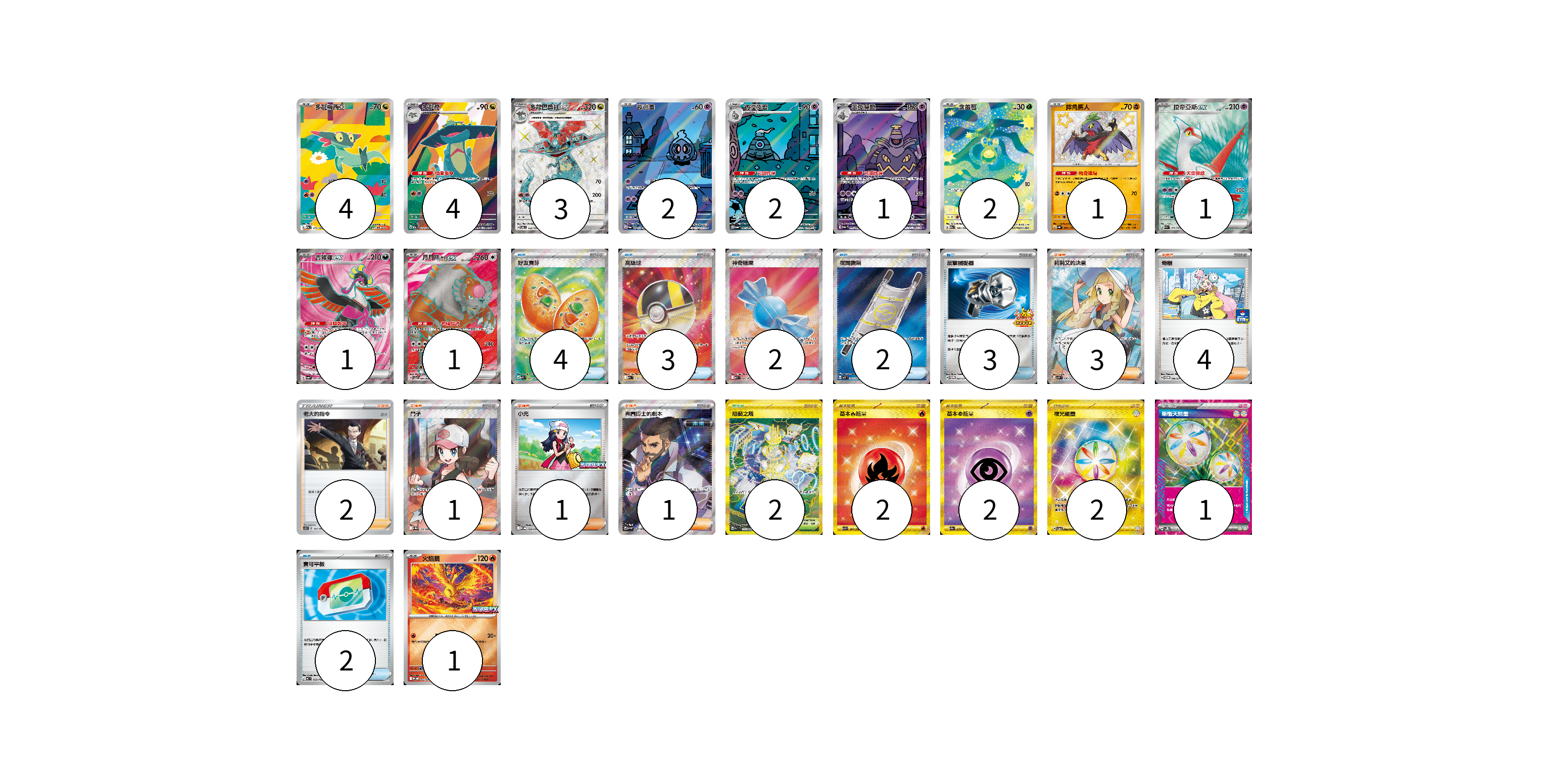 牌組構築方案 以此牌組為基礎新構築牌組 顯示卡面 顯示列表 寶可夢卡(23) 4 4 3 2 2 1 2 1 1 1 1 1 物品卡(16) 4 3 2 2 3 2 支援者卡(12) 3 4 2 1 1 1 競技場卡(2) 2 能量卡(7) 2 2 2 1 寶可夢卡(23) 卡牌名稱 張數 卡牌名稱 張數 多龍梅西亞 M2a 211/193 04 多龍奇 M2a 212/193 04 多龍巴魯托ex SV6 120/101 03 夜巡靈 SV6a 068/064 02 彷徨夜靈 SV6a 069/064 02 黑夜魔靈 SV6a 070/064 01 含羞苞 M2a 196/193 02 摔角鷹人 SV4a 282/190 01 拉帝亞斯ex SV7a 078/064 01 吉雉雞ex SV6a 081/064 01 月月熊 赫月 ex SV5a 084/066 01 火焰鳥 M-P 022/M-P 01 物品卡(16) 卡牌名稱 張數 卡牌名稱 張數 好友寶芬 M1S 081/063 04 高級球 M2a 216/193 03 神奇糖果 M1S 082/063 02 夜間擔架 M1L 083/063 02 反擊捕捉器 SV-P 083/SV-P 03 寶可平板 MC 662/742 02 支援者卡(12) 卡牌名稱 張數 卡牌名稱 張數 莉莉艾的決意 M1L 086/063 03 奇樹 SV-P 106/SV-P 04 老大的指令(坂木) SC1D 161/164 02 鬥子 SV11W 166/086 01 小光 M-P 028/M-P 01 弗圖博士的劇本 SV4M 086/066 01 競技場卡(2) 卡牌名稱 張數 卡牌名稱 張數 阻礙之塔 SV10 132/098 02 能量卡(7) 卡牌名稱 張數 卡牌名稱 張數 基本【火】能量 SV3 141/108 02 基本【超】能量 SV2a 210/165 02 夜光能量 SV5a 096/066 02 新衝天能量 SV5K 071/071 01 以此牌組為基礎新構築牌組 牌組編碼 rniCwk-epzcLh-tdHCtB copy 列印牌組單 牌組編碼已複製 分享至SNS