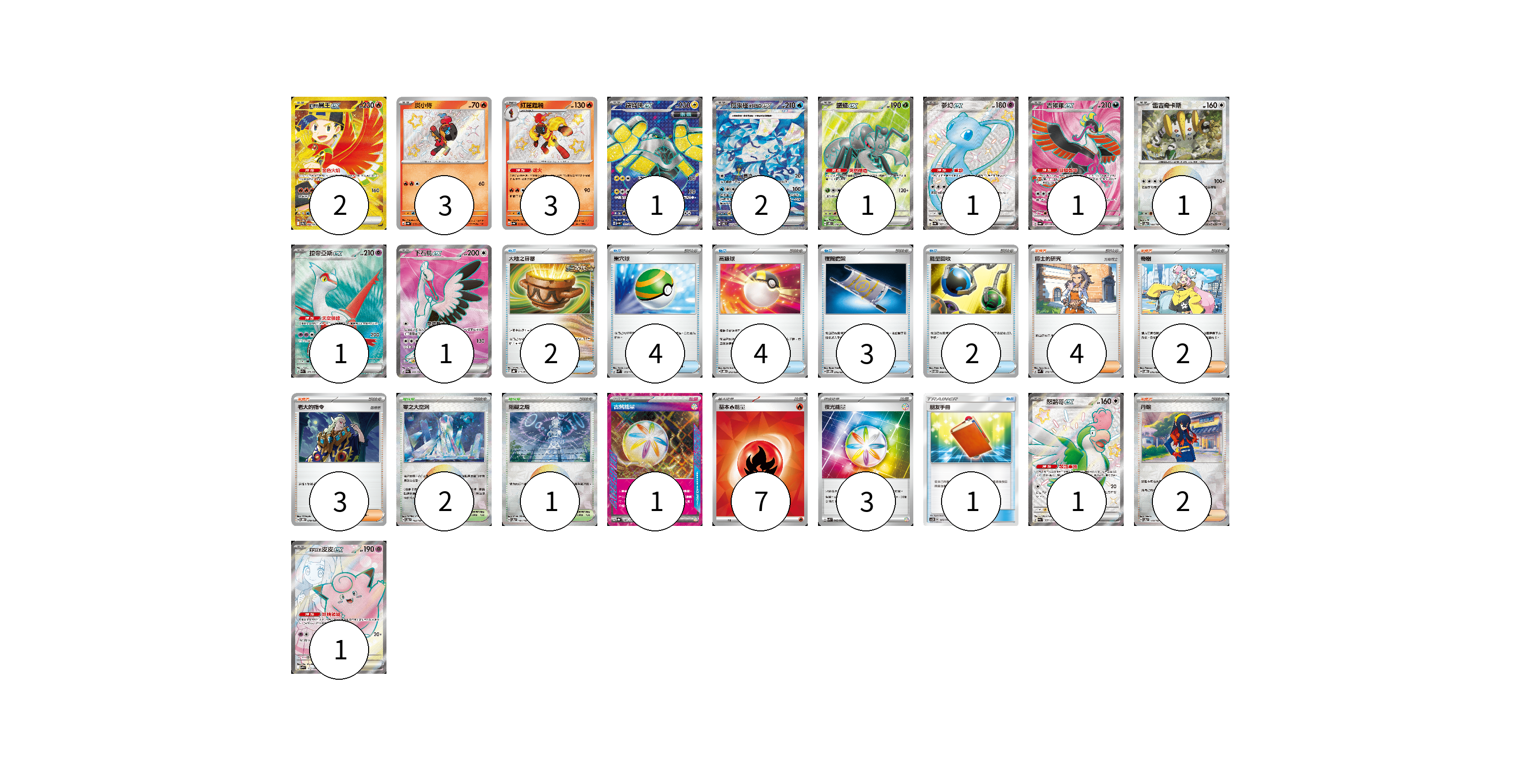 牌組構築方案 以此牌組為基礎新構築牌組 顯示卡面 顯示列表 寶可夢卡(19) 2 3 3 1 2 1 1 1 1 1 1 1 1 物品卡(16) 2 4 4 3 2 1 支援者卡(11) 4 2 3 2 競技場卡(3) 2 1 能量卡(11) 1 7 3 寶可夢卡(19) 卡牌名稱 張數 卡牌名稱 張數 <阿響的>鳳王ex SV9a 090/063 02 炭小侍 SV4a 217/190 03 紅蓮鎧騎 SV4a 218/190 03 鐵臂膀ex SV4M 079/066 01 厄鬼椪 水井面具ex SV6 127/101 02 鐵蟻ex SV8 119/106 01 夢幻ex SV4a 327/190 01 吉雉雞ex SV6a 081/064 01 雷吉奇卡斯 SV8a 132/187 01 拉帝亞斯ex SV7a 078/064 01 下石鳥ex SV3a 080/062 01 怒鸚哥ex SV4a 337/190 01 莉莉艾的皮皮ex SV9 115/100 01 物品卡(16) 卡牌名稱 張數 卡牌名稱 張數 大地之容器 SVHK 011/022 02 巢穴球 SVM 133/175 04 高級球 SVOD 012/020 04 夜間擔架 SVOM 016/021 03 能量回收 SVTM 009/022 02 朋友手冊 AC2D 145/176 01 支援者卡(11) 卡牌名稱 張數 卡牌名稱 張數 博士的研究 SVM 170/175 04 奇樹 SVOD 016/020 02 老大的指令 SVOD 019/020 03 丹瑜 SV8a 170/187 02 競技場卡(3) 卡牌名稱 張數 卡牌名稱 張數 零之大空洞 SV8a 182/187 02 阻礙之塔 SV8a 181/187 01 能量卡(11) 卡牌名稱 張數 卡牌名稱 張數 古舊能量 SV8a 187/187 01 基本【火】能量 SVK FIR 07 夜光能量 SVK 042/042 03 以此牌組為基礎新構築牌組 牌組編碼 rnlAUi-tUBMxy-RSetGk copy 列印牌組單 牌組編碼已複製 分享至SNS