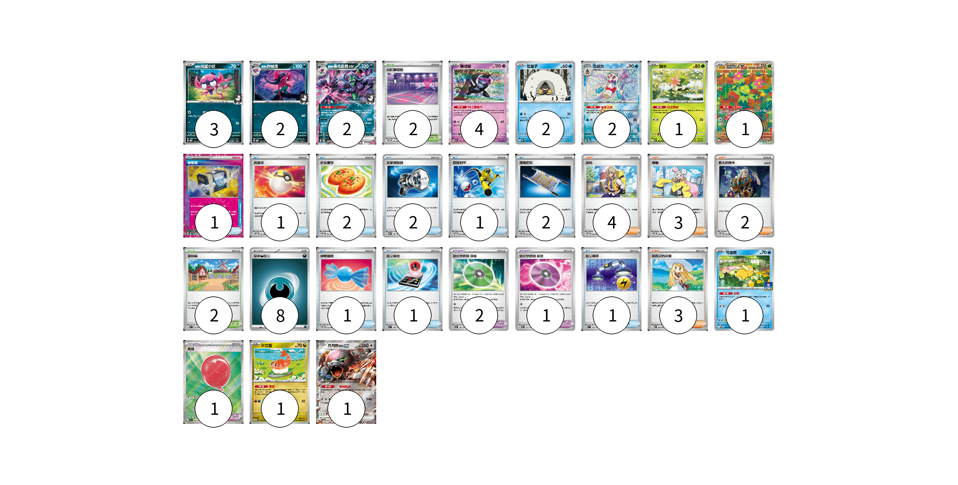 牌組構築方案 以此牌組為基礎新構築牌組 顯示卡面 顯示列表 寶可夢卡(20) 3 2 2 4 2 2 1 1 1 1 1 寶可夢道具(4) 2 1 1 物品卡(12) 1 1 2 2 1 2 1 1 1 支援者卡(12) 4 3 2 3 競技場卡(4) 2 2 能量卡(8) 8 寶可夢卡(20) 卡牌名稱 張數 卡牌名稱 張數 <瑪俐的>搗蛋小妖 SVOM 005/021 03 <瑪俐的>詐唬魔 SVOM 006/021 02 <瑪俐的>長毛巨魔ex SVOM 007/021 02 願增猿 SV8a 075/187 04 雪童子 SV8a 037/187 02 雪妖女 SV8a 038/187 02 謝米 SV9a 006/063 01 沙鈴仙人掌 SV9 101/100 01 可達鴨 SV-P 220/SV-P 01 米立龍 MBD 010/022 01 月月熊 赫月 ex SV5a 052/066 01 寶可夢道具(4) 卡牌名稱 張數 卡牌名稱 張數 招式學習器 演進 SV8a 160/187 02 招式學習器 衰退 SV8a 161/187 01 氣球 M1L 084/063 01 物品卡(12) 卡牌名稱 張數 卡牌名稱 張數 秘密箱 SV6 092/101 01 高級球 SVOD 012/020 01 好友寶芬 SVOD 011/020 02 反擊捕捉器 SV8a 139/187 02 厲害釣竿 SVOD 010/020 01 夜間擔架 SVOM 016/021 02 神奇糖果 SVOD 013/020 01 能量輸送 SVM 128/175 01 能量轉移 SVM 127/175 01 支援者卡(12) 卡牌名稱 張數 卡牌名稱 張數 派帕 SVOD 018/020 04 奇樹 SVOD 016/020 03 老大的指令 SVOD 019/020 02 莉莉艾的決意 MBD 021/022 03 競技場卡(4) 卡牌名稱 張數 卡牌名稱 張數 尖釘鎮道館 SVOM 021/021 02 深缽鎮 SVK 039/042 02 能量卡(8) 卡牌名稱 張數 卡牌名稱 張數 基本惡能量 sv-p DAR 08 以此牌組為基礎新構築牌組 牌組編碼 roTsCB-CuoOod-UoqLTI copy 列印牌組單 牌組編碼已複製 分享至SNS