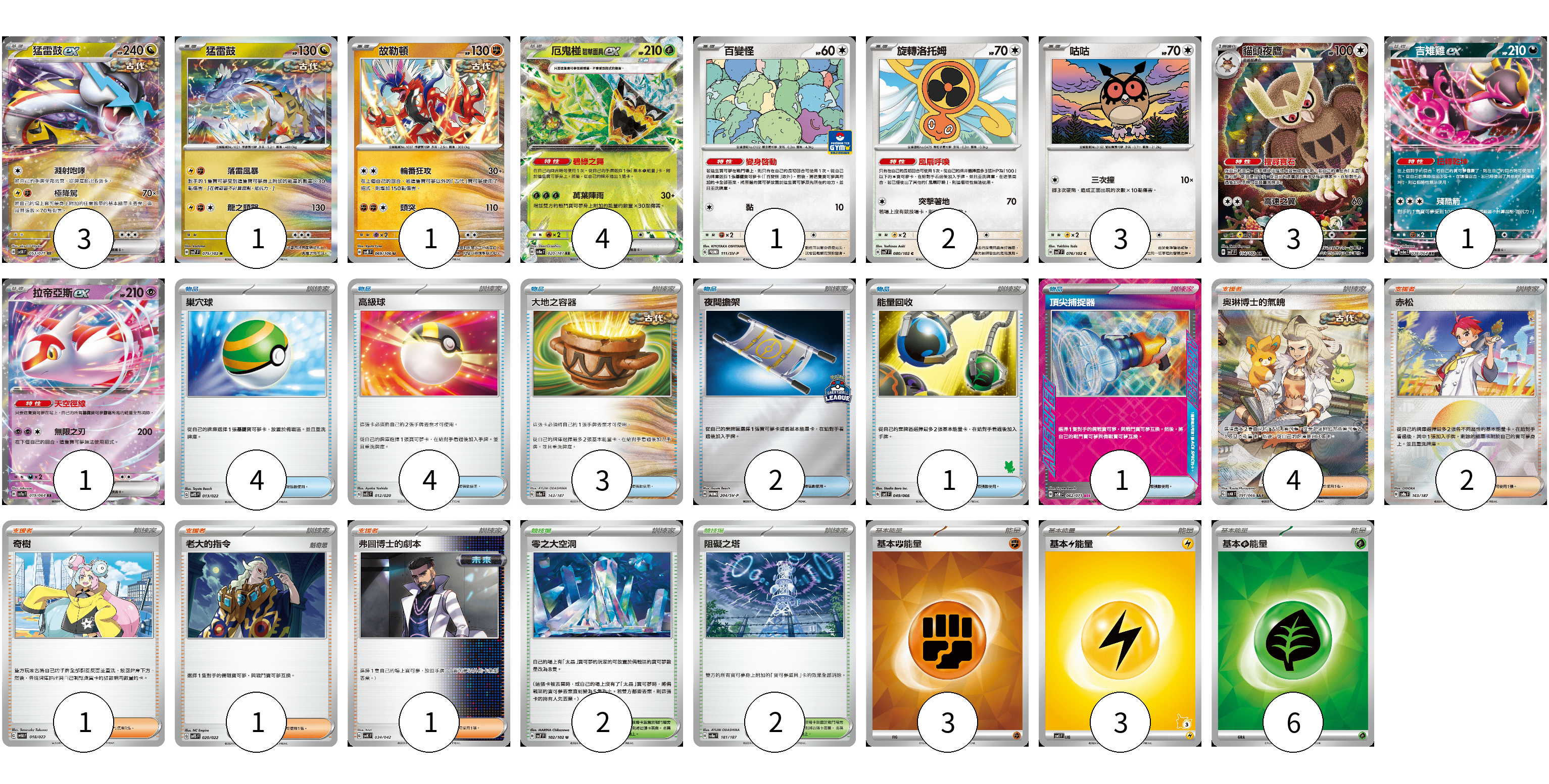牌組構築方案 以此牌組為基礎新構築牌組 顯示卡面 顯示列表 寶可夢卡(20) 3 1 1 4 1 2 3 3 1 1 物品卡(15) 4 4 3 2 1 1 支援者卡(9) 4 2 1 1 1 競技場卡(4) 2 2 能量卡(12) 3 3 6 寶可夢卡(20) 卡牌名稱 張數 卡牌名稱 張數 猛雷鼓ex SV5K 053/071 03 猛雷鼓 SV7 075/102 01 故勒頓 SV8 069/106 01 厄鬼椪 碧草面具ex SV8a 020/187 04 百變怪 SV-P 111/SV-P 01 旋轉洛托姆 SV7 080/102 02 咕咕 SV7 076/102 03 貓頭夜鷹 SV7 114/102 03 吉雉雞ex SV6a 038/064 01 拉帝亞斯ex SV7a 019/064 01 物品卡(15) 卡牌名稱 張數 卡牌名稱 張數 巢穴球 SVTS 013/022 04 高級球 SVEL 012/020 04 大地之容器 SV8a 143/187 03 夜間擔架 SV-P 204/SV-P 02 能量回收 SVI 049/066 01 頂尖捕捉器 SV5M 062/071 01 支援者卡(9) 卡牌名稱 張數 卡牌名稱 張數 奧琳博士的氣魄 SV4K 091/066 04 赤松 SV8a 163/187 02 奇樹 SVHM 018/022 01 老大的指令 SVTS 020/022 01 弗圖博士的劇本 SVK 034/042 01 競技場卡(4) 卡牌名稱 張數 卡牌名稱 張數 零之大空洞 SV7 102/102 02 阻礙之塔 SV8a 181/187 02 能量卡(12) 卡牌名稱 張數 卡牌名稱 張數 基本【鬥】能量 SVK FIG 03 基本【雷】能量 SVI LIG 03 基本【草】能量 SVK GRA 06 以此牌組為基礎新構築牌組 牌組編碼 rpiYLz-Ayrfmt-nRParf copy 列印牌組單 牌組編碼已複製 分享至SNS