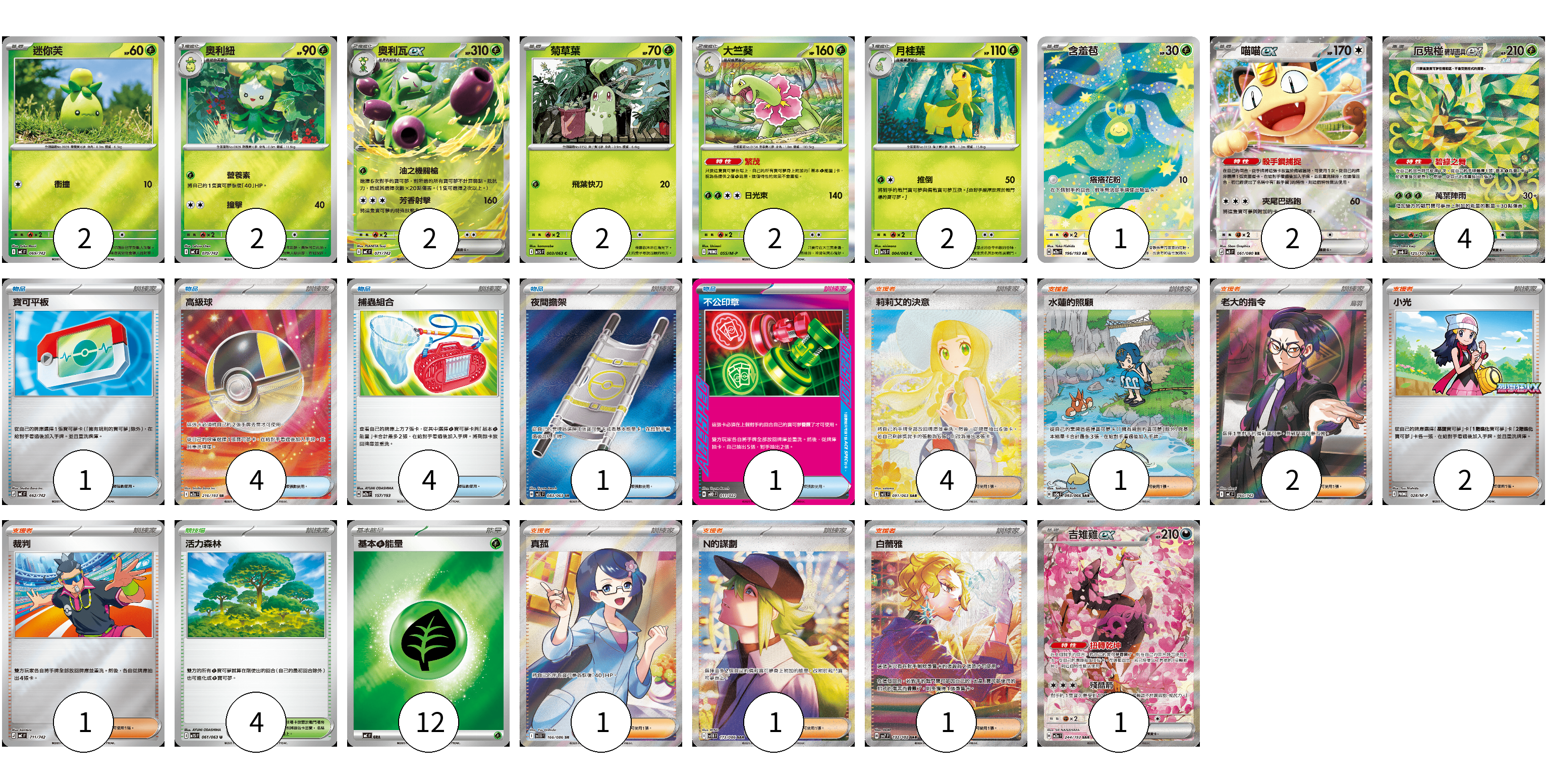 牌組構築方案 以此牌組為基礎新構築牌組 顯示卡面 顯示列表 寶可夢卡(20) 2 2 2 2 2 2 1 2 4 1 物品卡(11) 1 4 4 1 1 支援者卡(13) 4 1 2 2 1 1 1 1 競技場卡(4) 4 能量卡(12) 12 寶可夢卡(20) 卡牌名稱 張數 卡牌名稱 張數 迷你芙 MC 069/742 02 奧利紐 MC 070/742 02 奧利瓦ex MC 071/742 02 菊草葉 M1S 003/063 02 大竺葵 M-P 055/M-P 02 月桂葉 M1S 004/063 02 含羞苞 M2a 196/193 01 喵喵ex M3 061/080 02 厄鬼椪 碧草面具ex SV6 125/101 04 吉雉雞ex M2a 244/193 01 物品卡(11) 卡牌名稱 張數 卡牌名稱 張數 寶可平板 MC 662/742 01 高級球 M2a 216/193 04 捕蟲組合 M2a 157/193 04 夜間擔架 M1L 083/063 01 不公印章 MBD 011/022 01 支援者卡(13) 卡牌名稱 張數 卡牌名稱 張數 莉莉艾的決意 M1L 091/063 04 水蓮的照顧 SV5a 093/066 01 老大的指令(烏羽) MC 760/742 02 小光 M-P 028/M-P 02 裁判 MC 711/742 01 真菰 SV11B 166/086 01 N的謀劃 SV11B 173/086 01 白蕾雅 SV7 132/102 01 競技場卡(4) 卡牌名稱 張數 卡牌名稱 張數 活力森林 M1S 061/063 04 能量卡(12) 卡牌名稱 張數 卡牌名稱 張數 基本【草】能量 MC GRA 12 以此牌組為基礎新構築牌組 牌組編碼 rrNElL-VkOYzr-pmgqIj copy 列印牌組單 牌組編碼已複製 分享至SNS