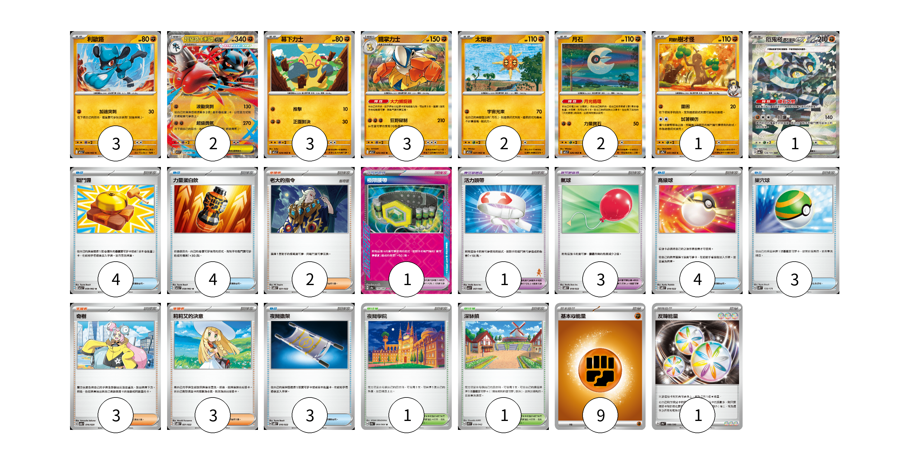 牌組構築方案 以此牌組為基礎新構築牌組 顯示卡面 顯示列表 寶可夢卡(17) 3 2 3 3 2 2 1 1 寶可夢道具(5) 1 1 3 物品卡(18) 4 4 4 3 3 支援者卡(8) 2 3 3 競技場卡(2) 1 1 能量卡(10) 9 1 寶可夢卡(17) 卡牌名稱 張數 卡牌名稱 張數 利歐路 M1L 028/063 03 超級路卡利歐ex M1L 029/063 02 幕下力士 M1L 024/063 03 鐵掌力士 M1L 025/063 03 太陽岩 M1L 027/063 02 月石 M1L 026/063 02 <阿響的>樹才怪 SV9a 041/063 01 厄鬼椪 礎石面具ex SV6 128/101 01 寶可夢道具(5) 卡牌名稱 張數 卡牌名稱 張數 極限腰帶 SV8a 159/187 01 活力頭帶 SVI 057/066 01 氣球 MBD 018/022 03 物品卡(18) 卡牌名稱 張數 卡牌名稱 張數 戰鬥鑼 M1L 059/063 04 力量蛋白飲 M1L 058/063 04 高級球 MBD 014/022 04 巢穴球 SVM 133/175 03 夜間擔架 MBD 016/022 03 支援者卡(8) 卡牌名稱 張數 卡牌名稱 張數 老大的指令 MBG 021/022 02 奇樹 SVOD 016/020 03 莉莉艾的決意 MBD 021/022 03 競技場卡(2) 卡牌名稱 張數 卡牌名稱 張數 夜間學院 SV6a 064/064 01 深缽鎮 SVK 039/042 01 能量卡(10) 卡牌名稱 張數 卡牌名稱 張數 基本【鬥】能量 M-P FIG 09 反轉能量 SV4a 189/190 01 以此牌組為基礎新構築牌組 牌組編碼 rvQrlw-uKzCbQ-BvQTLO copy 列印牌組單 牌組編碼已複製 分享至SNS