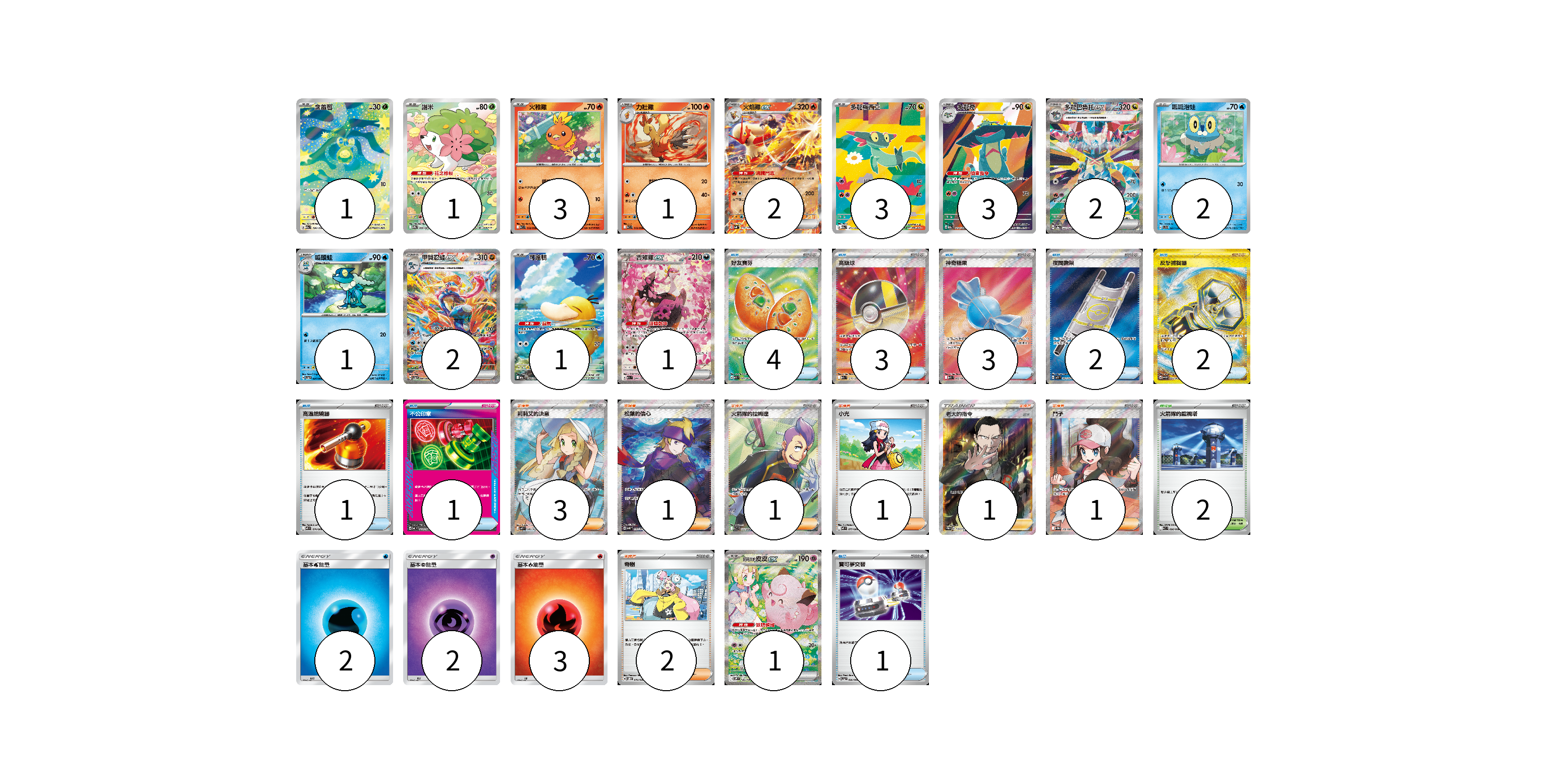 牌組構築方案 以此牌組為基礎新構築牌組 顯示卡面 顯示列表 寶可夢卡(24) 1 1 3 1 2 3 3 2 2 1 2 1 1 1 物品卡(17) 4 3 3 2 2 1 1 1 支援者卡(10) 3 1 1 1 1 1 2 競技場卡(2) 2 能量卡(7) 2 2 3 寶可夢卡(24) 卡牌名稱 張數 卡牌名稱 張數 含羞苞 M2a 196/193 01 謝米 SV9a 066/063 01 火稚雞 SV10 018/098 03 力壯雞 SV10 019/098 01 火焰雞ex SVM 016/175 02 多龍梅西亞 M2a 211/193 03 多龍奇 M2a 212/193 03 多龍巴魯托ex SV8a 221/187 02 呱呱泡蛙 SVD 027/139 02 呱頭蛙 SV5a 024/066 01 甲賀忍蛙ex SV5a 090/066 02 可達鴨 M2a 199/193 01 吉雉雞ex M2a 244/193 01 莉莉艾的皮皮ex SV9 126/100 01 物品卡(17) 卡牌名稱 張數 卡牌名稱 張數 好友寶芬 M1S 081/063 04 高級球 M2a 216/193 03 神奇糖果 M1S 082/063 03 夜間擔架 M1L 083/063 02 反擊捕捉器 SV4M 094/066 02 高溫燃燒器 M2 074/080 01 不公印章 MC 633/742 01 寶可夢交替 SV5a 056/066 01 支援者卡(10) 卡牌名稱 張數 卡牌名稱 張數 莉莉艾的決意 M1L 086/063 03 松葉的信心 SV5K 092/071 01 火箭隊的拉姆達 SV10 122/098 01 小光 M2 077/080 01 老大的指令(坂木) SC1b 170/153 01 鬥子 SV11W 166/086 01 奇樹 SVOD 016/020 02 競技場卡(2) 卡牌名稱 張數 卡牌名稱 張數 火箭隊的監視塔 SV10 096/098 02 能量卡(7) 卡牌名稱 張數 卡牌名稱 張數 基本水能量 AS6D WAT 02 基本超能量 AS6D PSY 02 基本火能量 AS6D FIR 03 以此牌組為基礎新構築牌組 牌組編碼 rvWIhJ-QplLUI-tlIWzR copy 列印牌組單 牌組編碼已複製 分享至SNS