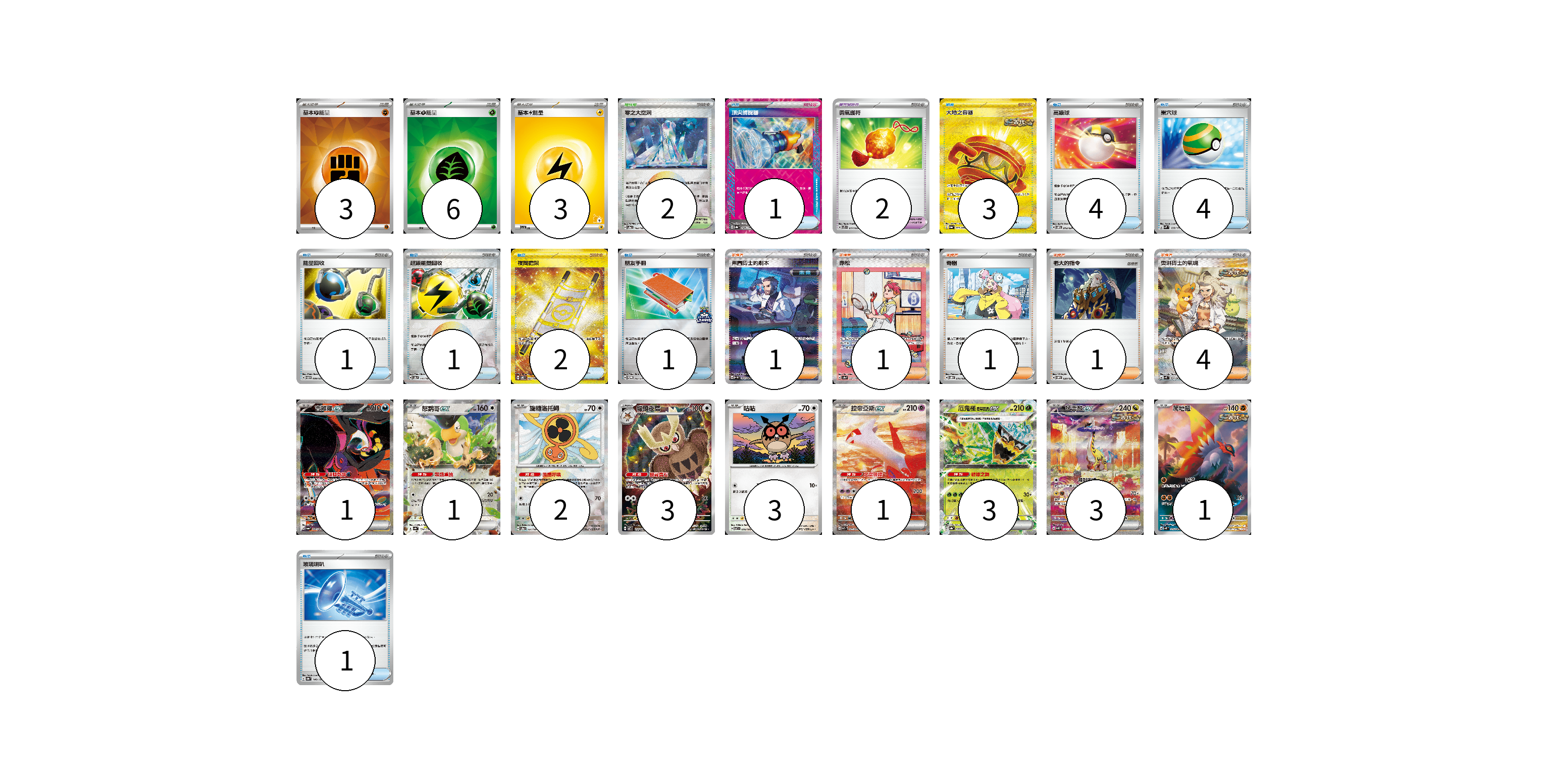 牌組構築方案 以此牌組為基礎新構築牌組 顯示卡面 顯示列表 寶可夢卡(18) 1 1 2 3 3 1 3 3 1 寶可夢道具(2) 2 物品卡(18) 1 3 4 4 1 1 2 1 1 支援者卡(8) 1 1 1 1 4 競技場卡(2) 2 能量卡(12) 3 6 3 寶可夢卡(18) 卡牌名稱 張數 卡牌名稱 張數 吉雉雞ex SV6a 089/064 01 怒鸚哥ex SV4a 154/190 01 旋轉洛托姆 SV8a 131/187 02 貓頭夜鷹 SV7 114/102 03 咕咕 SV7 076/102 03 拉帝亞斯ex SV7a 087/064 01 厄鬼椪 碧草面具ex SV8a 020/187 03 猛雷鼓ex SV5K 095/071 03 爬地翅 SV4K 074/066 01 寶可夢道具(2) 卡牌名稱 張數 卡牌名稱 張數 勇氣護符 SVTS 017/022 02 物品卡(18) 卡牌名稱 張數 卡牌名稱 張數 頂尖捕捉器 SV8a 148/187 01 大地之容器 SV6a 093/064 03 高級球 SVOM 013/021 04 巢穴球 SVM 133/175 04 能量回收 SVTM 009/022 01 超級能量回收 SV8a 141/187 01 夜間擔架 SV8 137/106 02 朋友手冊 SV-P 182/SV-P 01 玻璃喇叭 SV8a 140/187 01 支援者卡(8) 卡牌名稱 張數 卡牌名稱 張數 弗圖博士的劇本 SV4M 091/066 01 赤松 SV8a 227/187 01 奇樹 SVOD 016/020 01 老大的指令 SVOM 020/021 01 奧琳博士的氣魄 SV4K 091/066 04 競技場卡(2) 卡牌名稱 張數 卡牌名稱 張數 零之大空洞 SV8a 182/187 02 能量卡(12) 卡牌名稱 張數 卡牌名稱 張數 基本【鬥】能量 SVK FIG 03 基本【草】能量 SVK GRA 06 基本【雷】能量 SVI LIG 03 以此牌組為基礎新構築牌組 牌組編碼 rxNLLB-ocGxEo-JXSjew copy 列印牌組單 牌組編碼已複製 分享至SNS