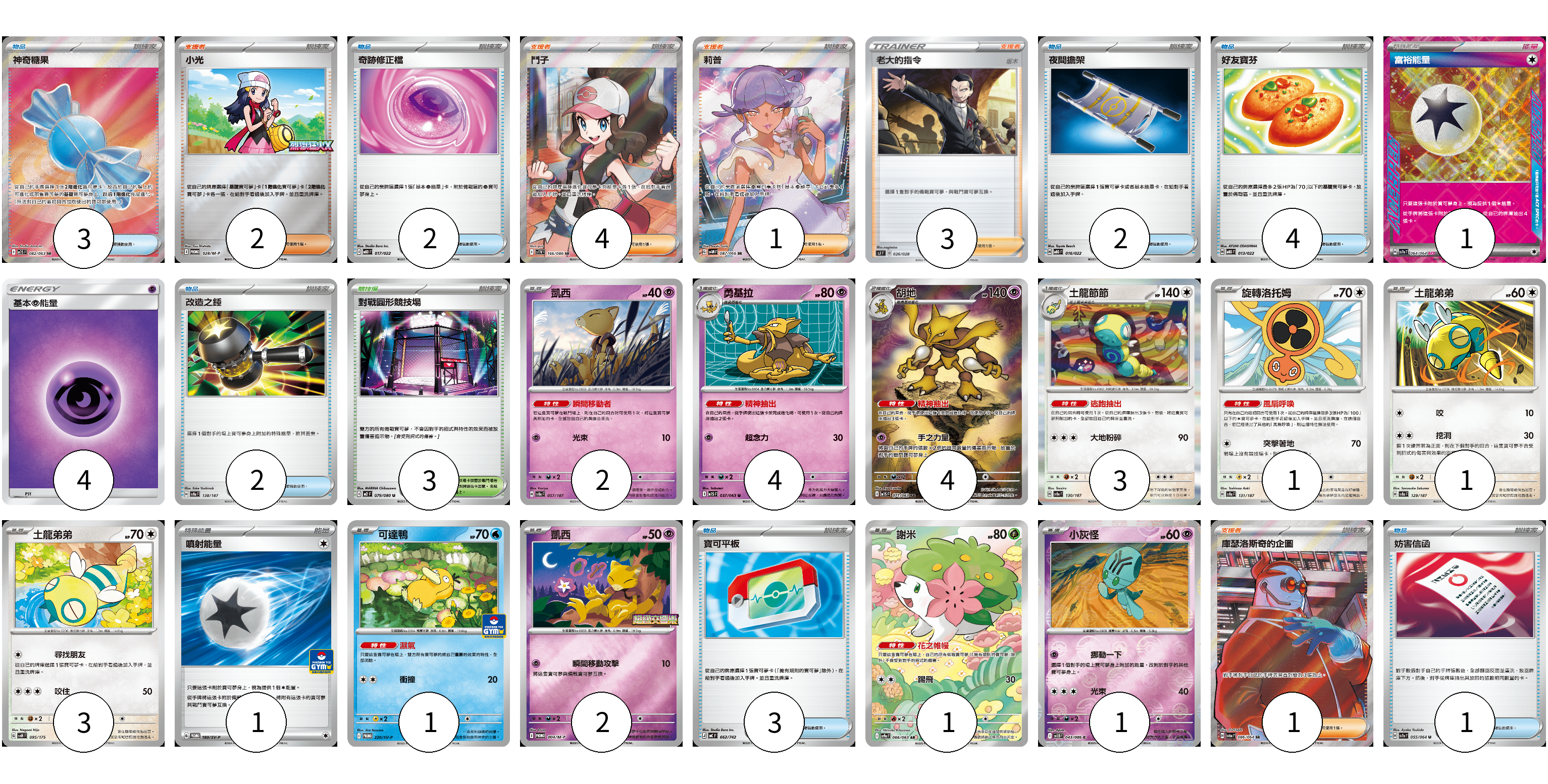 牌組構築方案 以此牌組為基礎新構築牌組 顯示卡面 顯示列表 寶可夢卡(23) 2 4 4 3 1 1 3 1 2 1 1 物品卡(17) 3 2 2 4 2 3 1 支援者卡(11) 2 4 1 3 1 競技場卡(3) 3 能量卡(6) 1 4 1 寶可夢卡(23) 卡牌名稱 張數 卡牌名稱 張數 凱西 SV8a 057/187 02 勇基拉 M1S 037/063 04 胡地 M1S 071/063 04 土龍節節 SV8a 130/187 03 旋轉洛托姆 SV8a 131/187 01 土龍弟弟 SV8a 129/187 01 土龍弟弟 SVM 095/175 03 可達鴨 SV-P 220/SV-P 01 凱西 M-P 004/M-P 02 謝米 SV9a 066/063 01 小灰怪 SV11B 043/086 01 物品卡(17) 卡牌名稱 張數 卡牌名稱 張數 神奇糖果 M1S 082/063 03 奇跡修正檔 MBD 017/022 02 夜間擔架 MBD 016/022 02 好友寶芬 MBD 013/022 04 改造之錘 SV8a 138/187 02 寶可平板 MC 662/742 03 妨害信函 SV7a 055/064 01 支援者卡(11) 卡牌名稱 張數 卡牌名稱 張數 小光 M-P 028/M-P 02 鬥子 SV11W 166/086 04 莉普 SV4M 087/066 01 老大的指令(坂木) SJ 026/028 03 庫瑟洛斯奇的企圖 SV6a 086/064 01 競技場卡(3) 卡牌名稱 張數 卡牌名稱 張數 對戰圓形競技場 M2 079/080 03 能量卡(6) 卡牌名稱 張數 卡牌名稱 張數 富裕能量 SV7a 064/064 01 基本超能量 AS6D PSY 04 噴射能量 SV-P 180/SV-P 01 以此牌組為基礎新構築牌組 牌組編碼 rzlube-vVIOKo-fJCjgF copy 列印牌組單 牌組編碼已複製 分享至SNS