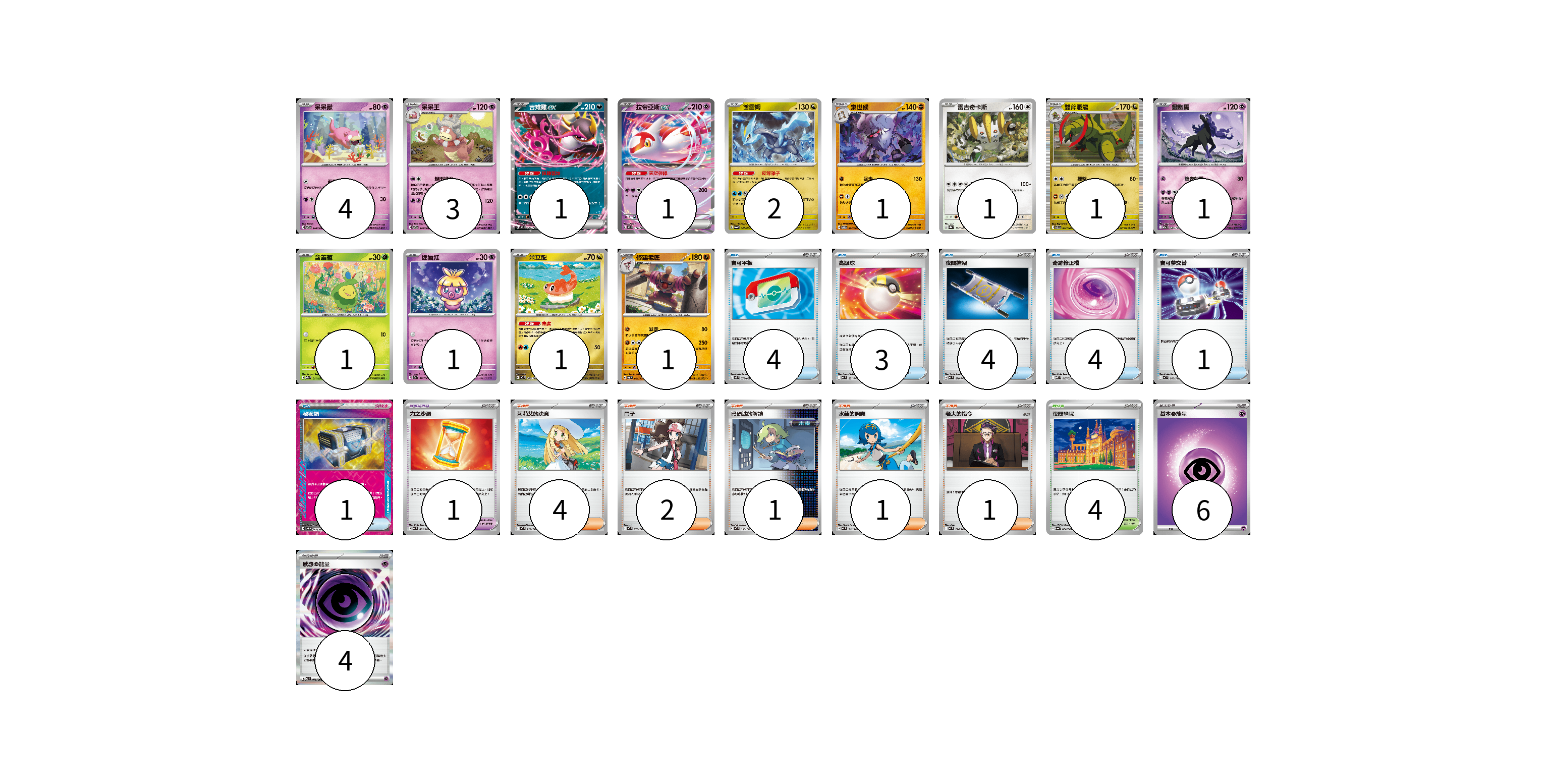 牌組構築方案 以此牌組為基礎新構築牌組 顯示卡面 顯示列表 寶可夢卡(19) 4 3 1 1 2 1 1 1 1 1 1 1 1 寶可夢道具(1) 1 物品卡(17) 4 3 4 4 1 1 支援者卡(9) 4 2 1 1 1 競技場卡(4) 4 能量卡(10) 6 4 寶可夢卡(19) 卡牌名稱 張數 卡牌名稱 張數 呆呆獸 SV7 038/102 04 呆呆王 SV7 039/102 03 吉雉雞ex MC 489/742 01 拉帝亞斯ex MC 312/742 01 酋雷姆 SV6a 047/064 02 棄世猴 SV8 062/106 01 雷吉奇卡斯 SV8a 132/187 01 雙斧戰龍 SV11B 072/086 01 靈幽馬 M2a 080/193 01 含羞苞 M2a 011/193 01 迷唇娃 SV7a 018/064 01 米立龍 MC 549/742 01 修建老匠 SV6 061/101 01 寶可夢道具(1) 卡牌名稱 張數 卡牌名稱 張數 力之沙漏 MC 683/742 01 物品卡(17) 卡牌名稱 張數 卡牌名稱 張數 寶可平板 M3 070/080 04 高級球 MC 651/742 03 夜間擔架 MC 670/742 04 奇跡修正檔 MBD 017/022 04 寶可夢交替 MC 663/742 01 秘密箱 SV6 092/101 01 支援者卡(9) 卡牌名稱 張數 卡牌名稱 張數 莉莉艾的決意 MC 729/742 04 鬥子 MC 718/742 02 暗碼迷的解讀 MC 698/742 01 水蓮的照顧 MC 712/742 01 老大的指令 MC 724/742 01 競技場卡(4) 卡牌名稱 張數 卡牌名稱 張數 夜間學院 SV6a 064/064 04 能量卡(10) 卡牌名稱 張數 卡牌名稱 張數 基本【超】能量 MC PSY 06 感應【超】能量 M3 079/080 04 以此牌組為基礎新構築牌組 牌組編碼 rzuBmz-qZvQBh-AsAvDB copy 列印牌組單 牌組編碼已複製 分享至SNS