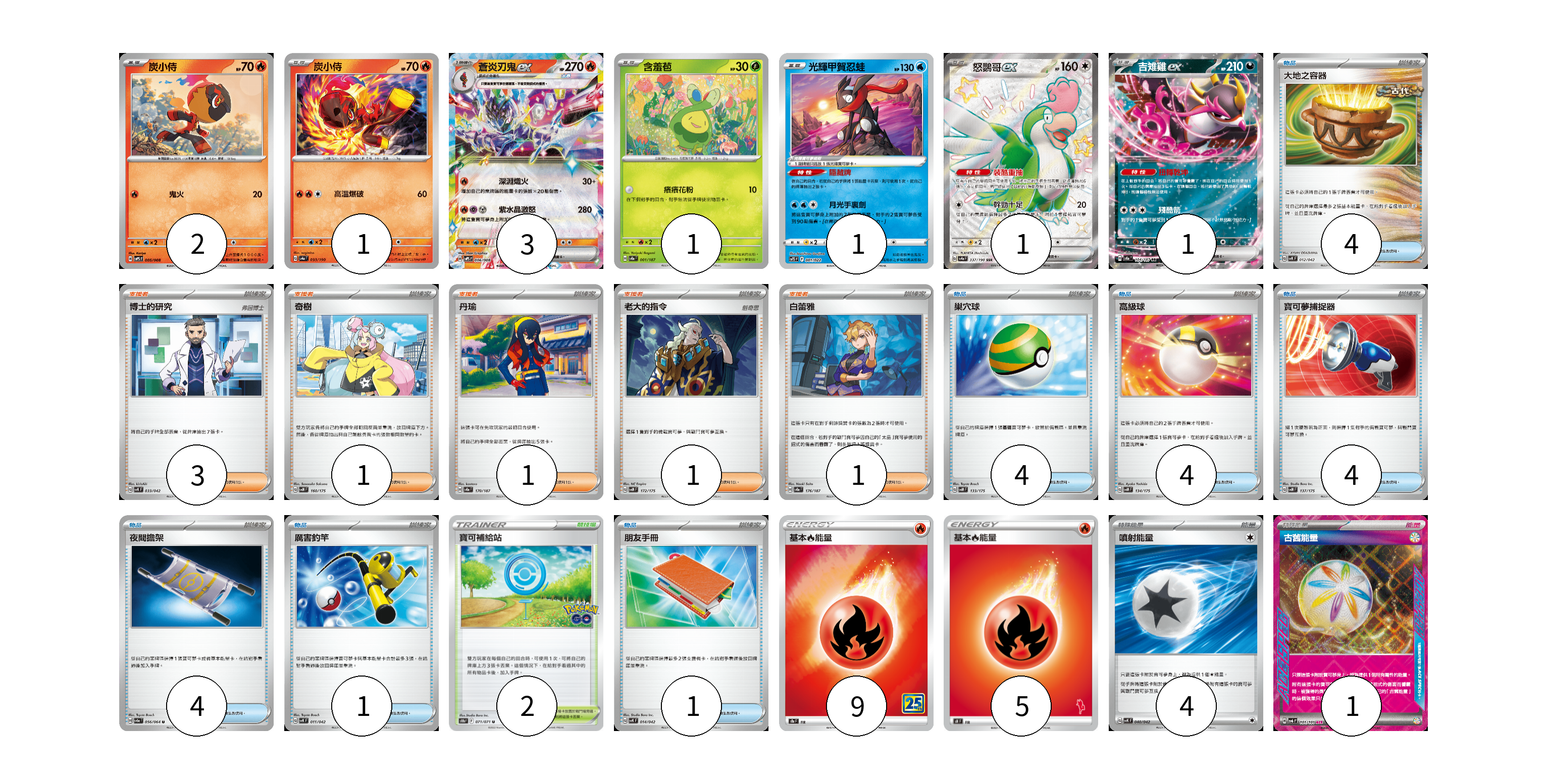牌組構築方案 以此牌組為基礎新構築牌組 顯示卡面 顯示列表 寶可夢卡(10) 2 1 3 1 1 1 1 物品卡(22) 4 4 4 4 4 1 1 支援者卡(7) 3 1 1 1 1 競技場卡(2) 2 能量卡(19) 9 5 4 1 寶可夢卡(10) 卡牌名稱 張數 卡牌名稱 張數 炭小侍 SVPS 005/008 02 炭小侍 SV4a 033/190 01 蒼炎刃鬼ex SVPS 006/008 03 含羞苞 SV8a 001/187 01 光輝甲賀忍蛙 SVTS 001/022 01 怒鸚哥ex SV4a 337/190 01 吉雉雞ex SV8a 104/187 01 物品卡(22) 卡牌名稱 張數 卡牌名稱 張數 大地之容器 SVK 012/042 04 巢穴球 SVM 133/175 04 高級球 SVM 134/175 04 寶可夢捕捉器 SVM 137/175 04 夜間擔架 SV6a 056/064 04 厲害釣竿 SVK 011/042 01 朋友手冊 SVK 014/042 01 支援者卡(7) 卡牌名稱 張數 卡牌名稱 張數 博士的研究 SVK 033/042 03 奇樹 SVM 160/175 01 丹瑜 SV8a 170/187 01 老大的指令 SVM 172/175 01 白蕾雅 SV8a 176/187 01 競技場卡(2) 卡牌名稱 張數 卡牌名稱 張數 寶可補給站 S10b 071/071 02 能量卡(19) 卡牌名稱 張數 卡牌名稱 張數 基本火能量 S8a FIR 09 基本火能量 SH FIR 05 噴射能量 SVK 040/042 04 古舊能量 SV6 101/101 01 以此牌組為基礎新構築牌組 牌組編碼 sAnLMn-wSRbXF-RDrlYW copy 列印牌組單 牌組編碼已複製 分享至SNS