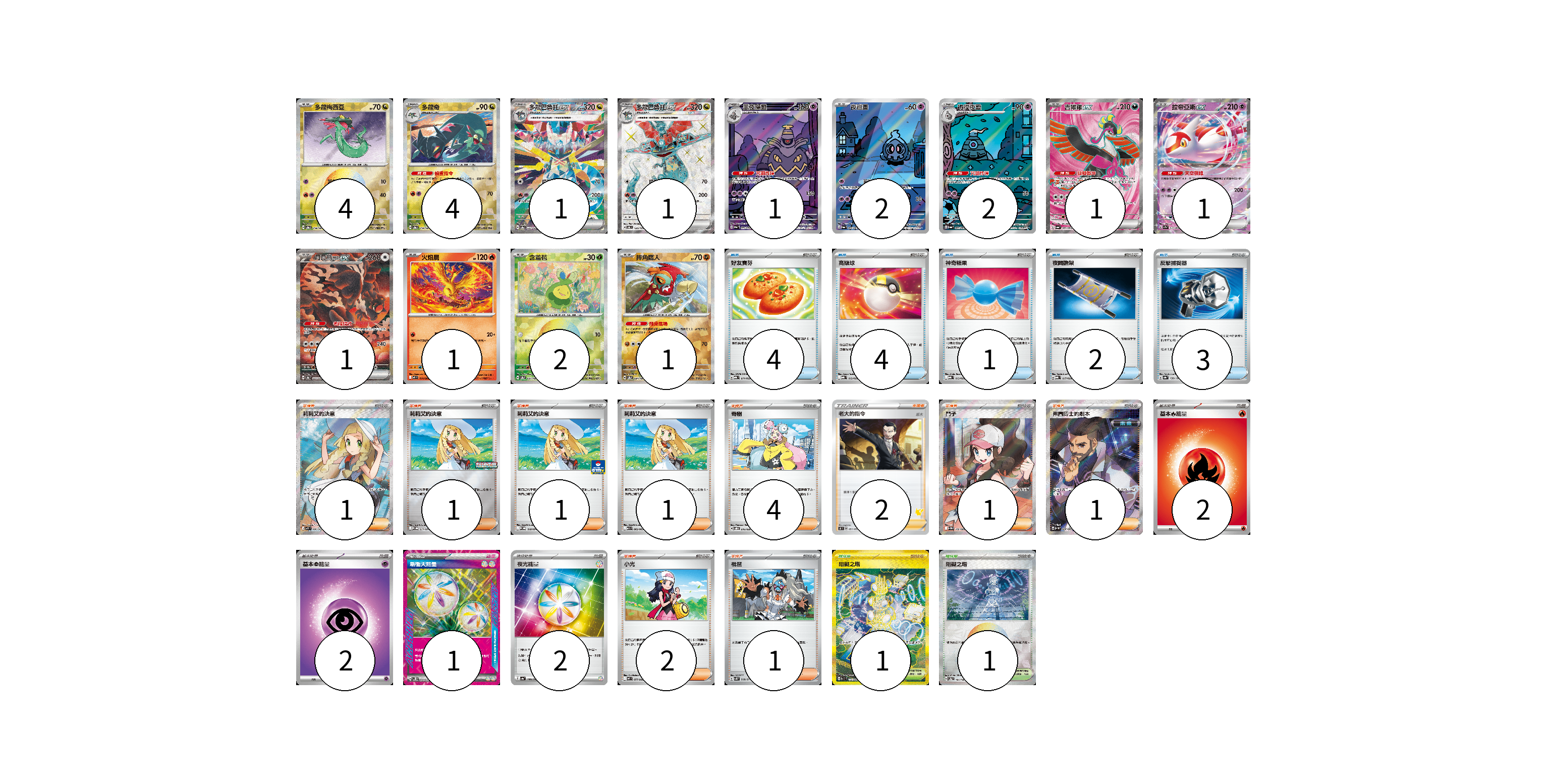 牌組構築方案 以此牌組為基礎新構築牌組 顯示卡面 顯示列表 寶可夢卡(22) 4 4 1 1 1 2 2 1 1 1 1 2 1 物品卡(14) 4 4 1 2 3 支援者卡(15) 1 1 1 1 4 2 1 1 2 1 競技場卡(2) 1 1 能量卡(7) 2 2 1 2 寶可夢卡(22) 卡牌名稱 張數 卡牌名稱 張數 多龍梅西亞 SV8a 118/187 04 多龍奇 SV8a 119/187 04 多龍巴魯托ex SV8a 221/187 01 多龍巴魯托ex SV6 120/101 01 黑夜魔靈 SV6a 070/064 01 夜巡靈 SV6a 068/064 02 彷徨夜靈 SV6a 069/064 02 吉雉雞ex SV6a 081/064 01 拉帝亞斯ex SV7a 019/064 01 月月熊 赫月ex SV8a 225/187 01 火焰鳥 M2 014/080 01 含羞苞 SV8a 001/187 02 摔角鷹人 SV8a 084/187 01 物品卡(14) 卡牌名稱 張數 卡牌名稱 張數 好友寶芬 MBG 011/022 04 高級球 MBG 012/022 04 神奇糖果 MBG 013/022 01 夜間擔架 MBG 017/022 02 反擊捕捉器 SV8a 139/187 03 支援者卡(15) 卡牌名稱 張數 卡牌名稱 張數 莉莉艾的決意 M1L 086/063 01 莉莉艾的決意 M-P 011/M-P 01 莉莉艾的決意 M-P 018/M-P 01 莉莉艾的決意 M1L 062/063 01 奇樹 SVOD 016/020 04 老大的指令(坂木) SH 051/053 02 鬥子 SV11W 166/086 01 弗圖博士的劇本 SV4M 086/066 01 小光 M2 077/080 02 枇琶 SV5K 068/071 01 競技場卡(2) 卡牌名稱 張數 卡牌名稱 張數 阻礙之塔 SV10 132/098 01 阻礙之塔 SV8a 181/187 01 能量卡(7) 卡牌名稱 張數 卡牌名稱 張數 基本【火】能量 M-P FIR 02 基本【超】能量 MBD PSY 02 新衝天能量 SV5K 071/071 01 夜光能量 SV4a 190/190 02 以此牌組為基礎新構築牌組 牌組編碼 sBDdcJ-kCmRNY-iXapMc copy 列印牌組單 牌組編碼已複製 分享至SNS