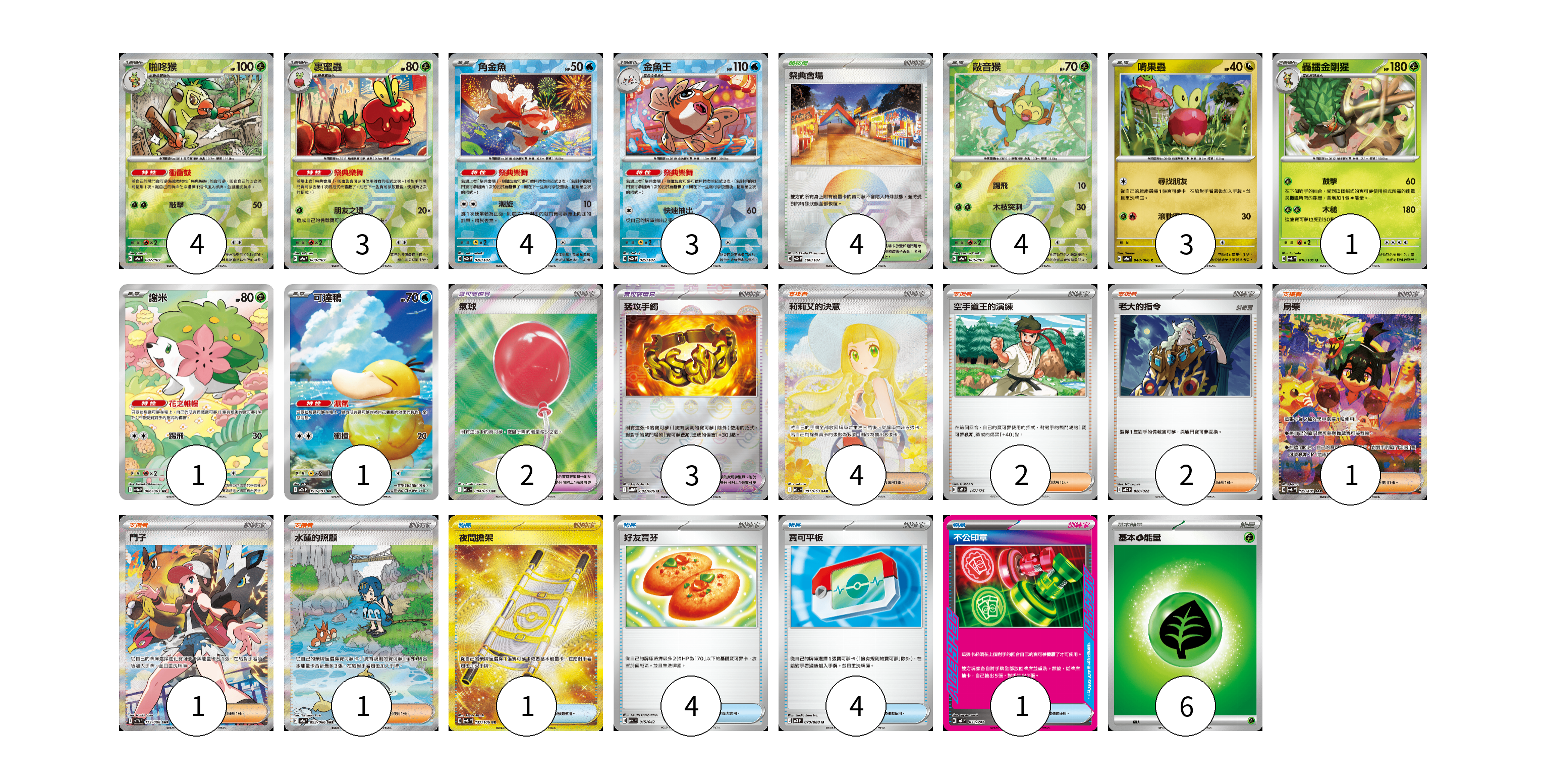 牌組構築方案 以此牌組為基礎新構築牌組 顯示卡面 顯示列表 寶可夢卡(24) 4 3 4 3 4 3 1 1 1 寶可夢道具(5) 2 3 物品卡(10) 1 4 4 1 支援者卡(11) 4 2 2 1 1 1 競技場卡(4) 4 能量卡(6) 6 寶可夢卡(24) 卡牌名稱 張數 卡牌名稱 張數 啪咚猴 SV8a 007/187 04 裹蜜蟲 SV8a 009/187 03 角金魚 SV8a 028/187 04 金魚王 SV8a 029/187 03 敲音猴 SV8a 006/187 04 啃果蟲 SV5a 048/066 03 轟擂金剛猩 SV6 010/101 01 謝米 SV9a 066/063 01 可達鴨 M2a 199/193 01 寶可夢道具(5) 卡牌名稱 張數 卡牌名稱 張數 氣球 M1L 084/063 02 猛攻手鐲 SV11W 082/086 03 物品卡(10) 卡牌名稱 張數 卡牌名稱 張數 夜間擔架 SV8 137/106 01 好友寶芬 SVK 015/042 04 寶可平板 M3 070/080 04 不公印章 MC 633/742 01 支援者卡(11) 卡牌名稱 張數 卡牌名稱 張數 莉莉艾的決意 M1L 091/063 04 空手道王的演練 SVM 147/175 02 老大的指令 MBD 020/022 02 烏栗 SV6 129/101 01 鬥子 SV11W 173/086 01 水蓮的照顧 SV5a 093/066 01 競技場卡(4) 卡牌名稱 張數 卡牌名稱 張數 祭典會場 SV8a 180/187 04 能量卡(6) 卡牌名稱 張數 卡牌名稱 張數 基本【草】能量 MC GRA 06 以此牌組為基礎新構築牌組 牌組編碼 sCNIkg-AwfciX-LUEQKu copy 列印牌組單 牌組編碼已複製 分享至SNS