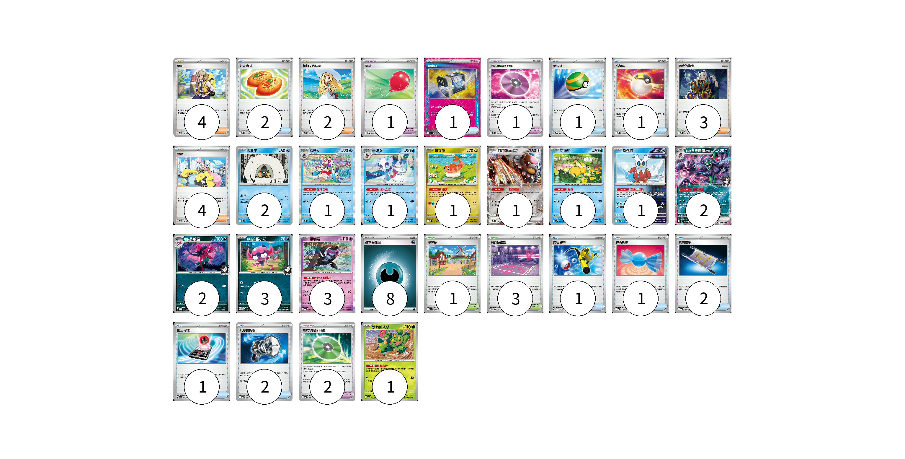 牌組構築方案 以此牌組為基礎新構築牌組 顯示卡面 顯示列表 寶可夢卡(19) 2 1 1 1 1 1 1 2 2 3 3 1 寶可夢道具(4) 1 1 2 物品卡(12) 2 1 1 1 1 1 2 1 2 支援者卡(13) 4 2 3 4 競技場卡(4) 1 3 能量卡(8) 8 寶可夢卡(19) 卡牌名稱 張數 卡牌名稱 張數 雪童子 SV8a 037/187 02 雪妖女 SV8a 038/187 01 雪妖女 SV6 033/101 01 米立龍 MBD 010/022 01 月月熊 赫月ex SV8a 134/187 01 可達鴨 M2a 032/193 01 鐵包袱 SV8a 047/187 01 <瑪俐的>長毛巨魔ex SVOM 007/021 02 <瑪俐的>詐唬魔 SVOM 006/021 02 <瑪俐的>搗蛋小妖 SVOM 005/021 03 願增猿 M2a 081/193 03 沙鈴仙人掌 SV9 006/100 01 寶可夢道具(4) 卡牌名稱 張數 卡牌名稱 張數 氣球 MBD 018/022 01 招式學習器 衰退 SV8a 161/187 01 招式學習器 演進 SV8a 160/187 02 物品卡(12) 卡牌名稱 張數 卡牌名稱 張數 好友寶芬 M2a 153/193 02 秘密箱 SV6 092/101 01 巢穴球 SVM 133/175 01 高級球 MBG 012/022 01 厲害釣竿 SVOD 010/020 01 神奇糖果 MBG 013/022 01 夜間擔架 M2a 159/193 02 能量輸送 SVM 128/175 01 反擊捕捉器 SV8a 139/187 02 支援者卡(13) 卡牌名稱 張數 卡牌名稱 張數 派帕 SVOD 018/020 04 莉莉艾的決意 M2a 175/193 02 老大的指令 MBD 020/022 03 奇樹 SVOD 016/020 04 競技場卡(4) 卡牌名稱 張數 卡牌名稱 張數 深缽鎮 SVK 039/042 01 尖釘鎮道館 SVOM 021/021 03 能量卡(8) 卡牌名稱 張數 卡牌名稱 張數 基本【惡】能量 MBG DAR 08 以此牌組為基礎新構築牌組 牌組編碼 sDVire-QkcwQC-LRIPQz copy 列印牌組單 牌組編碼已複製 分享至SNS