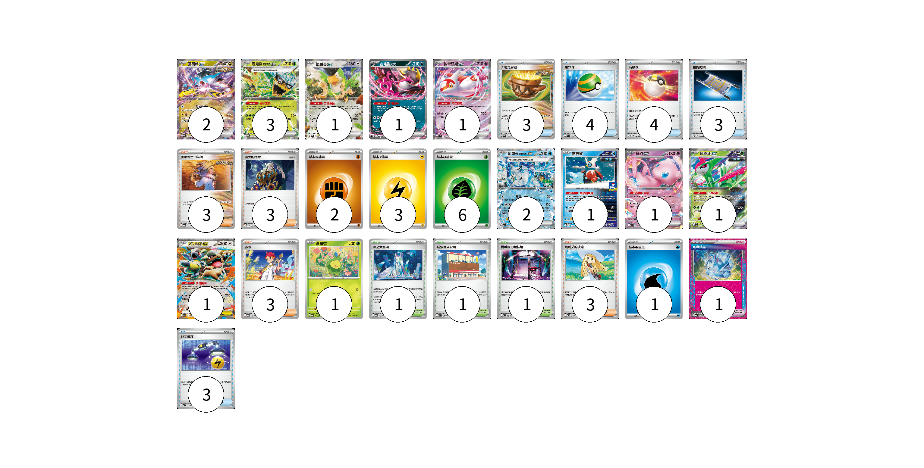 牌組構築方案 以此牌組為基礎新構築牌組 顯示卡面 顯示列表 寶可夢卡(15) 2 3 1 1 1 2 1 1 1 1 1 寶可夢道具(1) 1 物品卡(17) 3 4 4 3 3 支援者卡(12) 3 3 3 3 競技場卡(3) 1 1 1 能量卡(12) 2 3 6 1 寶可夢卡(15) 卡牌名稱 張數 卡牌名稱 張數 猛雷鼓ex SV8a 124/187 02 厄鬼椪 碧草面具ex SV8a 020/187 03 怒鸚哥ex SV4a 154/190 01 吉雉雞ex SVOD 004/020 01 拉帝亞斯ex SV7a 019/064 01 厄鬼椪 水井面具ex SV8a 050/187 02 鐵包袱 SV-P 175/SV-P 01 夢幻ex SVK 001/042 01 鐵斑葉ex SV5M 016/071 01 超級袋獸ex M1S 051/063 01 含羞苞 SV8a 001/187 01 寶可夢道具(1) 卡牌名稱 張數 卡牌名稱 張數 璀璨結晶 SV8a 152/187 01 物品卡(17) 卡牌名稱 張數 卡牌名稱 張數 大地之容器 SV8a 143/187 03 巢穴球 SVM 133/175 04 高級球 SVOD 012/020 04 夜間擔架 SVOM 016/021 03 能量轉移 SVM 127/175 03 支援者卡(12) 卡牌名稱 張數 卡牌名稱 張數 奧琳博士的氣魄 SV8a 167/187 03 老大的指令 SVOM 020/021 03 赤松 SV8a 163/187 03 莉莉艾的決意 MBD 021/022 03 競技場卡(3) 卡牌名稱 張數 卡牌名稱 張數 零之大空洞 SV8a 182/187 01 城鎮百貨公司 SVK 037/042 01 對戰圓形競技場 M2 079/080 01 能量卡(12) 卡牌名稱 張數 卡牌名稱 張數 基本【鬥】能量 SVF FIG 02 基本【雷】能量 SVF LIG 03 基本【草】能量 SVF GRA 06 基本水能量 sv-p WAT 01 以此牌組為基礎新構築牌組 牌組編碼 sGhyiP-lGRypO-tOTILd copy 列印牌組單 牌組編碼已複製 分享至SNS