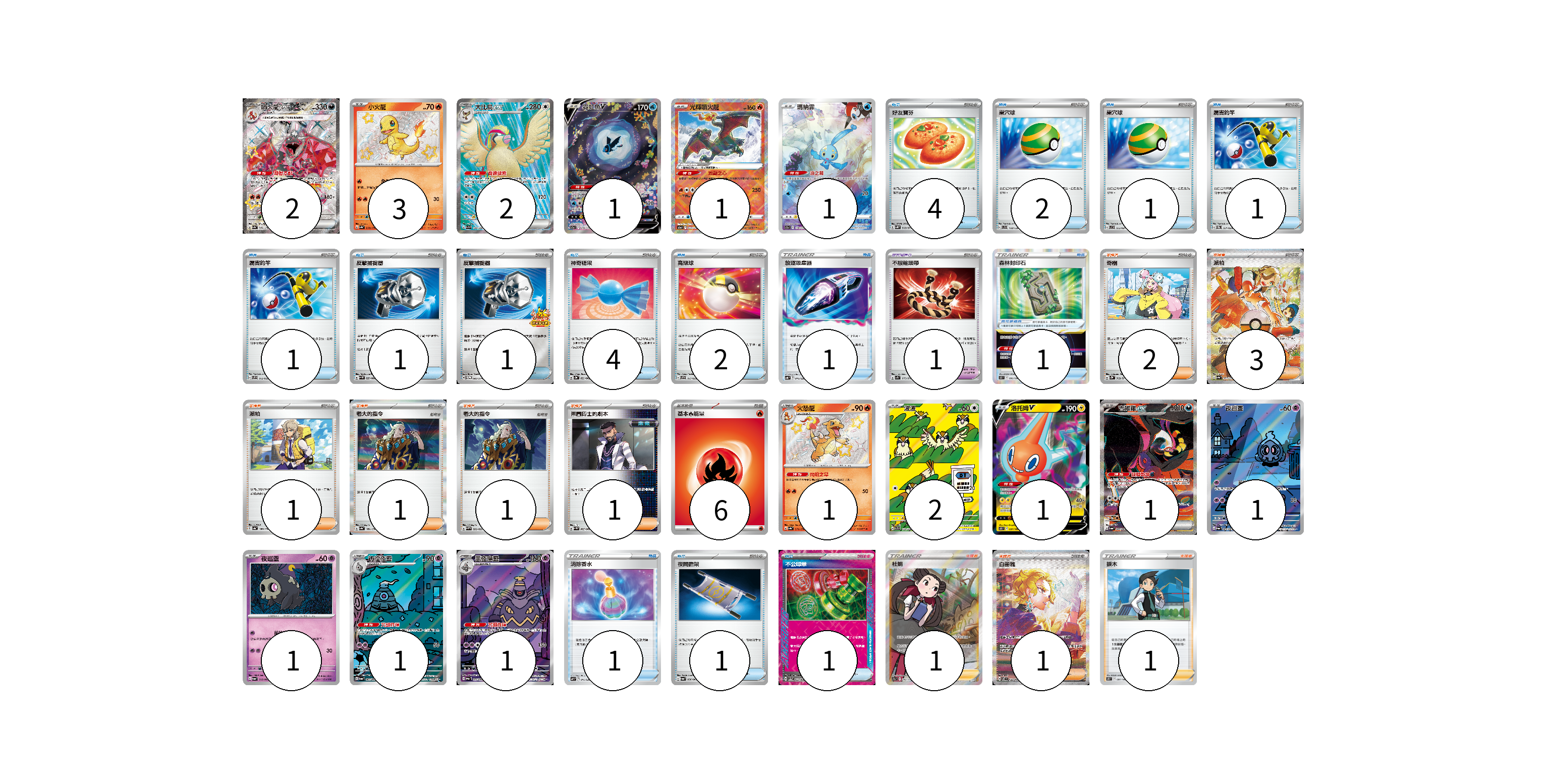 牌組構築方案 以此牌組為基礎新構築牌組 顯示卡面 顯示列表 寶可夢卡(19) 2 3 2 1 1 1 1 2 1 1 1 1 1 1 寶可夢道具(2) 1 1 物品卡(21) 4 2 1 1 1 1 1 4 2 1 1 1 1 支援者卡(12) 2 3 1 1 1 1 1 1 1 能量卡(6) 6 寶可夢卡(19) 卡牌名稱 張數 卡牌名稱 張數 噴火龍ex SV4a 331/190 02 小火龍 SV4a 210/190 03 大比鳥ex SV3 128/108 02 霓虹魚V S12a 216/172 01 光輝噴火龍 S12a 015/172 01 瑪納霏 S12a 178/172 01 火恐龍 SV4a 211/190 01 波波 SV3 118/108 02 洛托姆V S11 037/100 01 吉雉雞ex SV6a 089/064 01 夜巡靈 SV6a 068/064 01 夜巡靈 SV6a 018/064 01 彷徨夜靈 SV6a 069/064 01 黑夜魔靈 SV6a 070/064 01 寶可夢道具(2) 卡牌名稱 張數 卡牌名稱 張數 不服輸頭帶 SV1S 073/078 01 森林封印石 S12 092/098 01 物品卡(21) 卡牌名稱 張數 卡牌名稱 張數 好友寶芬 SV5K 063/071 04 巢穴球 SVD 118/139 02 巢穴球 SVC 013/021 01 厲害釣竿 SVEM 011/020 01 厲害釣竿 SVF 013/038 01 反擊捕捉器 SV4M 059/066 01 反擊捕捉器 SV-P 083/SV-P 01 神奇糖果 SV3a 053/062 04 高級球 SVF 017/038 02 放逐吸塵器 SVB 016/028 01 消除香水 SVF 011/038 01 夜間擔架 SV6a 056/064 01 不公印章 SV5a 053/066 01 支援者卡(12) 卡牌名稱 張數 卡牌名稱 張數 奇樹 SV2D 069/071 02 派帕 SV4a 353/190 03 派帕 SV4a 180/190 01 老大的指令 SV4a 181/190 01 老大的指令 SVHM 022/022 01 弗圖博士的劇本 SV4M 065/066 01 杜娟 S12a 242/172 01 白蕾雅 SV7 132/102 01 捩木 S11 097/100 01 能量卡(6) 卡牌名稱 張數 卡牌名稱 張數 基本【火】能量 SVF FIR 06 以此牌組為基礎新構築牌組 牌組編碼 sHRGHd-fodoJP-NQDXcb copy 列印牌組單 牌組編碼已複製 分享至SNS