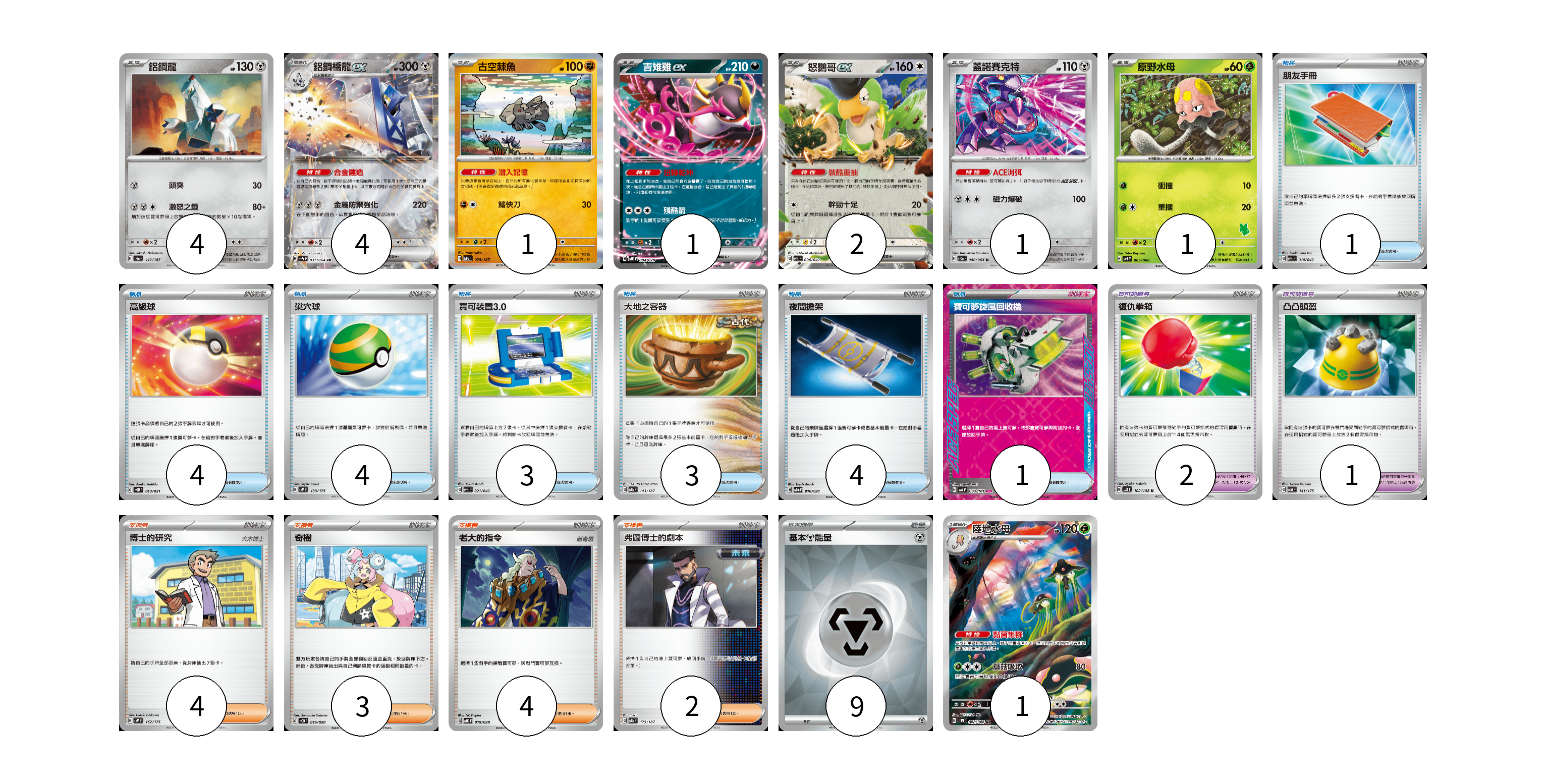 牌組構築方案 以此牌組為基礎新構築牌組 顯示卡面 顯示列表 寶可夢卡(15) 4 4 1 1 2 1 1 1 寶可夢道具(3) 2 1 物品卡(20) 1 4 4 3 3 4 1 支援者卡(13) 4 3 4 2 能量卡(9) 9 寶可夢卡(15) 卡牌名稱 張數 卡牌名稱 張數 鋁鋼龍 SV8a 112/187 04 鋁鋼橋龍ex SV7a 037/064 04 古空棘魚 SV8a 079/187 01 吉雉雞ex SVOD 004/020 01 怒鸚哥ex SVK 006/042 02 蓋諾賽克特 SV6a 040/064 01 原野水母 SVI 005/066 01 陸地水母 SV4M 068/066 01 寶可夢道具(3) 卡牌名稱 張數 卡牌名稱 張數 復仇拳箱 SV3 102/108 02 凸凸頭盔 SVM 141/175 01 物品卡(20) 卡牌名稱 張數 卡牌名稱 張數 朋友手冊 SVK 014/042 01 高級球 SVOM 013/021 04 巢穴球 SVM 133/175 04 寶可裝置3.0 SVK 021/042 03 大地之容器 SV8a 143/187 03 夜間擔架 SVOM 016/021 04 寶可夢旋風回收機 SV6 093/101 01 支援者卡(13) 卡牌名稱 張數 卡牌名稱 張數 博士的研究 SVM 162/175 04 奇樹 SVOD 016/020 03 老大的指令 SVOD 019/020 04 弗圖博士的劇本 SV8a 175/187 02 能量卡(9) 卡牌名稱 張數 卡牌名稱 張數 基本【鋼】能量 SVOD MET 09 以此牌組為基礎新構築牌組 牌組編碼 sLjDhN-kMPNNi-YqVfjv copy 列印牌組單 牌組編碼已複製 分享至SNS