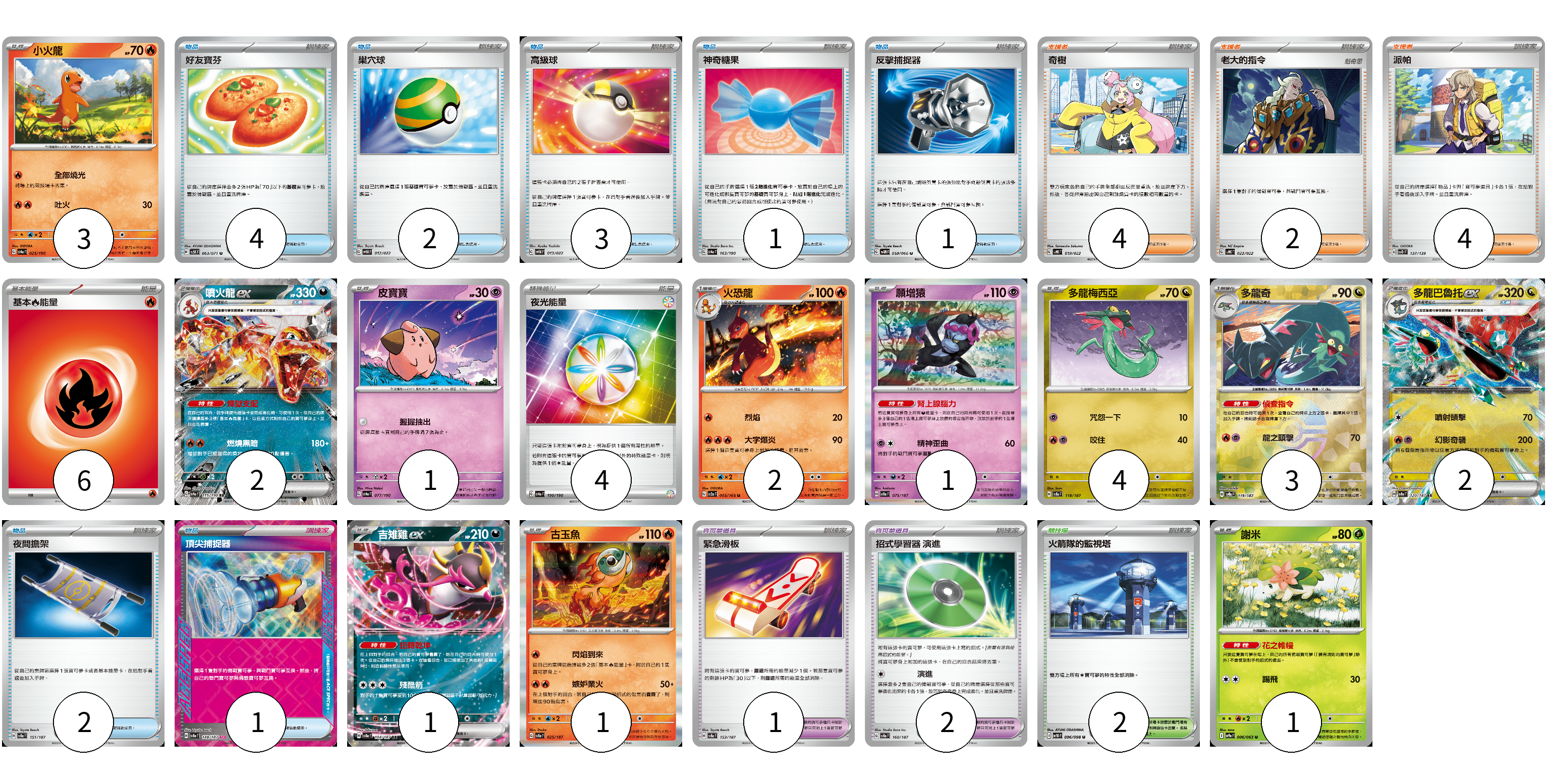 牌組構築方案 以此牌組為基礎新構築牌組 顯示卡面 顯示列表 寶可夢卡(21) 3 2 1 2 1 4 3 2 1 1 1 寶可夢道具(3) 1 2 物品卡(14) 4 2 3 1 1 2 1 支援者卡(10) 4 2 4 競技場卡(2) 2 能量卡(10) 6 4 寶可夢卡(21) 卡牌名稱 張數 卡牌名稱 張數 小火龍 SV4a 025/190 03 噴火龍ex SV4a 115/190 02 皮寶寶 SV4a 077/190 01 火恐龍 SV2a 005/165 02 願增猿 SV8a 075/187 01 多龍梅西亞 SV8a 118/187 04 多龍奇 SV8a 119/187 03 多龍巴魯托ex SV8a 120/187 02 吉雉雞ex SV8a 104/187 01 古玉魚 SV8a 025/187 01 謝米 SV9a 006/063 01 寶可夢道具(3) 卡牌名稱 張數 卡牌名稱 張數 緊急滑板 SV8a 153/187 01 招式學習器 演進 SV8a 160/187 02 物品卡(14) 卡牌名稱 張數 卡牌名稱 張數 好友寶芬 SV5K 063/071 04 巢穴球 SVHM 012/022 02 高級球 SVHM 013/022 03 神奇糖果 SV4a 163/190 01 反擊捕捉器 SV4M 059/066 01 夜間擔架 SV8a 151/187 02 頂尖捕捉器 SV8a 148/187 01 支援者卡(10) 卡牌名稱 張數 卡牌名稱 張數 奇樹 SVHK 019/022 04 老大的指令 SVHK 022/022 02 派帕 SVD 137/139 04 競技場卡(2) 卡牌名稱 張數 卡牌名稱 張數 火箭隊的監視塔 SV10 096/098 02 能量卡(10) 卡牌名稱 張數 卡牌名稱 張數 基本【火】能量 SVHK FIR 06 夜光能量 SV4a 190/190 04 以此牌組為基礎新構築牌組 牌組編碼 sLqnck-wpAIIK-LzENGl copy 列印牌組單 牌組編碼已複製 分享至SNS