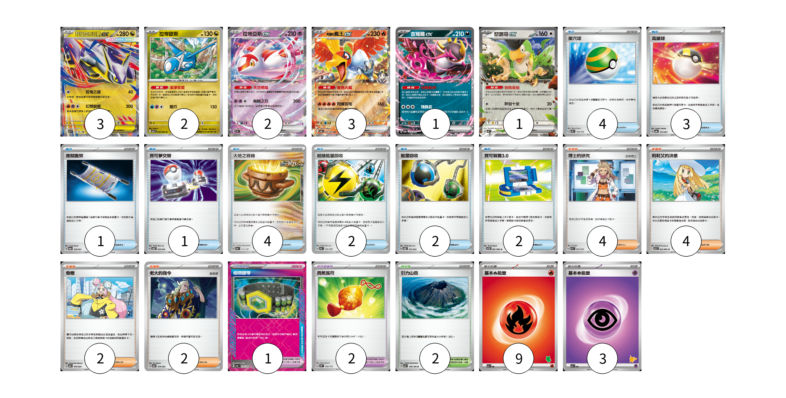 牌組構築方案 以此牌組為基礎新構築牌組 顯示卡面 顯示列表 寶可夢卡(12) 3 2 2 3 1 1 寶可夢道具(3) 1 2 物品卡(19) 4 3 1 1 4 2 2 2 支援者卡(12) 4 4 2 2 競技場卡(2) 2 能量卡(12) 9 3 寶可夢卡(12) 卡牌名稱 張數 卡牌名稱 張數 超級拉帝亞斯ex M1S 049/063 03 拉帝歐斯 M1S 050/063 02 拉帝亞斯ex SV7a 019/064 02 <阿響的>鳳王ex SV9a 020/063 03 吉雉雞ex SVOD 004/020 01 怒鸚哥ex SVK 006/042 01 寶可夢道具(3) 卡牌名稱 張數 卡牌名稱 張數 極限腰帶 SV8a 159/187 01 勇氣護符 SVM 142/175 02 物品卡(19) 卡牌名稱 張數 卡牌名稱 張數 巢穴球 SVM 133/175 04 高級球 SVOM 013/021 03 夜間擔架 SVOM 016/021 01 寶可夢交替 SVQL 016/022 01 大地之容器 SV8a 143/187 04 超級能量回收 SV8a 141/187 02 能量回收 SVQL 012/022 02 寶可裝置3.0 SV11B 081/086 02 支援者卡(12) 卡牌名稱 張數 卡牌名稱 張數 博士的研究 SVK 032/042 04 莉莉艾的決意 M1L 062/063 04 奇樹 SVOD 016/020 02 老大的指令 SVOD 019/020 02 競技場卡(2) 卡牌名稱 張數 卡牌名稱 張數 引力山岳 SV8 106/106 02 能量卡(12) 卡牌名稱 張數 卡牌名稱 張數 基本【火】能量 SVI FIR 09 基本【超】能量 SVI PSY 03 以此牌組為基礎新構築牌組 牌組編碼 sMBlrh-rUiUAc-sAewXr copy 列印牌組單 牌組編碼已複製 分享至SNS