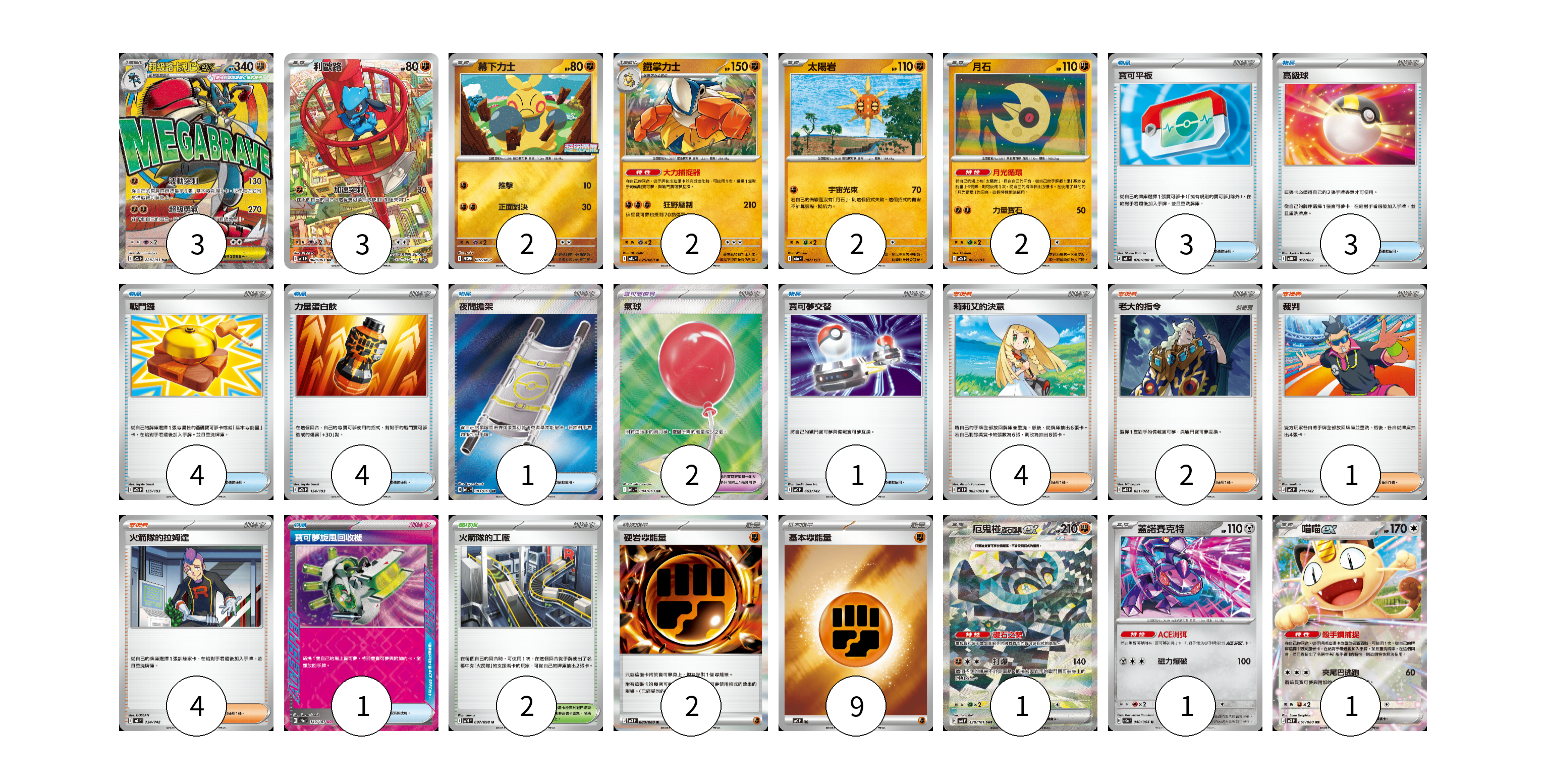 牌組構築方案 以此牌組為基礎新構築牌組 顯示卡面 顯示列表 寶可夢卡(17) 3 3 2 2 2 2 1 1 1 寶可夢道具(2) 2 物品卡(17) 3 3 4 4 1 1 1 支援者卡(11) 4 2 1 4 競技場卡(2) 2 能量卡(11) 2 9 寶可夢卡(17) 卡牌名稱 張數 卡牌名稱 張數 超級路卡利歐ex M2a 228/193 03 利歐路 M1L 068/063 03 幕下力士 M-P 007/M-P 02 鐵掌力士 M1L 025/063 02 太陽岩 M2a 087/193 02 月石 M2a 086/193 02 厄鬼椪 礎石面具ex SV6 128/101 01 蓋諾賽克特 SV6a 040/064 01 喵喵ex M3 061/080 01 寶可夢道具(2) 卡牌名稱 張數 卡牌名稱 張數 氣球 M1L 084/063 02 物品卡(17) 卡牌名稱 張數 卡牌名稱 張數 寶可平板 M3 070/080 03 高級球 MBG 012/022 03 戰鬥鑼 M2a 155/193 04 力量蛋白飲 M2a 154/193 04 夜間擔架 M1L 083/063 01 寶可夢交替 MC 663/742 01 寶可夢旋風回收機 SV8a 149/187 01 支援者卡(11) 卡牌名稱 張數 卡牌名稱 張數 莉莉艾的決意 M1L 062/063 04 老大的指令 MBG 021/022 02 裁判 MC 711/742 01 火箭隊的拉姆達 MC 734/742 04 競技場卡(2) 卡牌名稱 張數 卡牌名稱 張數 火箭隊的工廠 SV10 097/098 02 能量卡(11) 卡牌名稱 張數 卡牌名稱 張數 硬岩【鬥】能量 M3 080/080 02 基本【鬥】能量 MC FIG 09 以此牌組為基礎新構築牌組 牌組編碼 sQdhIi-MGMsLp-CEGgDL copy 列印牌組單 牌組編碼已複製 分享至SNS