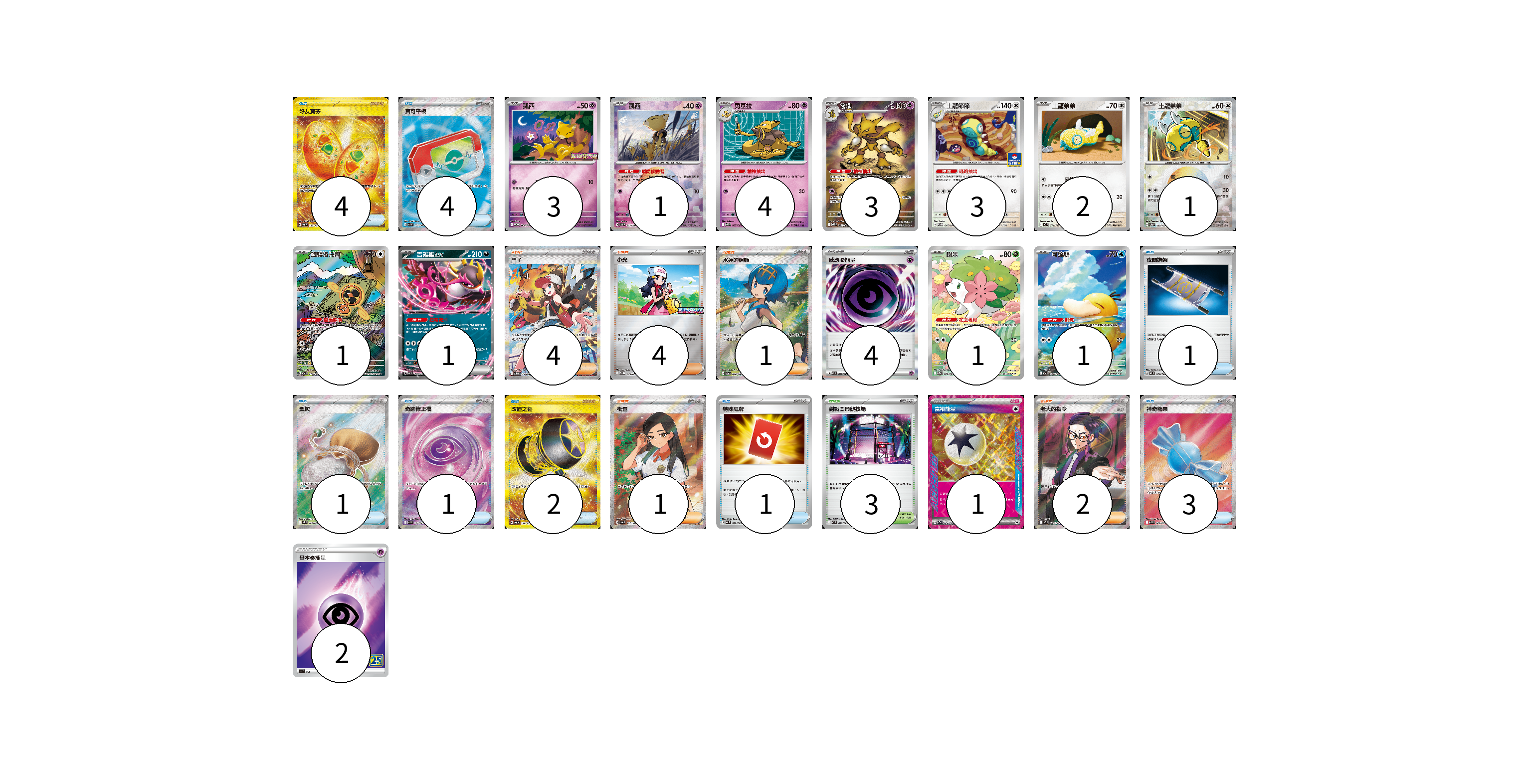牌組構築方案 以此牌組為基礎新構築牌組 顯示卡面 顯示列表 寶可夢卡(21) 3 1 4 3 3 2 1 1 1 1 1 物品卡(17) 4 4 1 1 1 2 1 3 支援者卡(12) 4 4 1 1 2 競技場卡(3) 3 能量卡(7) 4 1 2 寶可夢卡(21) 卡牌名稱 張數 卡牌名稱 張數 凱西 M-P 004/M-P 03 凱西 SV8a 057/187 01 勇基拉 M1S 037/063 04 胡地 M1S 071/063 03 土龍節節 M-P 045/M-P 03 土龍弟弟 MC 574/742 02 土龍弟弟 SV8a 129/187 01 旋轉洛托姆 M2a 213/193 01 吉雉雞ex MC 489/742 01 謝米 SV9a 066/063 01 可達鴨 M2a 199/193 01 物品卡(17) 卡牌名稱 張數 卡牌名稱 張數 好友寶芬 SV6 133/101 04 寶可平板 M3 103/080 04 夜間擔架 MC 670/742 01 聖灰 M3 102/080 01 奇跡修正檔 M3 104/080 01 改造之錘 SV6 132/101 02 特殊紅牌 M4 072/083 01 神奇糖果 M1S 082/063 03 支援者卡(12) 卡牌名稱 張數 卡牌名稱 張數 鬥子 SV11W 173/086 04 小光 M-P 028/M-P 04 水蓮的照顧 SV5a 088/066 01 枇琶 SV8a 197/187 01 老大的指令(烏羽) MC 760/742 02 競技場卡(3) 卡牌名稱 張數 卡牌名稱 張數 對戰圓形競技場 M2 079/080 03 能量卡(7) 卡牌名稱 張數 卡牌名稱 張數 感應【超】能量 M3 079/080 04 富裕能量 SV7a 064/064 01 基本超能量 S8a PSY 02 以此牌組為基礎新構築牌組 牌組編碼 sRKZCV-jiurHW-PsaFPS copy 列印牌組單 牌組編碼已複製 分享至SNS