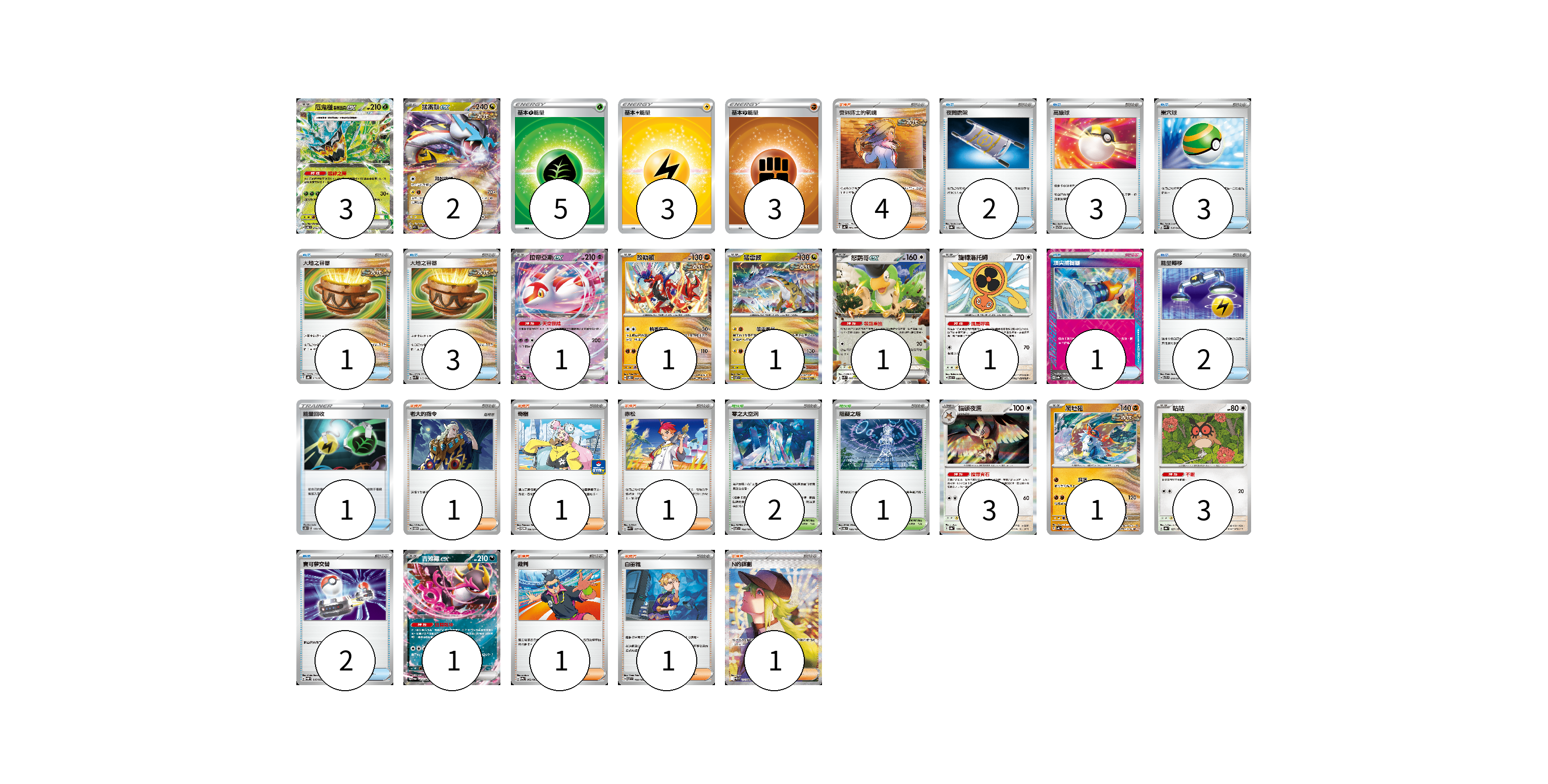 牌組構築方案 以此牌組為基礎新構築牌組 顯示卡面 顯示列表 寶可夢卡(18) 3 2 1 1 1 1 1 3 1 3 1 物品卡(18) 2 3 3 1 3 1 2 1 2 支援者卡(10) 4 1 1 1 1 1 1 競技場卡(3) 2 1 能量卡(11) 5 3 3 寶可夢卡(18) 卡牌名稱 張數 卡牌名稱 張數 厄鬼椪 碧草面具ex SV6 016/101 03 猛雷鼓ex SV5K 053/071 02 拉帝亞斯ex SV7a 019/064 01 故勒頓 SV8 069/106 01 猛雷鼓 SV7 075/102 01 怒鸚哥ex SVK 006/042 01 旋轉洛托姆 SV7 080/102 01 貓頭夜鷹 SV8a 128/187 03 爬地翅 SV4K 041/066 01 咕咕 SV8a 127/187 03 吉雉雞ex SV6a 038/064 01 物品卡(18) 卡牌名稱 張數 卡牌名稱 張數 夜間擔架 SV8a 151/187 02 高級球 SVTG 013/019 03 巢穴球 SVK 016/042 03 大地之容器 SVHK 011/022 01 大地之容器 SVK 012/042 03 頂尖捕捉器 SV8a 148/187 01 能量轉移 SVTR 010/021 02 能量回收 SC2D 133/157 01 寶可夢交替 SVQP 016/023 02 支援者卡(10) 卡牌名稱 張數 卡牌名稱 張數 奧琳博士的氣魄 SV4K 064/066 04 老大的指令 SVTM 020/022 01 奇樹 SV-P 106/SV-P 01 赤松 SVK 027/042 01 裁判 SV9a 062/063 01 白蕾雅 SV7 100/102 01 N的謀劃 SV11B 173/086 01 競技場卡(3) 卡牌名稱 張數 卡牌名稱 張數 零之大空洞 SV7 102/102 02 阻礙之塔 SV6 100/101 01 能量卡(11) 卡牌名稱 張數 卡牌名稱 張數 基本【草】能量 SI GRA 05 基本【雷】能量 SI LIG 03 基本【鬥】能量 SI FIG 03 以此牌組為基礎新構築牌組 牌組編碼 sRSRfF-iEgSwf-NGixbO copy 列印牌組單 牌組編碼已複製 分享至SNS