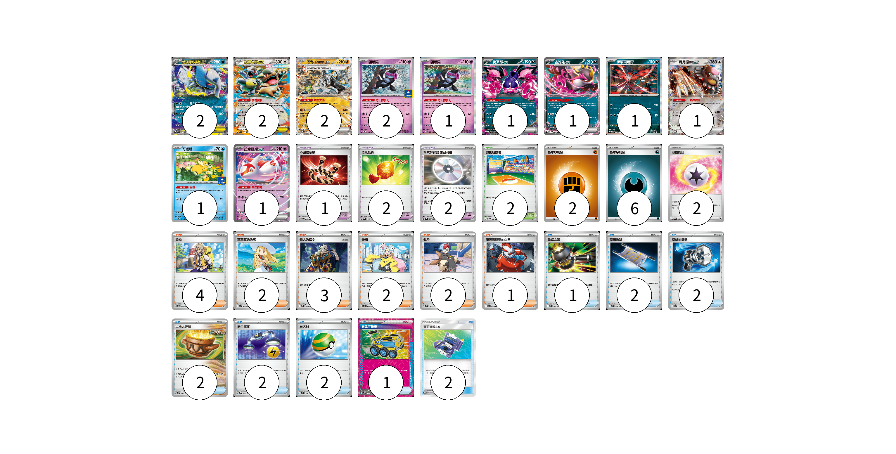 牌組構築方案 以此牌組為基礎新構築牌組 顯示卡面 顯示列表 寶可夢卡(15) 2 2 2 2 1 1 1 1 1 1 1 寶可夢道具(5) 1 2 2 物品卡(14) 1 2 2 2 2 2 1 2 支援者卡(14) 4 2 3 2 2 1 競技場卡(2) 2 能量卡(10) 2 6 2 寶可夢卡(15) 卡牌名稱 張數 卡牌名稱 張數 超級阿勃梭魯ex M1L 038/063 02 超級袋獸ex M1S 051/063 02 厄鬼椪 礎石面具ex SV8a 091/187 02 願增猿 M-P 014/M-P 02 願增猿 M2a 081/193 01 桃歹郎ex MBG 009/022 01 吉雉雞ex SVOD 004/020 01 伊裴爾塔爾 M1L 040/063 01 月月熊 赫月ex SV8a 134/187 01 可達鴨 SV-P 220/SV-P 01 拉帝亞斯ex MBD 003/022 01 寶可夢道具(5) 卡牌名稱 張數 卡牌名稱 張數 不服輸頭帶 SVTL 016/021 01 勇氣護符 SVM 142/175 02 招式學習器 能量渦輪 SV3a 056/062 02 物品卡(14) 卡牌名稱 張數 卡牌名稱 張數 改造之錘 M2a 148/193 01 夜間擔架 M2a 159/193 02 反擊捕捉器 SV8a 139/187 02 大地之容器 SV8a 143/187 02 能量轉移 SVM 127/175 02 巢穴球 SVM 133/175 02 貴重手推車 SVK 020/042 01 寶可齒輪3.0 AS5D 149/169 02 支援者卡(14) 卡牌名稱 張數 卡牌名稱 張數 派帕 SVOD 018/020 04 莉莉艾的決意 M2a 175/193 02 老大的指令 MBD 020/022 03 奇樹 SVOD 016/020 02 牡丹 SV4a 182/190 02 庫瑟洛斯奇的企圖 SV6a 062/064 01 競技場卡(2) 卡牌名稱 張數 卡牌名稱 張數 激動競技場 SV8 105/106 02 能量卡(10) 卡牌名稱 張數 卡牌名稱 張數 基本【鬥】能量 M-P FIG 02 基本【惡】能量 MBG DAR 06 薄霧能量 SV8a 186/187 02 以此牌組為基礎新構築牌組 牌組編碼 sRbsQf-cvDjBL-GFkHff copy 列印牌組單 牌組編碼已複製 分享至SNS