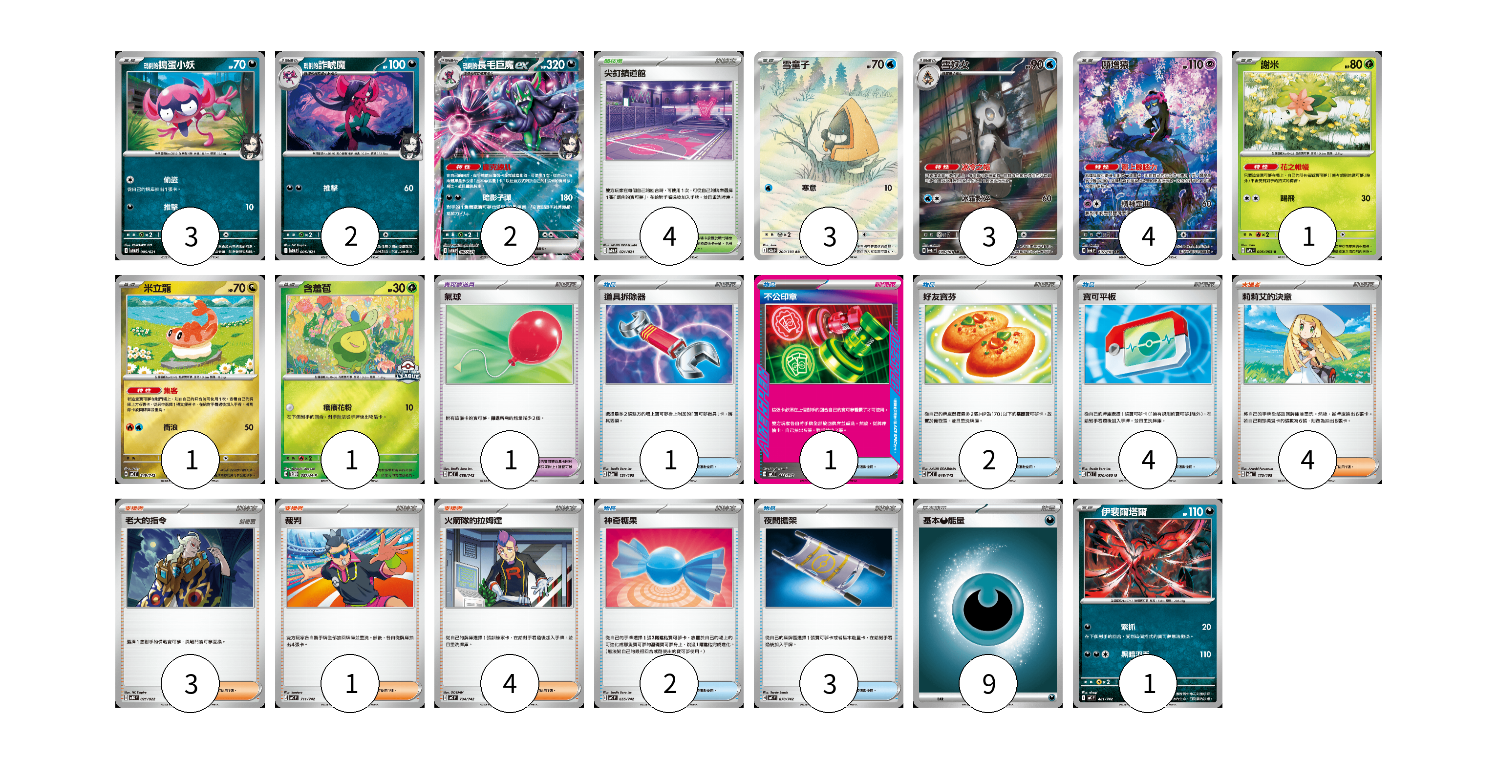 牌組構築方案 以此牌組為基礎新構築牌組 顯示卡面 顯示列表 寶可夢卡(21) 3 2 2 3 3 4 1 1 1 1 寶可夢道具(1) 1 物品卡(13) 1 1 2 4 2 3 支援者卡(12) 4 3 1 4 競技場卡(4) 4 能量卡(9) 9 寶可夢卡(21) 卡牌名稱 張數 卡牌名稱 張數 <瑪俐的>搗蛋小妖 SVOM 005/021 03 <瑪俐的>詐唬魔 SVOM 006/021 02 <瑪俐的>長毛巨魔ex SVOM 007/021 02 雪童子 M2a 200/193 03 雪妖女 SV6 104/101 03 願增猿 SV6 107/101 04 謝米 SV9a 006/063 01 米立龍 MC 549/742 01 含羞苞 M-P 037/M-P 01 伊裴爾塔爾 MC 481/742 01 寶可夢道具(1) 卡牌名稱 張數 卡牌名稱 張數 氣球 MC 688/742 01 物品卡(13) 卡牌名稱 張數 卡牌名稱 張數 道具拆除器 M2a 151/193 01 不公印章 MC 633/742 01 好友寶芬 MC 648/742 02 寶可平板 M3 070/080 04 神奇糖果 MC 655/742 02 夜間擔架 MC 670/742 03 支援者卡(12) 卡牌名稱 張數 卡牌名稱 張數 莉莉艾的決意 M2a 175/193 04 老大的指令 MBG 021/022 03 裁判 MC 711/742 01 火箭隊的拉姆達 MC 734/742 04 競技場卡(4) 卡牌名稱 張數 卡牌名稱 張數 尖釘鎮道館 SVOM 021/021 04 能量卡(9) 卡牌名稱 張數 卡牌名稱 張數 基本【惡】能量 MC DAR 09 以此牌組為基礎新構築牌組 牌組編碼 sTLTQC-vCCFBa-BxyKsz copy 列印牌組單 牌組編碼已複製 分享至SNS