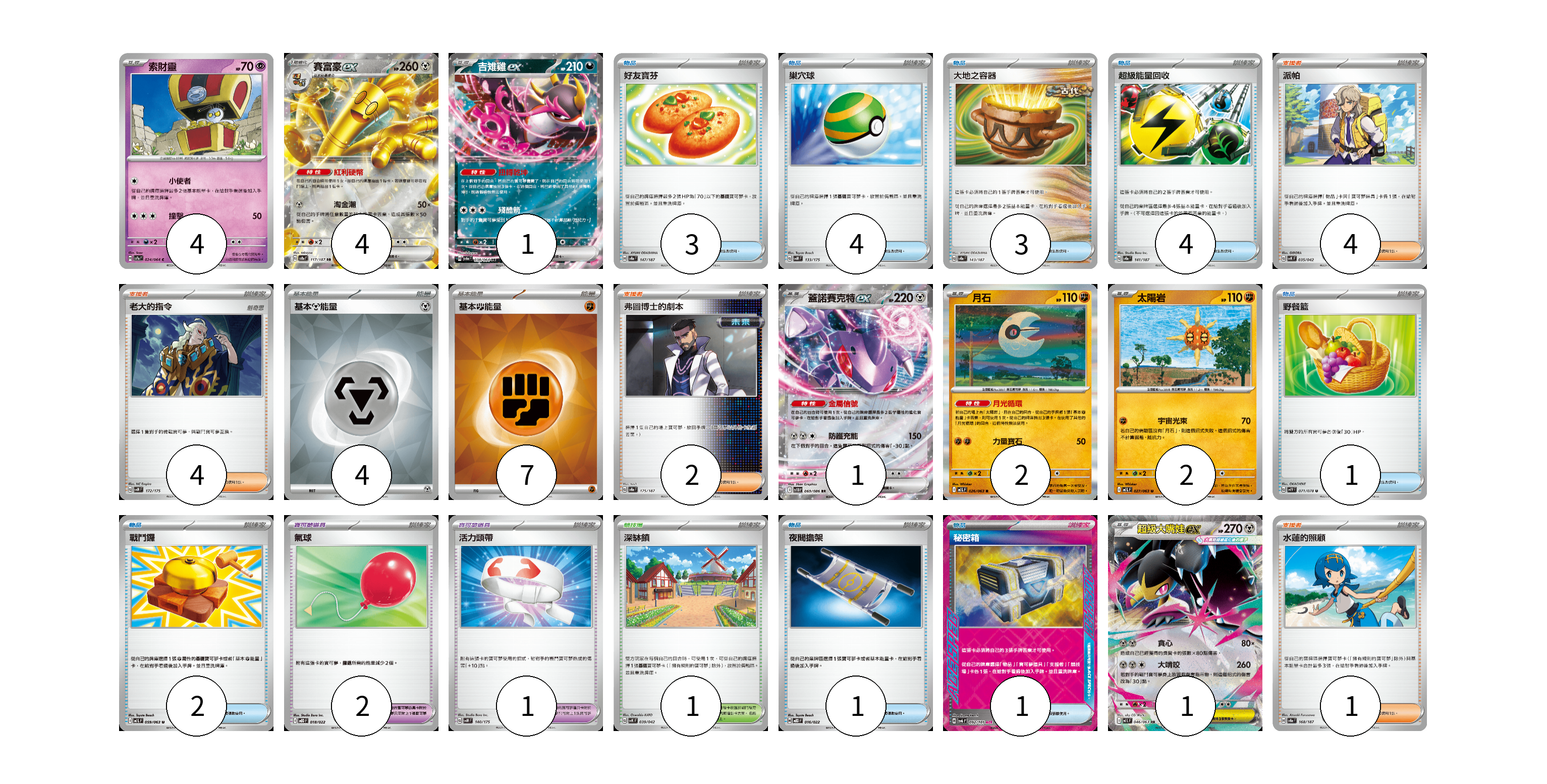 牌組構築方案 以此牌組為基礎新構築牌組 顯示卡面 顯示列表 寶可夢卡(15) 4 4 1 1 2 2 1 寶可夢道具(3) 2 1 物品卡(19) 3 4 3 4 1 2 1 1 支援者卡(11) 4 4 2 1 競技場卡(1) 1 能量卡(11) 4 7 寶可夢卡(15) 卡牌名稱 張數 卡牌名稱 張數 索財靈 SV7a 024/064 04 賽富豪ex SV8a 117/187 04 吉雉雞ex SV6a 038/064 01 蓋諾賽克特ex SV11B 069/086 01 月石 M1L 026/063 02 太陽岩 M1L 027/063 02 超級大嘴娃ex M1L 046/063 01 寶可夢道具(3) 卡牌名稱 張數 卡牌名稱 張數 氣球 MBD 018/022 02 活力頭帶 SVM 140/175 01 物品卡(19) 卡牌名稱 張數 卡牌名稱 張數 好友寶芬 SV8a 147/187 03 巢穴球 SVM 133/175 04 大地之容器 SV8a 143/187 03 超級能量回收 SV8a 141/187 04 野餐籃 SV1V 071/078 01 戰鬥鑼 M1L 059/063 02 夜間擔架 MBD 016/022 01 秘密箱 SV6 092/101 01 支援者卡(11) 卡牌名稱 張數 卡牌名稱 張數 派帕 SVK 035/042 04 老大的指令 SVM 172/175 04 弗圖博士的劇本 SV8a 175/187 02 水蓮的照顧 SV8a 168/187 01 競技場卡(1) 卡牌名稱 張數 卡牌名稱 張數 深缽鎮 SVK 039/042 01 能量卡(11) 卡牌名稱 張數 卡牌名稱 張數 基本【鋼】能量 SVK MET 04 基本【鬥】能量 SVK FIG 07 以此牌組為基礎新構築牌組 牌組編碼 sTiwlL-mktfrv-fEWlKL copy 列印牌組單 牌組編碼已複製 分享至SNS