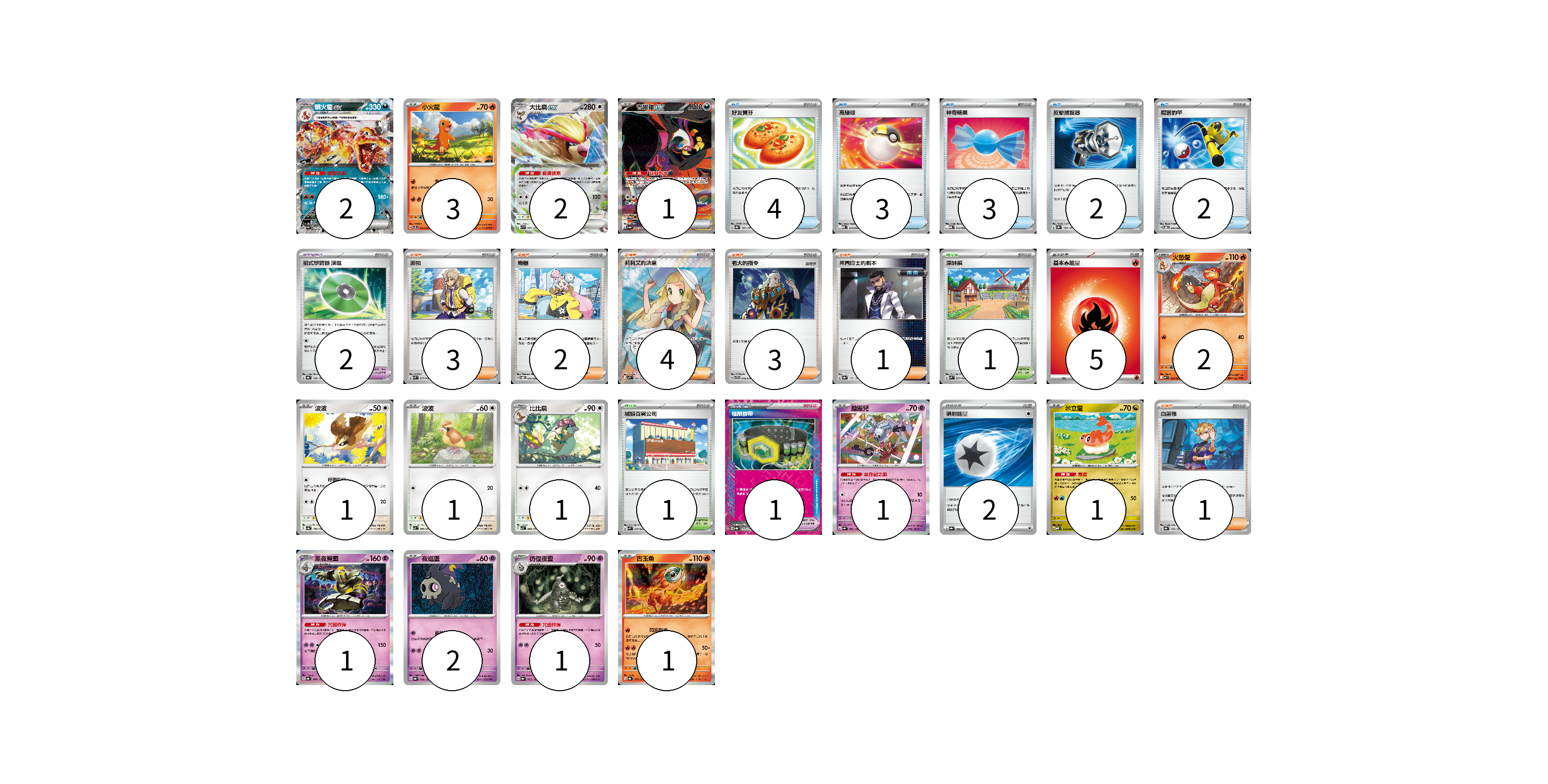 牌組構築方案 以此牌組為基礎新構築牌組 顯示卡面 顯示列表 寶可夢卡(20) 2 3 2 1 2 1 1 1 1 1 1 2 1 1 寶可夢道具(3) 2 1 物品卡(14) 4 3 3 2 2 支援者卡(14) 3 2 4 3 1 1 競技場卡(2) 1 1 能量卡(7) 5 2 寶可夢卡(20) 卡牌名稱 張數 卡牌名稱 張數 噴火龍ex SV4a 115/190 02 小火龍 SVTL 001/021 03 大比鳥ex SV3 089/108 02 吉雉雞ex SV6a 089/064 01 火恐龍 M2 012/080 02 波波 SV4a 137/190 01 波波 SV3 087/108 01 比比鳥 SV3 088/108 01 鑰圈兒 SV4a 087/190 01 米立龍 MBD 010/022 01 黑夜魔靈 SV8a 066/187 01 夜巡靈 SV8a 064/187 02 彷徨夜靈 SV8a 065/187 01 古玉魚 SV8a 025/187 01 寶可夢道具(3) 卡牌名稱 張數 卡牌名稱 張數 招式學習器 演進 SV8a 160/187 02 極限腰帶 SV8a 159/187 01 物品卡(14) 卡牌名稱 張數 卡牌名稱 張數 好友寶芬 SV8a 147/187 04 高級球 MBD 014/022 03 神奇糖果 MBG 013/022 03 反擊捕捉器 SV8a 139/187 02 厲害釣竿 SVOD 010/020 02 支援者卡(14) 卡牌名稱 張數 卡牌名稱 張數 派帕 SVK 035/042 03 奇樹 SVOD 016/020 02 莉莉艾的決意 M1L 086/063 04 老大的指令 SVTG 019/019 03 弗圖博士的劇本 SV8a 175/187 01 白蕾雅 SV8a 176/187 01 競技場卡(2) 卡牌名稱 張數 卡牌名稱 張數 深缽鎮 SVK 039/042 01 城鎮百貨公司 SVK 037/042 01 能量卡(7) 卡牌名稱 張數 卡牌名稱 張數 基本【火】能量 M-P FIR 05 噴射能量 SV8a 185/187 02 以此牌組為基礎新構築牌組 牌組編碼 sUaoke-ouKlns-Ohvxbk copy 列印牌組單 牌組編碼已複製 分享至SNS