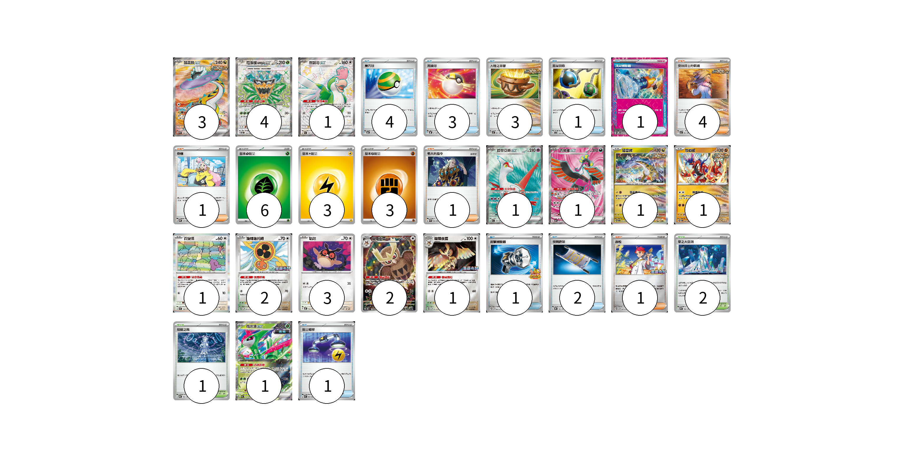 牌組構築方案 以此牌組為基礎新構築牌組 顯示卡面 顯示列表 寶可夢卡(22) 3 4 1 1 1 1 1 1 2 3 2 1 1 物品卡(16) 4 3 3 1 1 1 2 1 支援者卡(7) 4 1 1 1 競技場卡(3) 2 1 能量卡(12) 6 3 3 寶可夢卡(22) 卡牌名稱 張數 卡牌名稱 張數 猛雷鼓ex SV5K 089/071 03 厄鬼椪 碧草面具ex SV6 114/101 04 怒鸚哥ex SV4a 337/190 01 拉帝亞斯ex SV7a 078/064 01 吉雉雞ex SV6a 081/064 01 猛雷鼓 SV7 075/102 01 故勒頓 SV8 069/106 01 百變怪 SV4a 144/190 01 旋轉洛托姆 SV-P 146/SV-P 02 咕咕 SV5K 054/071 03 貓頭夜鷹 SV7 114/102 02 貓頭夜鷹 SV-P 145/SV-P 01 鐵斑葉ex SV5M 016/071 01 物品卡(16) 卡牌名稱 張數 卡牌名稱 張數 巢穴球 SVHK 012/022 04 高級球 SVHK 013/022 03 大地之容器 SV4K 060/066 03 能量回收 SVD 110/139 01 頂尖捕捉器 SV5M 062/071 01 反擊捕捉器 SV-P 083/SV-P 01 夜間擔架 SV8a 151/187 02 能量轉移 SVK 008/042 01 支援者卡(7) 卡牌名稱 張數 卡牌名稱 張數 奧琳博士的氣魄 SV4K 064/066 04 奇樹 SVHK 019/022 01 老大的指令 SVHM 022/022 01 赤松 SV-P 150/SV-P 01 競技場卡(3) 卡牌名稱 張數 卡牌名稱 張數 零之大空洞 SV8a 182/187 02 阻礙之塔 SV8a 181/187 01 能量卡(12) 卡牌名稱 張數 卡牌名稱 張數 基本草能量 sv-p GRA 06 基本雷能量 sv-p LIG 03 基本鬥能量 sv-p FIG 03 以此牌組為基礎新構築牌組 牌組編碼 sUwCrI-RHenXU-QKKQix copy 列印牌組單 牌組編碼已複製 分享至SNS