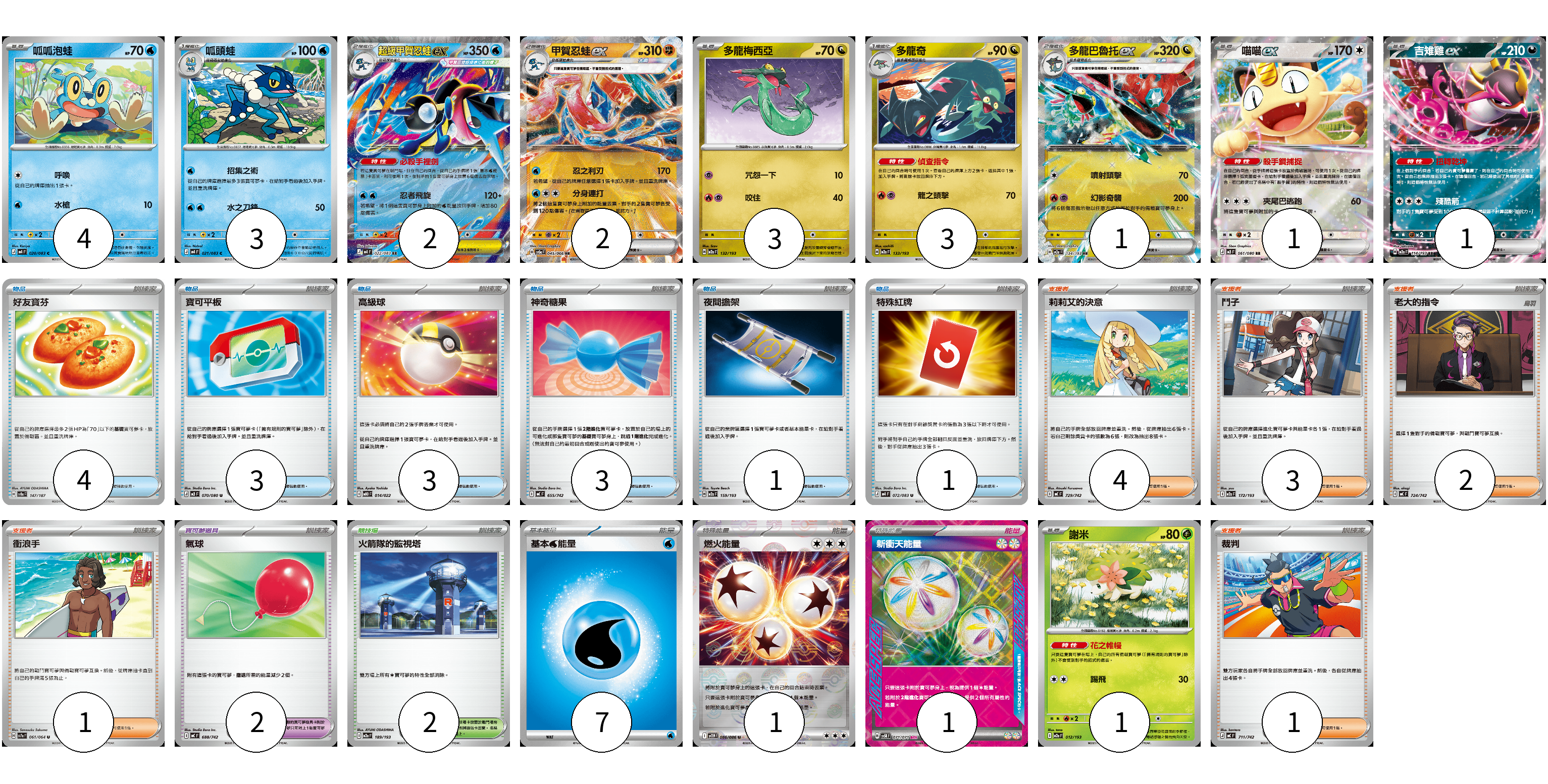 牌組構築方案 以此牌組為基礎新構築牌組 顯示卡面 顯示列表 寶可夢卡(21) 4 3 2 2 3 3 1 1 1 1 寶可夢道具(2) 2 物品卡(15) 4 3 3 3 1 1 支援者卡(11) 4 3 2 1 1 競技場卡(2) 2 能量卡(9) 7 1 1 寶可夢卡(21) 卡牌名稱 張數 卡牌名稱 張數 呱呱泡蛙 M4 020/083 04 呱頭蛙 M4 021/083 03 超級甲賀忍蛙ex M4 022/083 02 甲賀忍蛙ex SV5a 045/066 02 多龍梅西亞 M2a 132/193 03 多龍奇 M2a 133/193 03 多龍巴魯托ex M2a 134/193 01 喵喵ex M3 061/080 01 吉雉雞ex M2a 114/193 01 謝米 M2a 012/193 01 寶可夢道具(2) 卡牌名稱 張數 卡牌名稱 張數 氣球 MC 688/742 02 物品卡(15) 卡牌名稱 張數 卡牌名稱 張數 好友寶芬 SV8a 147/187 04 寶可平板 M3 070/080 03 高級球 MBD 014/022 03 神奇糖果 MC 655/742 03 夜間擔架 M2a 159/193 01 特殊紅牌 M4 072/083 01 支援者卡(11) 卡牌名稱 張數 卡牌名稱 張數 莉莉艾的決意 MC 729/742 04 鬥子 M2a 172/193 03 老大的指令 MC 724/742 02 衝浪手 SV7a 061/064 01 裁判 MC 711/742 01 競技場卡(2) 卡牌名稱 張數 卡牌名稱 張數 火箭隊的監視塔 M2a 189/193 02 能量卡(9) 卡牌名稱 張數 卡牌名稱 張數 基本【水】能量 MC WAT 07 燃火能量 SV11W 086/086 01 新衝天能量 SV5K 071/071 01 以此牌組為基礎新構築牌組 牌組編碼 sVZpFf-YCEhtf-yMTvOP copy 列印牌組單 牌組編碼已複製 分享至SNS