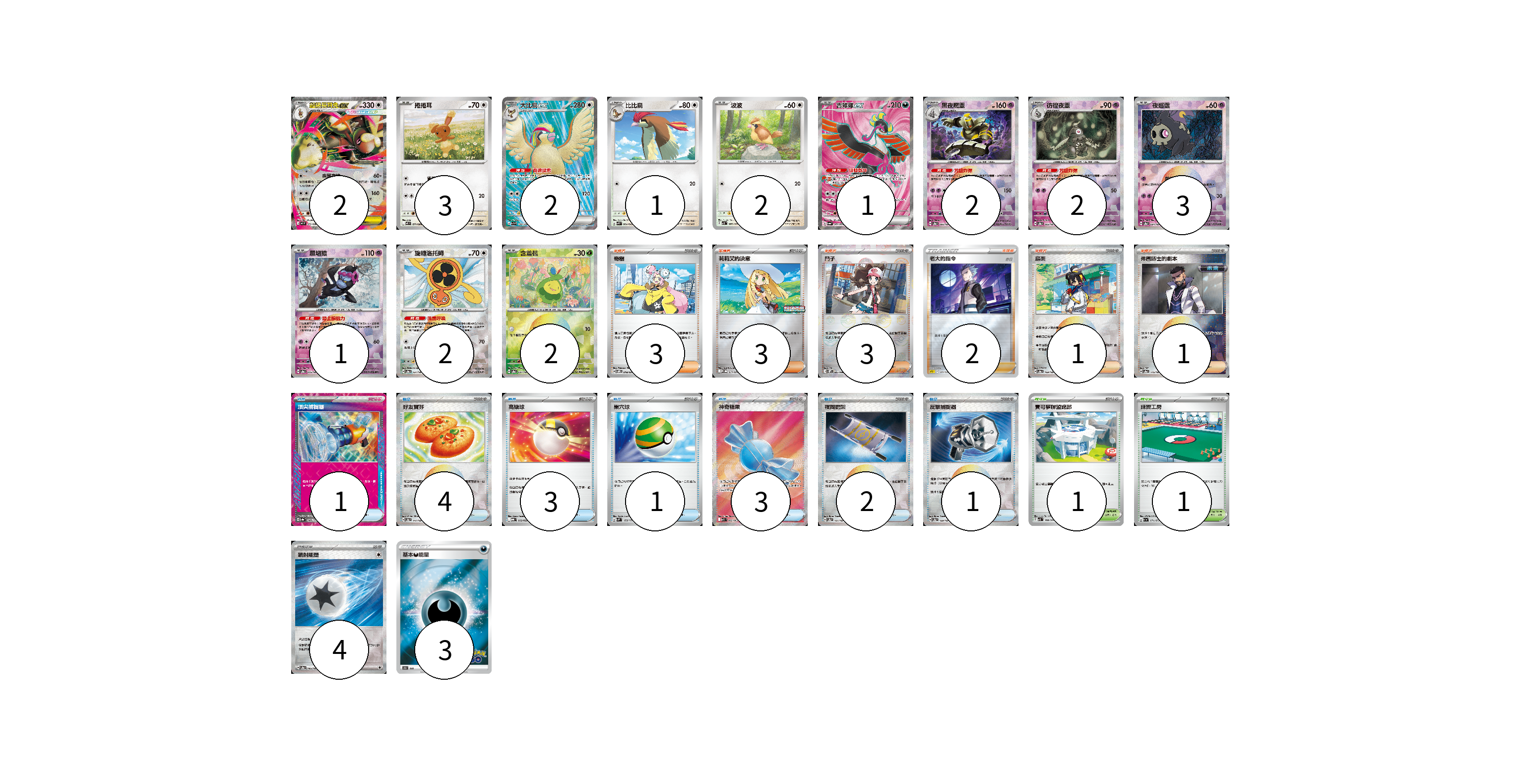 牌組構築方案 以此牌組為基礎新構築牌組 顯示卡面 顯示列表 寶可夢卡(23) 2 3 2 1 2 1 2 2 3 1 2 2 物品卡(15) 1 4 3 1 3 2 1 支援者卡(13) 3 3 3 2 1 1 競技場卡(2) 1 1 能量卡(7) 4 3 寶可夢卡(23) 卡牌名稱 張數 卡牌名稱 張數 超級長耳兔ex M2 072/080 02 捲捲耳 M2 071/080 03 大比鳥ex SV3 128/108 02 比比鳥 SVK 004/042 01 波波 SV3 087/108 02 吉雉雞ex SV6a 081/064 01 黑夜魔靈 SV8a 066/187 02 彷徨夜靈 SV8a 065/187 02 夜巡靈 SV8a 064/187 03 願增猿 SV8a 075/187 01 旋轉洛托姆 SV8a 131/187 02 含羞苞 SV8a 001/187 02 物品卡(15) 卡牌名稱 張數 卡牌名稱 張數 頂尖捕捉器 SV8a 148/187 01 好友寶芬 SV8a 147/187 04 高級球 MBG 012/022 03 巢穴球 SVM 133/175 01 神奇糖果 M1S 082/063 03 夜間擔架 SV8a 151/187 02 反擊捕捉器 SV8a 139/187 01 支援者卡(13) 卡牌名稱 張數 卡牌名稱 張數 奇樹 SVOM 018/021 03 莉莉艾的決意 M-P 011/M-P 03 鬥子 SV11W 085/086 03 老大的指令(赤日) SPZ 020/020 02 烏栗 SV8a 169/187 01 弗圖博士的劇本 SV8a 175/187 01 競技場卡(2) 卡牌名稱 張數 卡牌名稱 張數 寶可夢聯盟總部 SV3 108/108 01 練習工房 SV1a 071/073 01 能量卡(7) 卡牌名稱 張數 卡牌名稱 張數 噴射能量 SV8a 185/187 04 基本惡能量 S10b DAR 03 以此牌組為基礎新構築牌組 牌組編碼 sVdDoA-zvFlVB-WPYWNv copy 列印牌組單 牌組編碼已複製 分享至SNS