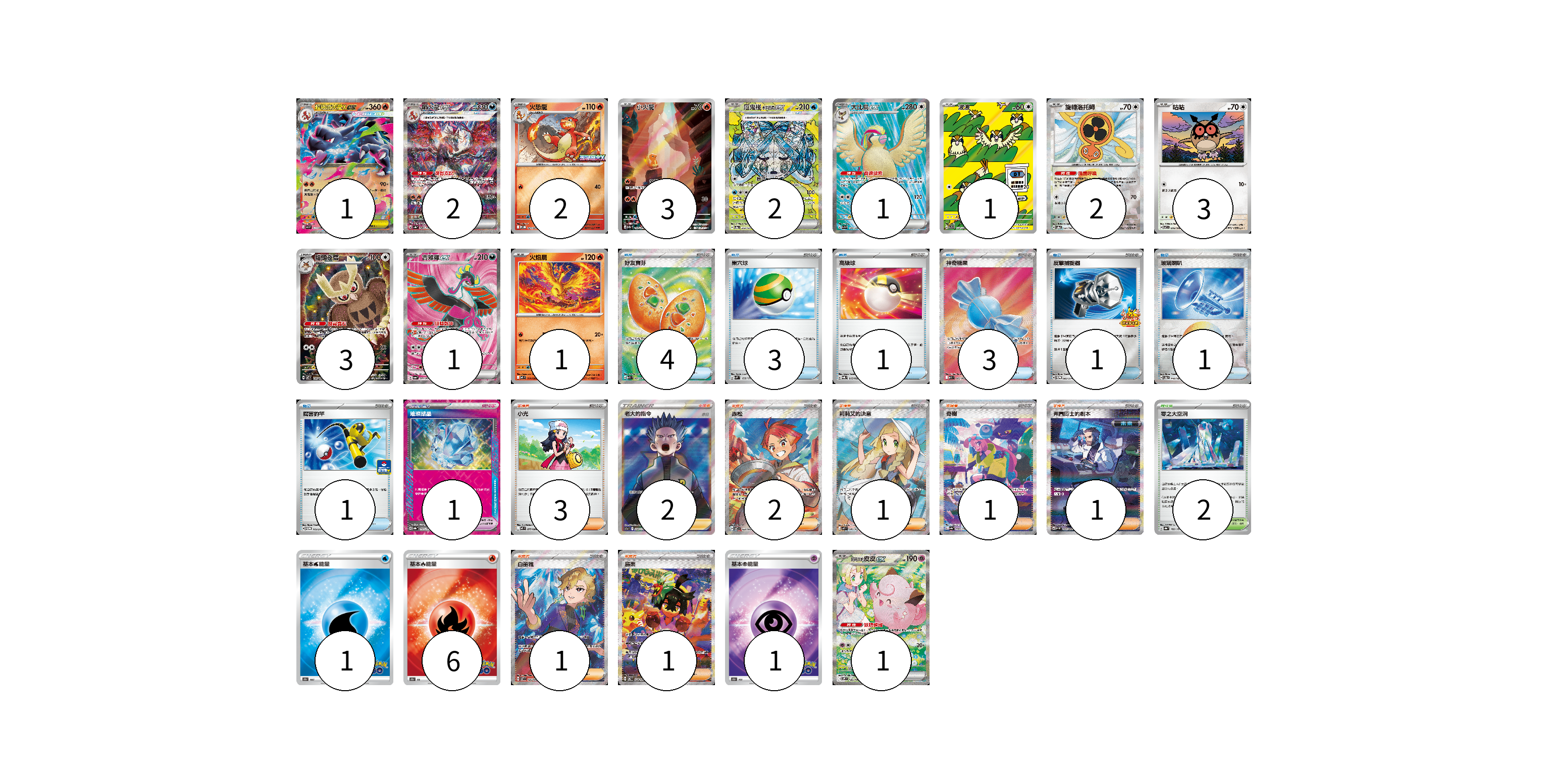 牌組構築方案 以此牌組為基礎新構築牌組 顯示卡面 顯示列表 寶可夢卡(23) 1 2 2 3 2 1 1 2 3 3 1 1 1 寶可夢道具(1) 1 物品卡(14) 4 3 1 3 1 1 1 支援者卡(12) 3 2 2 1 1 1 1 1 競技場卡(2) 2 能量卡(8) 1 6 1 寶可夢卡(23) 卡牌名稱 張數 卡牌名稱 張數 超級噴火龍Xex M2 013/080 01 噴火龍ex SV4a 349/190 02 火恐龍 M-P 021/M-P 02 小火龍 SV2a 168/165 03 厄鬼椪 水井面具ex SV8a 208/187 02 大比鳥ex SV3 128/108 01 波波 SV3 118/108 01 旋轉洛托姆 SV8a 131/187 02 咕咕 SV7 076/102 03 貓頭夜鷹 SV7 114/102 03 吉雉雞ex SV6a 081/064 01 火焰鳥 M2 014/080 01 莉莉艾的皮皮ex SV9 126/100 01 寶可夢道具(1) 卡牌名稱 張數 卡牌名稱 張數 璀璨結晶 SV8a 152/187 01 物品卡(14) 卡牌名稱 張數 卡牌名稱 張數 好友寶芬 M1S 081/063 04 巢穴球 SVM 133/175 03 高級球 SVQL 015/022 01 神奇糖果 M1S 082/063 03 反擊捕捉器 SV-P 083/SV-P 01 玻璃喇叭 SV8a 140/187 01 厲害釣竿 SV-P 112/SV-P 01 支援者卡(12) 卡牌名稱 張數 卡牌名稱 張數 小光 M2 077/080 03 老大的指令(赤日) S12a 250/172 02 赤松 SV7 123/102 02 莉莉艾的決意 M1L 086/063 01 奇樹 SV4a 350/190 01 弗圖博士的劇本 SV4M 091/066 01 白蕾雅 SV7 126/102 01 烏栗 SV6 129/101 01 競技場卡(2) 卡牌名稱 張數 卡牌名稱 張數 零之大空洞 SV8a 182/187 02 能量卡(8) 卡牌名稱 張數 卡牌名稱 張數 基本水能量 S10b WAT 01 基本火能量 S10b FIR 06 基本超能量 S10b PSY 01 以此牌組為基礎新構築牌組 牌組編碼 sWsGNi-rrBANc-pyMsyj copy 列印牌組單 牌組編碼已複製 分享至SNS