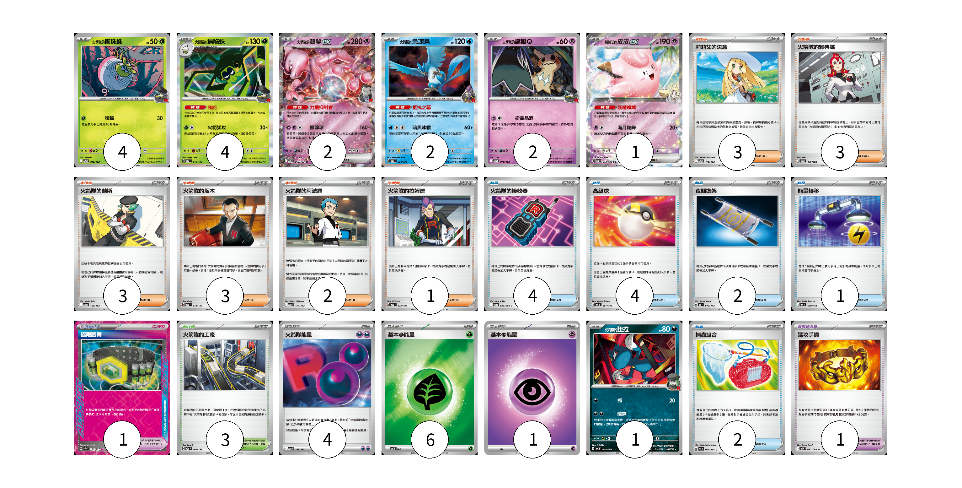 牌組構築方案 以此牌組為基礎新構築牌組 顯示卡面 顯示列表 寶可夢卡(16) 4 4 2 2 2 1 1 寶可夢道具(2) 1 1 物品卡(13) 4 4 2 1 2 支援者卡(15) 3 3 3 3 2 1 競技場卡(3) 3 能量卡(11) 4 6 1 寶可夢卡(16) 卡牌名稱 張數 卡牌名稱 張數 <火箭隊的>團珠蛛 M2a 015/193 04 <火箭隊的>操陷蛛 M2a 016/193 04 <火箭隊的>超夢ex M2a 063/193 02 <火箭隊的>急凍鳥 M2a 034/193 02 <火箭隊的>謎擬Q M2a 079/193 02 莉莉艾的皮皮ex SV9 033/100 01 <火箭隊的>狃拉 MC 448/742 01 寶可夢道具(2) 卡牌名稱 張數 卡牌名稱 張數 極限腰帶 SV8a 159/187 01 猛攻手鐲 SV11W 082/086 01 物品卡(13) 卡牌名稱 張數 卡牌名稱 張數 火箭隊的接收器 SV10 090/098 04 高級球 MC 651/742 04 夜間擔架 MC 670/742 02 能量轉移 MC 638/742 01 捕蟲組合 SV6 094/101 02 支援者卡(15) 卡牌名稱 張數 卡牌名稱 張數 莉莉艾的決意 M2a 175/193 03 火箭隊的雅典娜 M2a 176/193 03 火箭隊的蘭斯 M2a 180/193 03 火箭隊的坂木 M2a 178/193 03 火箭隊的阿波羅 M2a 177/193 02 火箭隊的拉姆達 M2a 179/193 01 競技場卡(3) 卡牌名稱 張數 卡牌名稱 張數 火箭隊的工廠 M2a 190/193 03 能量卡(11) 卡牌名稱 張數 卡牌名稱 張數 火箭隊能量 M2a 193/193 04 基本【草】能量 MC GRA 06 基本【超】能量 M-P PSY 01 以此牌組為基礎新構築牌組 牌組編碼 sZbTWw-mXgHmz-LElEdi copy 列印牌組單 牌組編碼已複製 分享至SNS