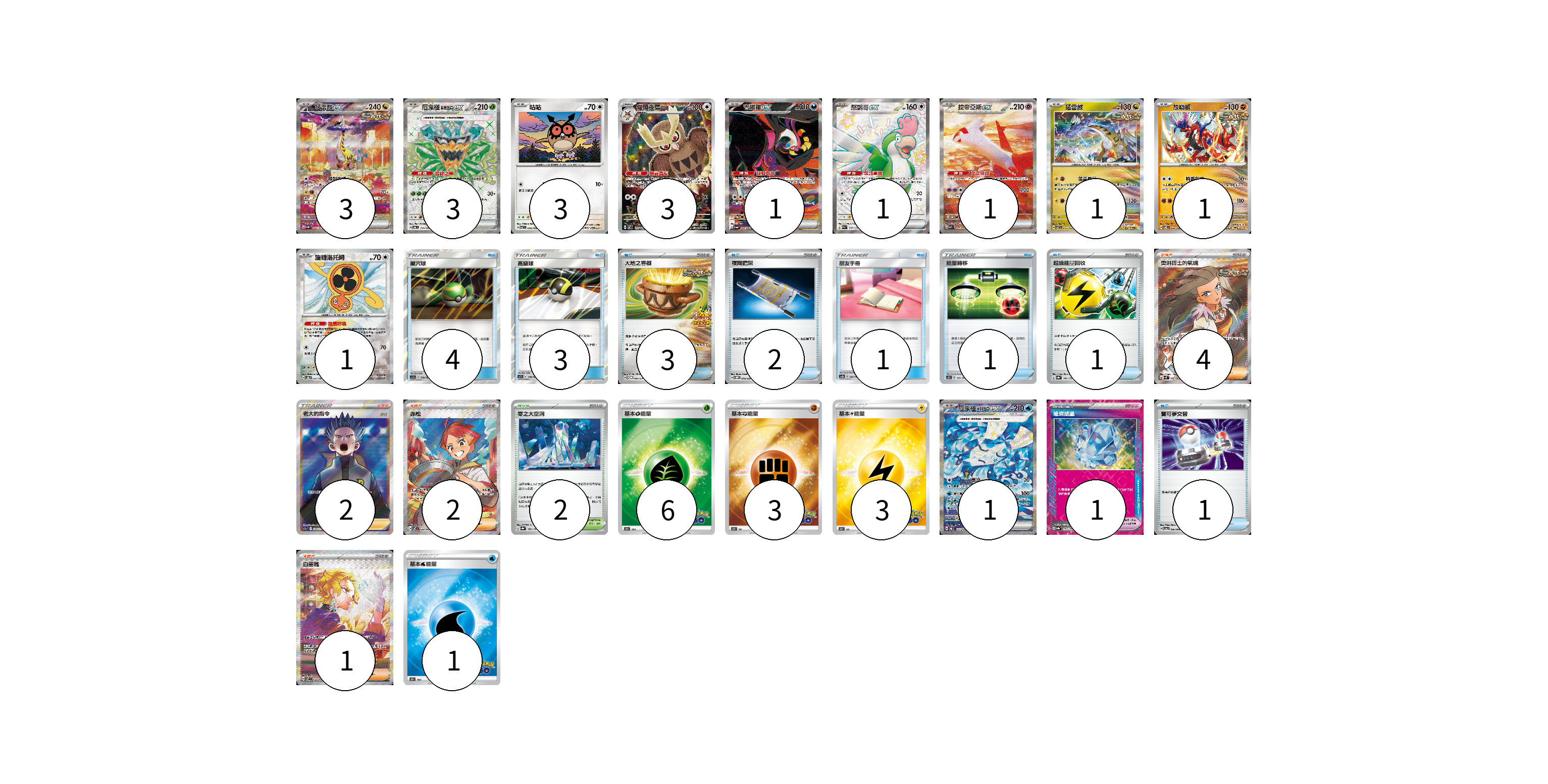 牌組構築方案 以此牌組為基礎新構築牌組 顯示卡面 顯示列表 寶可夢卡(19) 3 3 3 3 1 1 1 1 1 1 1 寶可夢道具(1) 1 物品卡(16) 4 3 3 2 1 1 1 1 支援者卡(9) 4 2 2 1 競技場卡(2) 2 能量卡(13) 6 3 3 1 寶可夢卡(19) 卡牌名稱 張數 卡牌名稱 張數 猛雷鼓ex SV5K 095/071 03 厄鬼椪 碧草面具ex SV6 114/101 03 咕咕 SV7 076/102 03 貓頭夜鷹 SV7 114/102 03 吉雉雞ex SV6a 089/064 01 怒鸚哥ex SV4a 337/190 01 拉帝亞斯ex SV7a 087/064 01 猛雷鼓 SV7 075/102 01 故勒頓 SV8 069/106 01 旋轉洛托姆 SV8a 131/187 01 厄鬼椪 水井面具ex SV6 127/101 01 寶可夢道具(1) 卡牌名稱 張數 卡牌名稱 張數 璀璨結晶 SV8a 152/187 01 物品卡(16) 卡牌名稱 張數 卡牌名稱 張數 巢穴球 AS5a 178/184 04 高級球 AS5b 178/186 03 大地之容器 SV-P 084/SV-P 03 夜間擔架 SVOM 016/021 02 朋友手冊 AS6b 188/194 01 能量轉移 SC1D 146/164 01 超級能量回收 SV8a 141/187 01 寶可夢交替 SV5a 056/066 01 支援者卡(9) 卡牌名稱 張數 卡牌名稱 張數 奧琳博士的氣魄 SV4K 085/066 04 老大的指令(赤日) S12a 250/172 02 赤松 SV7 123/102 02 白蕾雅 SV7 132/102 01 競技場卡(2) 卡牌名稱 張數 卡牌名稱 張數 零之大空洞 SV8a 182/187 02 能量卡(13) 卡牌名稱 張數 卡牌名稱 張數 基本草能量 S10b GRA 06 基本鬥能量 S10b FIG 03 基本雷能量 S10b LIG 03 基本水能量 S10b WAT 01 以此牌組為基礎新構築牌組 牌組編碼 sbgQiB-GYygTA-jrMvfu copy 列印牌組單 牌組編碼已複製 分享至SNS