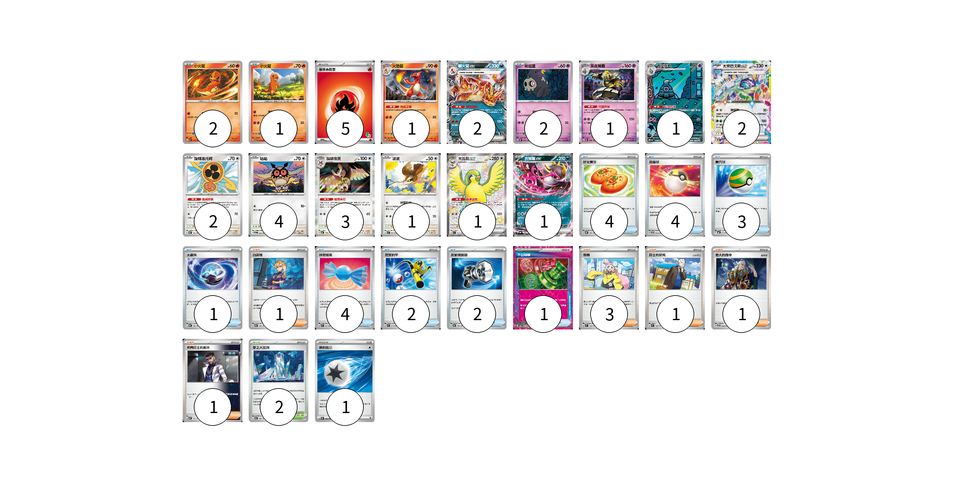 牌組構築方案 以此牌組為基礎新構築牌組 顯示卡面 顯示列表 寶可夢卡(24) 2 1 1 2 2 1 1 2 2 4 3 1 1 1 物品卡(21) 4 4 3 1 4 2 2 1 支援者卡(7) 1 3 1 1 1 競技場卡(2) 2 能量卡(6) 5 1 寶可夢卡(24) 卡牌名稱 張數 卡牌名稱 張數 小火龍 SV3 012/108 02 小火龍 SVTL 001/021 01 火恐龍 SVTL 002/021 01 噴火龍ex SVTL 006/021 02 夜巡靈 SV8a 064/187 02 黑夜魔靈 SV8a 066/187 01 彷徨夜靈 SV6a 069/064 01 太樂巴戈斯ex SV8a 136/187 02 旋轉洛托姆 SV8a 131/187 02 咕咕 SV7 076/102 04 貓頭夜鷹 SV8a 128/187 03 波波 SVK 003/042 01 大比鳥ex SV4a 335/190 01 吉雉雞ex SV8a 104/187 01 物品卡(21) 卡牌名稱 張數 卡牌名稱 張數 好友寶芬 SV8a 147/187 04 高級球 SVTG 013/019 04 巢穴球 SVHK 012/022 03 太晶珠 SV8a 145/187 01 神奇糖果 SVK 019/042 04 厲害釣竿 SVK 011/042 02 反擊捕捉器 SV8a 139/187 02 不公印章 SV5a 053/066 01 支援者卡(7) 卡牌名稱 張數 卡牌名稱 張數 白蕾雅 SV8a 176/187 01 奇樹 SVM 160/175 03 博士的研究 SVM 165/175 01 老大的指令 SVTG 019/019 01 弗圖博士的劇本 SV8a 175/187 01 競技場卡(2) 卡牌名稱 張數 卡牌名稱 張數 零之大空洞 SV8a 182/187 02 能量卡(6) 卡牌名稱 張數 卡牌名稱 張數 基本【火】能量 SVI FIR 05 噴射能量 SV8a 185/187 01 以此牌組為基礎新構築牌組 牌組編碼 scGcYA-CwCYvo-OPBHSq copy 列印牌組單 牌組編碼已複製 分享至SNS