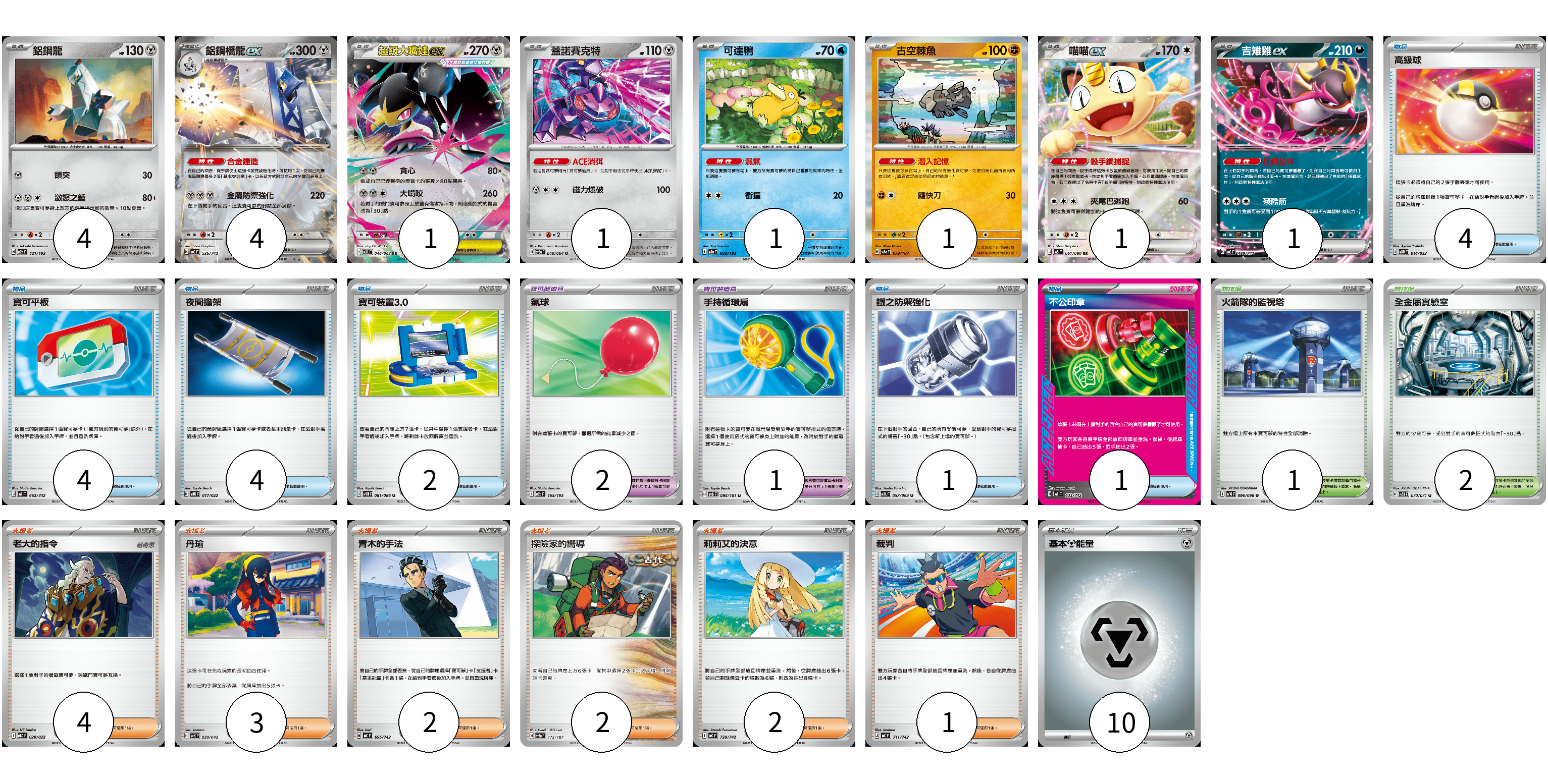 牌組構築方案 以此牌組為基礎新構築牌組 顯示卡面 顯示列表 寶可夢卡(14) 4 4 1 1 1 1 1 1 寶可夢道具(3) 2 1 物品卡(16) 4 4 4 2 1 1 支援者卡(14) 4 3 2 2 2 1 競技場卡(3) 1 2 能量卡(10) 10 寶可夢卡(14) 卡牌名稱 張數 卡牌名稱 張數 鋁鋼龍 M2a 121/193 04 鋁鋼橋龍ex MC 526/742 04 超級大嘴娃ex M1L 046/063 01 蓋諾賽克特 SV6a 040/064 01 可達鴨 M2a 032/193 01 古空棘魚 SV8a 079/187 01 喵喵ex M3 061/080 01 吉雉雞ex MC 489/742 01 寶可夢道具(3) 卡牌名稱 張數 卡牌名稱 張數 氣球 M2a 165/193 02 手持循環扇 SV6 095/101 01 物品卡(16) 卡牌名稱 張數 卡牌名稱 張數 高級球 MBD 014/022 04 寶可平板 MC 662/742 04 夜間擔架 MBG 017/022 04 寶可裝置3.0 SV11B 081/086 02 鐵之防禦強化 M1L 057/063 01 不公印章 MC 633/742 01 支援者卡(14) 卡牌名稱 張數 卡牌名稱 張數 老大的指令 MBD 020/022 04 丹瑜 SVK 030/042 03 青木的手法 MC 695/742 02 探險家的嚮導 SV8a 172/187 02 莉莉艾的決意 MC 729/742 02 裁判 MC 711/742 01 競技場卡(3) 卡牌名稱 張數 卡牌名稱 張數 火箭隊的監視塔 SV10 096/098 01 全金屬實驗室 SV5M 070/071 02 能量卡(10) 卡牌名稱 張數 卡牌名稱 張數 基本【鋼】能量 MC MET 10 以此牌組為基礎新構築牌組 牌組編碼 sfPxEt-zBLyNL-ExWcUp copy 列印牌組單 牌組編碼已複製 分享至SNS