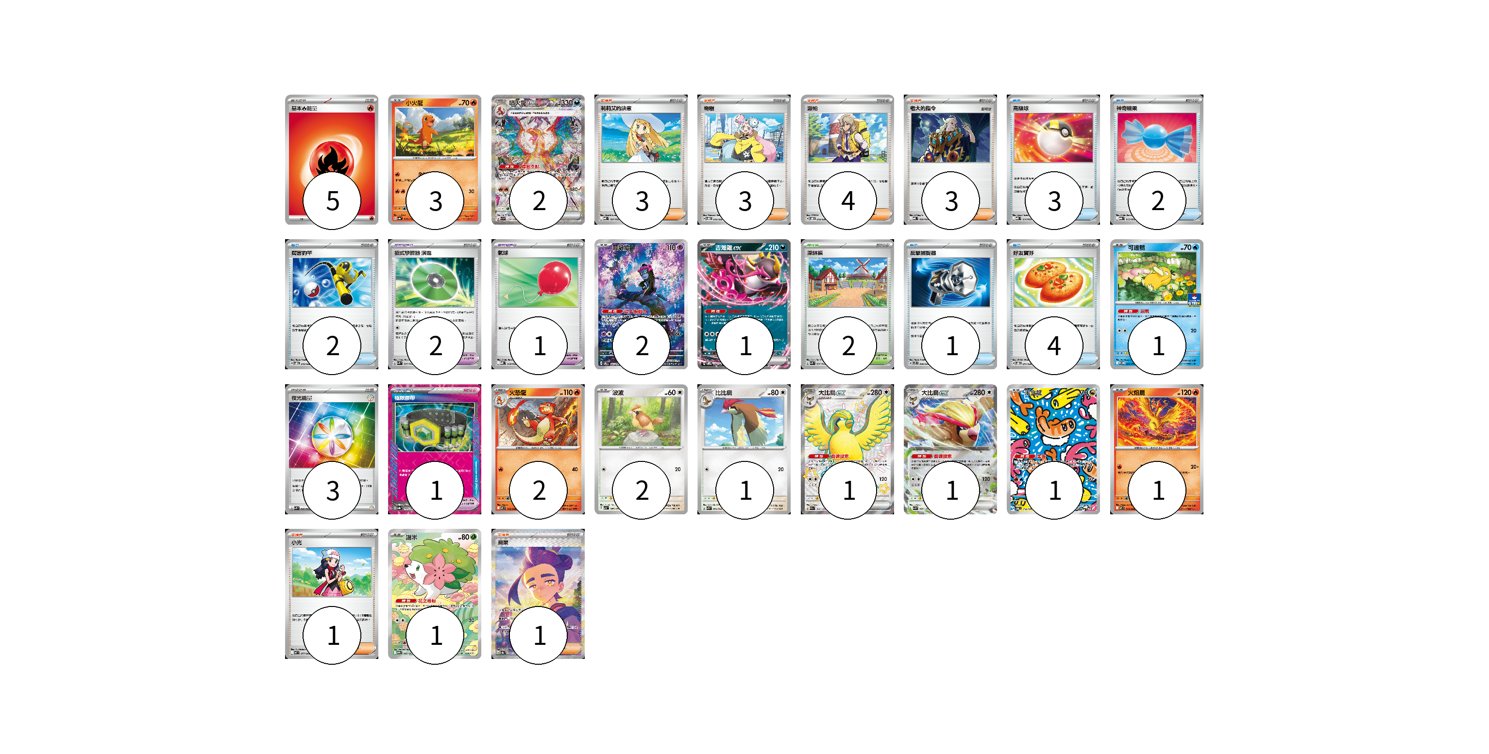 牌組構築方案 以此牌組為基礎新構築牌組 顯示卡面 顯示列表 寶可夢卡(19) 3 2 2 1 1 2 2 1 1 1 1 1 1 寶可夢道具(4) 2 1 1 物品卡(12) 3 2 2 1 4 支援者卡(15) 3 3 4 3 1 1 競技場卡(2) 2 能量卡(8) 5 3 寶可夢卡(19) 卡牌名稱 張數 卡牌名稱 張數 小火龍 SV4a 025/190 03 噴火龍ex SV3 134/108 02 願增猿 SV6 107/101 02 吉雉雞ex SVOM 009/021 01 可達鴨 SV-P 220/SV-P 01 火恐龍 M2 012/080 02 波波 SV3 087/108 02 比比鳥 SVK 004/042 01 大比鳥ex SV4a 335/190 01 大比鳥ex SV3 089/108 01 米立龍 SV6 112/101 01 火焰鳥 M2 014/080 01 謝米 SV9a 066/063 01 寶可夢道具(4) 卡牌名稱 張數 卡牌名稱 張數 招式學習器 演進 SVK 025/042 02 氣球 MBD 018/022 01 極限腰帶 SV8a 159/187 01 物品卡(12) 卡牌名稱 張數 卡牌名稱 張數 高級球 MBD 014/022 03 神奇糖果 MBG 013/022 02 厲害釣竿 SVOD 010/020 02 反擊捕捉器 SVTS 009/022 01 好友寶芬 SVOD 011/020 04 支援者卡(15) 卡牌名稱 張數 卡牌名稱 張數 莉莉艾的決意 MBD 021/022 03 奇樹 SVOD 016/020 03 派帕 SVOD 018/020 04 老大的指令 MBD 020/022 03 小光 M2 077/080 01 烏栗 SV8a 230/187 01 競技場卡(2) 卡牌名稱 張數 卡牌名稱 張數 深缽鎮 SVK 039/042 02 能量卡(8) 卡牌名稱 張數 卡牌名稱 張數 基本火能量 sv-p FIR 05 夜光能量 SVK 042/042 03 以此牌組為基礎新構築牌組 牌組編碼 sgEgmL-ltBKcu-smnzms copy 列印牌組單 牌組編碼已複製 分享至SNS