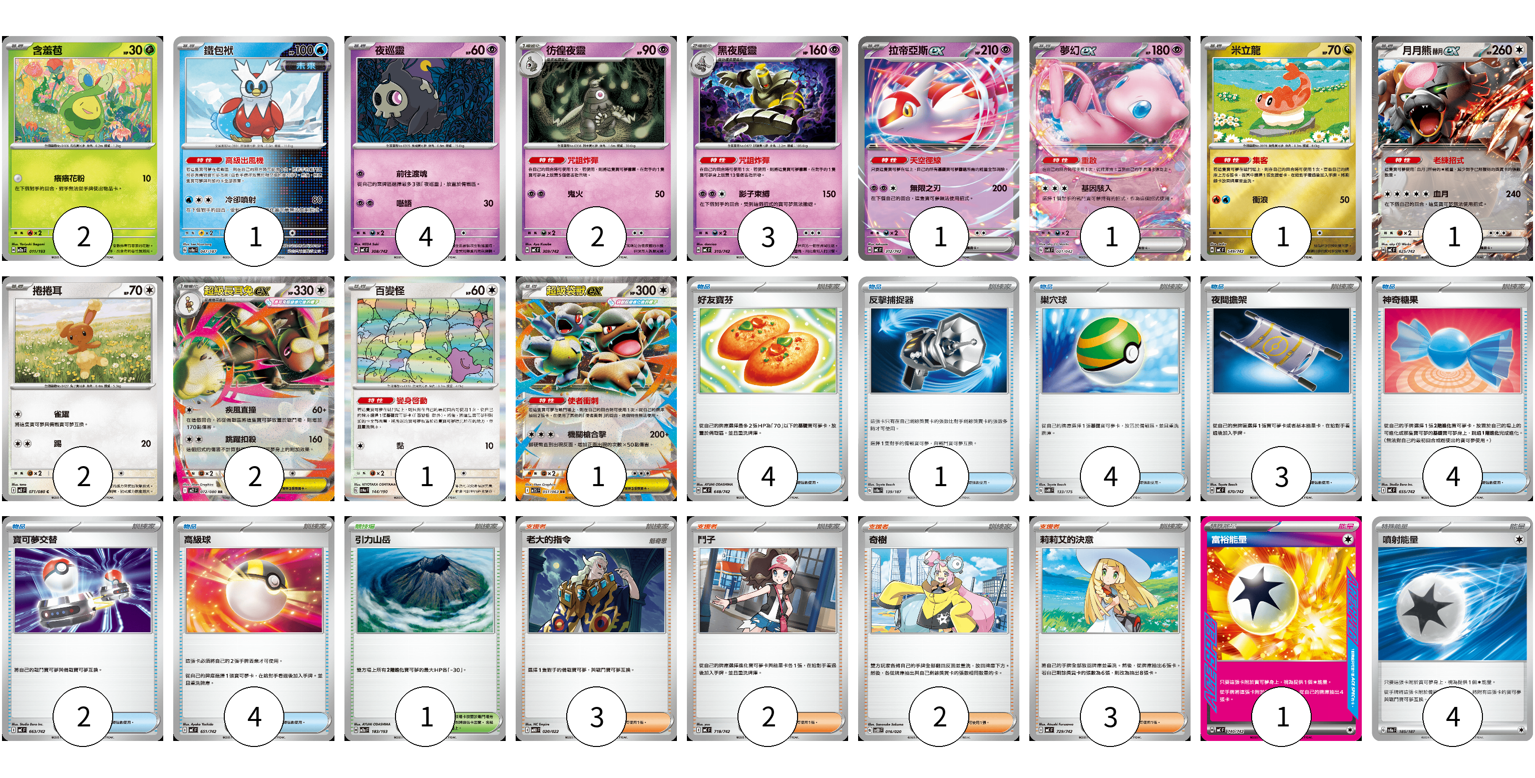 牌組構築方案 以此牌組為基礎新構築牌組 顯示卡面 顯示列表 寶可夢卡(22) 2 1 4 2 3 1 1 1 1 2 2 1 1 物品卡(22) 4 1 4 3 4 2 4 支援者卡(10) 3 2 2 3 競技場卡(1) 1 能量卡(5) 1 4 寶可夢卡(22) 卡牌名稱 張數 卡牌名稱 張數 含羞苞 M2a 011/193 02 鐵包袱 SV8a 047/187 01 夜巡靈 MC 308/742 04 彷徨夜靈 MC 309/742 02 黑夜魔靈 MC 310/742 03 拉帝亞斯ex MC 312/742 01 夢幻ex SVK 001/042 01 米立龍 MC 549/742 01 月月熊 赫月 ex MC 625/742 01 捲捲耳 M2 071/080 02 超級長耳兔ex M2 072/080 02 百變怪 SV4a 144/190 01 超級袋獸ex M1S 051/063 01 物品卡(22) 卡牌名稱 張數 卡牌名稱 張數 好友寶芬 MC 648/742 04 反擊捕捉器 SV8a 139/187 01 巢穴球 SVM 133/175 04 夜間擔架 MC 670/742 03 神奇糖果 MC 655/742 04 寶可夢交替 MC 663/742 02 高級球 MC 651/742 04 支援者卡(10) 卡牌名稱 張數 卡牌名稱 張數 老大的指令 MBD 020/022 03 鬥子 MC 718/742 02 奇樹 SVOD 016/020 02 莉莉艾的決意 MC 729/742 03 競技場卡(1) 卡牌名稱 張數 卡牌名稱 張數 引力山岳 M2a 183/193 01 能量卡(5) 卡牌名稱 張數 卡牌名稱 張數 富裕能量 MC 740/742 01 噴射能量 SV8a 185/187 04 以此牌組為基礎新構築牌組 牌組編碼 sgkIdF-FnEIEM-GqkYEG copy 列印牌組單 牌組編碼已複製 分享至SNS