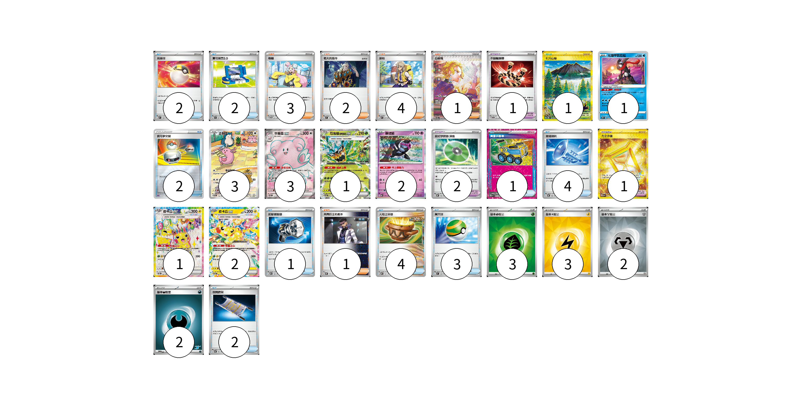 牌組構築方案 以此牌組為基礎新構築牌組 顯示卡面 顯示列表 寶可夢卡(13) 1 3 3 1 2 1 2 寶可夢道具(4) 1 2 1 物品卡(21) 2 2 2 1 4 1 4 3 2 支援者卡(11) 3 2 4 1 1 競技場卡(1) 1 能量卡(10) 3 3 2 2 寶可夢卡(13) 卡牌名稱 張數 卡牌名稱 張數 光輝甲賀忍蛙 SVTG 002/019 01 吉利蛋 SV6 113/101 03 幸福蛋ex SV6 121/101 03 厄鬼椪 碧草面具ex SV6 016/101 01 願增猿 SV8a 075/187 02 皮卡丘ex SV8 122/106 01 皮卡丘ex SV8 033/106 02 寶可夢道具(4) 卡牌名稱 張數 卡牌名稱 張數 不服輸頭帶 SVTL 016/021 01 招式學習器 演進 SV8a 160/187 02 力之沙漏 SV6a 094/064 01 物品卡(21) 卡牌名稱 張數 卡牌名稱 張數 高級球 SVM 134/175 02 寶可裝置3.0 SVK 021/042 02 寶可夢交替 SPD 011/020 02 貴重手推車 SVK 020/042 01 玻璃喇叭 SV8a 140/187 04 反擊捕捉器 SV8a 139/187 01 大地之容器 SV8a 143/187 04 巢穴球 SVM 133/175 03 夜間擔架 SV8a 151/187 02 支援者卡(11) 卡牌名稱 張數 卡牌名稱 張數 奇樹 SVTG 017/019 03 老大的指令 SVM 172/175 02 派帕 SVK 035/042 04 白蕾雅 SV7 132/102 01 弗圖博士的劇本 SV8a 175/187 01 競技場卡(1) 卡牌名稱 張數 卡牌名稱 張數 引力山岳 SV8 138/106 01 能量卡(10) 卡牌名稱 張數 卡牌名稱 張數 基本【草】能量 SVK GRA 03 基本【雷】能量 SVK LIG 03 基本【鋼】能量 SVK MET 02 基本【惡】能量 SVI DAR 02 以此牌組為基礎新構築牌組 牌組編碼 sixQUr-LeUPTO-tlxPFK copy 列印牌組單 牌組編碼已複製 分享至SNS