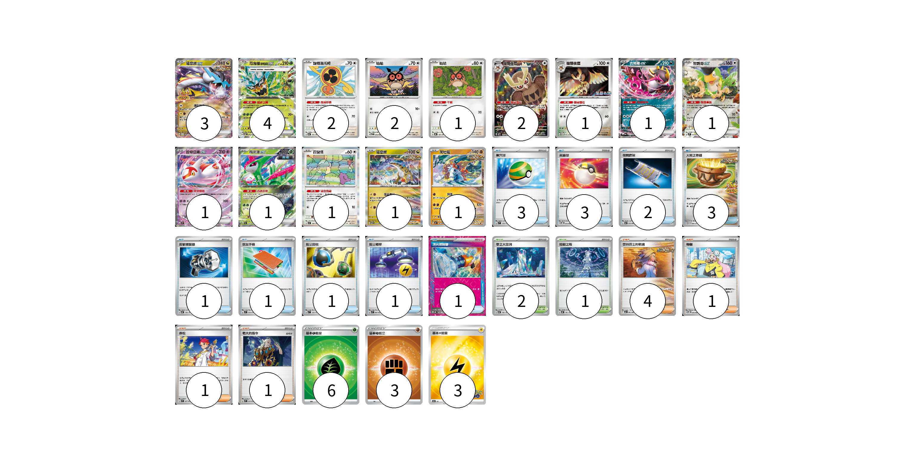 牌組構築方案 以此牌組為基礎新構築牌組 顯示卡面 顯示列表 寶可夢卡(22) 3 4 2 2 1 2 1 1 1 1 1 1 1 1 物品卡(16) 3 3 2 3 1 1 1 1 1 支援者卡(7) 4 1 1 1 競技場卡(3) 2 1 能量卡(12) 6 3 3 寶可夢卡(22) 卡牌名稱 張數 卡牌名稱 張數 猛雷鼓ex SV-P 081/SV-P 03 厄鬼椪 碧草面具ex SV6 016/101 04 旋轉洛托姆 SV8a 131/187 02 咕咕 SV7 076/102 02 咕咕 SV8a 127/187 01 貓頭夜鷹 SV7 114/102 02 貓頭夜鷹 SV-P 145/SV-P 01 吉雉雞ex SV6a 038/064 01 怒鸚哥ex SV2P 065/071 01 拉帝亞斯ex SV7a 019/064 01 鐵斑葉ex SV5M 016/071 01 百變怪 SV4a 144/190 01 猛雷鼓 SV7 075/102 01 爬地翅 SV4K 041/066 01 物品卡(16) 卡牌名稱 張數 卡牌名稱 張數 巢穴球 SVM 133/175 03 高級球 SVOD 012/020 03 夜間擔架 SV6a 056/064 02 大地之容器 SV-P 084/SV-P 03 反擊捕捉器 SV8a 139/187 01 朋友手冊 SV1S 069/078 01 能量回收 SVM 125/175 01 能量轉移 SVK 008/042 01 頂尖捕捉器 SV8a 148/187 01 支援者卡(7) 卡牌名稱 張數 卡牌名稱 張數 奧琳博士的氣魄 SV4K 064/066 04 奇樹 SVOD 016/020 01 赤松 SVK 027/042 01 老大的指令 SVK 036/042 01 競技場卡(3) 卡牌名稱 張數 卡牌名稱 張數 零之大空洞 SV8a 182/187 02 阻礙之塔 SV8a 181/187 01 能量卡(12) 卡牌名稱 張數 卡牌名稱 張數 基本【草】能量 SI GRA 06 基本鬥能量 SLL FIG 03 基本雷能量 S10b LIG 03 以此牌組為基礎新構築牌組 牌組編碼 sjADVw-gKJHnU-iaGvYp copy 列印牌組單 牌組編碼已複製 分享至SNS