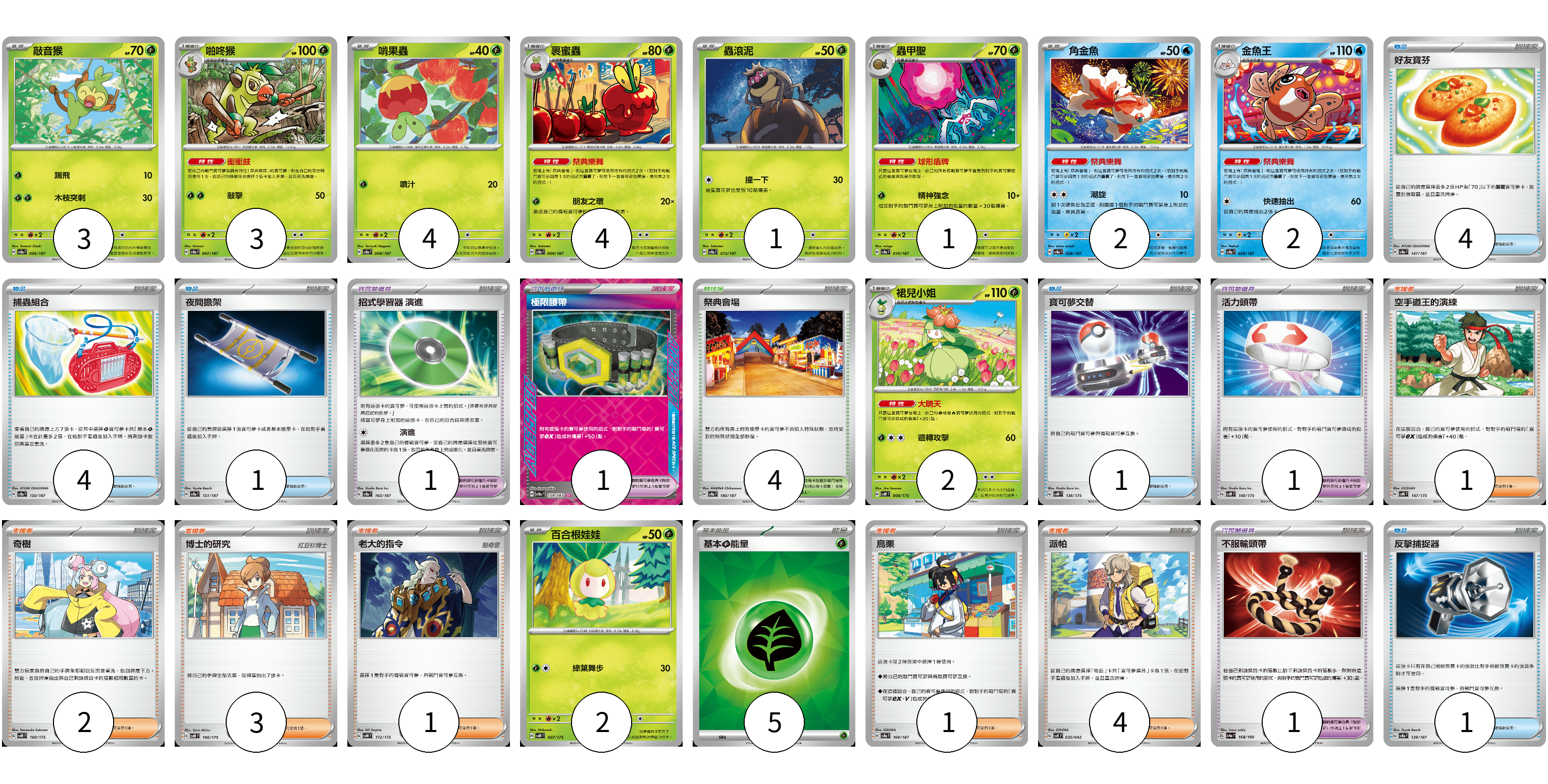 牌組構築方案 以此牌組為基礎新構築牌組 顯示卡面 顯示列表 寶可夢卡(24) 3 3 4 4 1 1 2 2 2 2 寶可夢道具(4) 1 1 1 1 物品卡(11) 4 4 1 1 1 支援者卡(12) 1 2 3 1 1 4 競技場卡(4) 4 能量卡(5) 5 寶可夢卡(24) 卡牌名稱 張數 卡牌名稱 張數 敲音猴 SV8a 006/187 03 啪咚猴 SV8a 007/187 03 啃果蟲 SV8a 008/187 04 裹蜜蟲 SV8a 009/187 04 蟲滾泥 SV8a 013/187 01 蟲甲聖 SV8a 014/187 01 角金魚 SV8a 028/187 02 金魚王 SV8a 029/187 02 裙兒小姐 SVM 008/175 02 百合根娃娃 SVM 007/175 02 寶可夢道具(4) 卡牌名稱 張數 卡牌名稱 張數 招式學習器 演進 SV8a 160/187 01 極限腰帶 SV8a 159/187 01 活力頭帶 SVM 140/175 01 不服輸頭帶 SV4a 168/190 01 物品卡(11) 卡牌名稱 張數 卡牌名稱 張數 好友寶芬 SV8a 147/187 04 捕蟲組合 SV8a 150/187 04 夜間擔架 SV8a 151/187 01 寶可夢交替 SVM 136/175 01 反擊捕捉器 SV8a 139/187 01 支援者卡(12) 卡牌名稱 張數 卡牌名稱 張數 空手道王的演練 SVM 147/175 01 奇樹 SVM 160/175 02 博士的研究 SVM 166/175 03 老大的指令 SVM 172/175 01 烏栗 SV8a 169/187 01 派帕 SVK 035/042 04 競技場卡(4) 卡牌名稱 張數 卡牌名稱 張數 祭典會場 SV8a 180/187 04 能量卡(5) 卡牌名稱 張數 卡牌名稱 張數 基本【草】能量 SVK GRA 05 以此牌組為基礎新構築牌組 牌組編碼 slJucY-DFpMlu-bijkRF copy 列印牌組單 牌組編碼已複製 分享至SNS