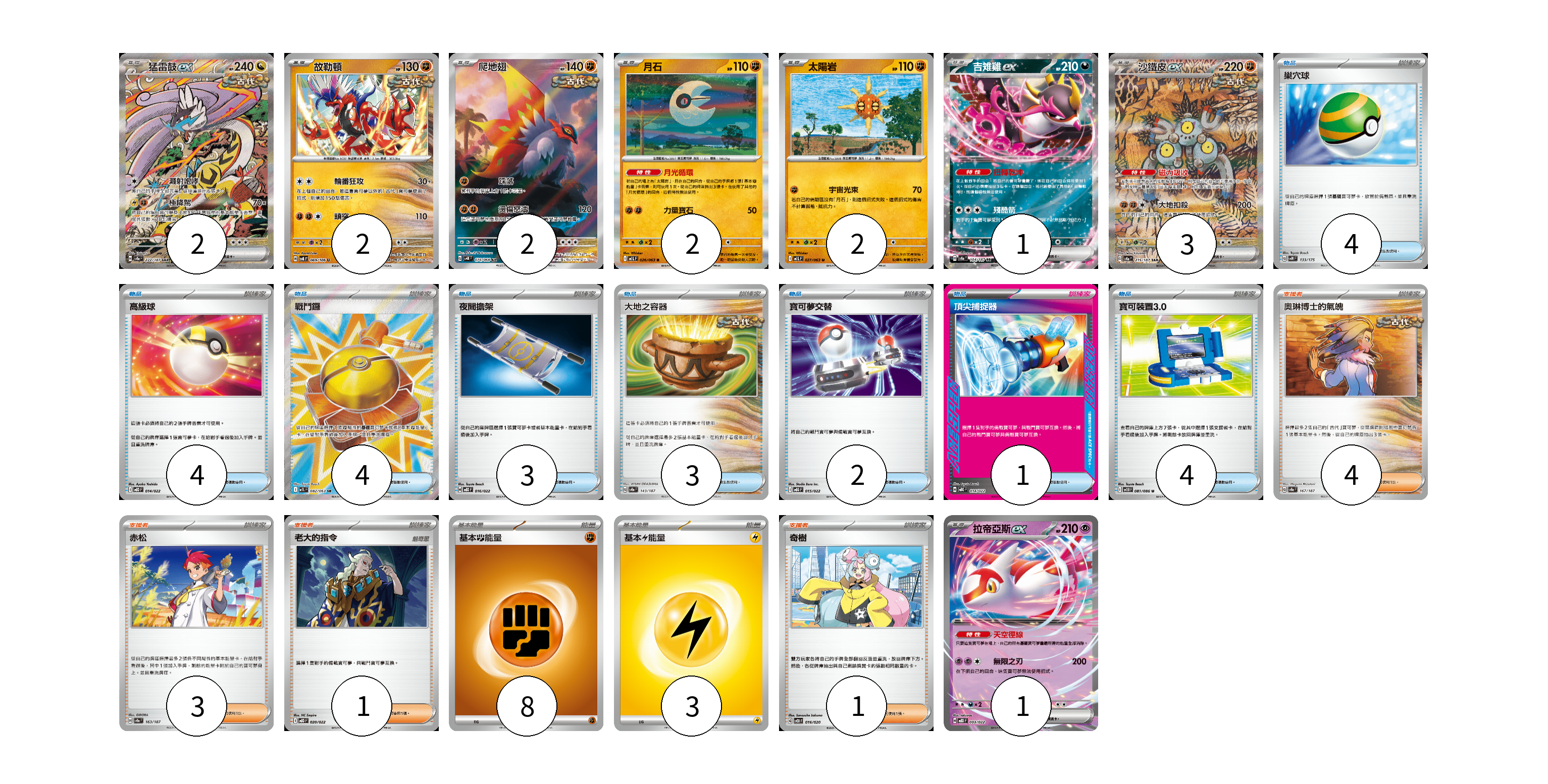 牌組構築方案 以此牌組為基礎新構築牌組 顯示卡面 顯示列表 寶可夢卡(15) 2 2 2 2 2 1 3 1 物品卡(25) 4 4 4 3 3 2 1 4 支援者卡(9) 4 3 1 1 能量卡(11) 8 3 寶可夢卡(15) 卡牌名稱 張數 卡牌名稱 張數 猛雷鼓ex SV8a 222/187 02 故勒頓 SV8 069/106 02 爬地翅 SV4K 074/066 02 月石 M1L 026/063 02 太陽岩 M1L 027/063 02 吉雉雞ex SV8a 104/187 01 沙鐵皮ex SV8a 215/187 03 拉帝亞斯ex MBD 003/022 01 物品卡(25) 卡牌名稱 張數 卡牌名稱 張數 巢穴球 SVM 133/175 04 高級球 MBD 014/022 04 戰鬥鑼 M1L 082/063 04 夜間擔架 MBD 016/022 03 大地之容器 SV8a 143/187 03 寶可夢交替 MBG 015/022 02 頂尖捕捉器 MBG 014/022 01 寶可裝置3.0 SV11B 081/086 04 支援者卡(9) 卡牌名稱 張數 卡牌名稱 張數 奧琳博士的氣魄 SV8a 167/187 04 赤松 SV8a 163/187 03 老大的指令 MBD 020/022 01 奇樹 SVOD 016/020 01 能量卡(11) 卡牌名稱 張數 卡牌名稱 張數 基本鬥能量 sv-p FIG 08 基本雷能量 sv-p LIG 03 以此牌組為基礎新構築牌組 牌組編碼 slgwFN-PzxFBT-jWIOqm copy 列印牌組單 牌組編碼已複製 分享至SNS