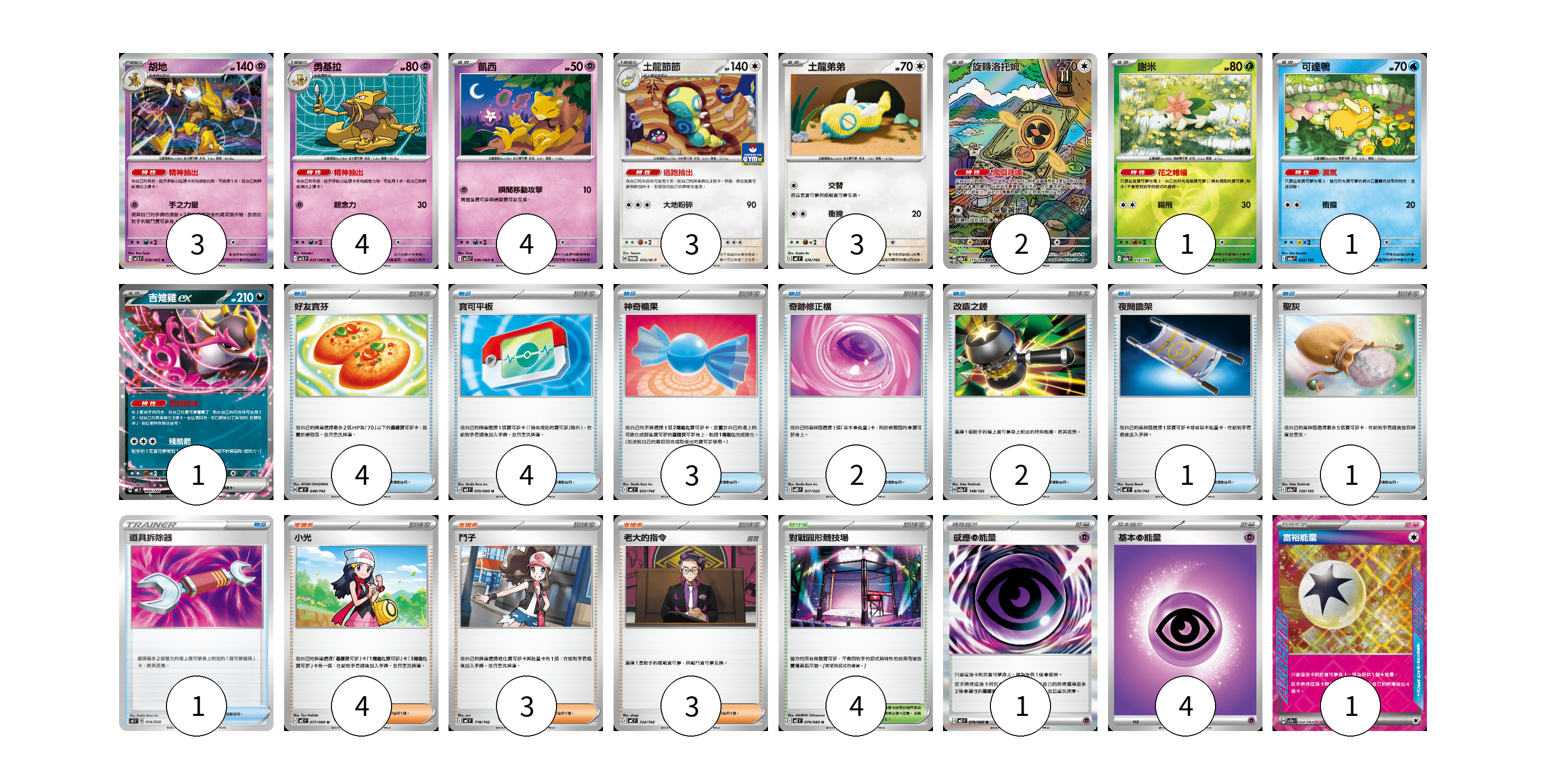 牌組構築方案 以此牌組為基礎新構築牌組 顯示卡面 顯示列表 寶可夢卡(22) 3 4 4 3 3 2 1 1 1 物品卡(18) 4 4 3 2 2 1 1 1 支援者卡(10) 4 3 3 競技場卡(4) 4 能量卡(6) 1 4 1 寶可夢卡(22) 卡牌名稱 張數 卡牌名稱 張數 胡地 M1S 038/063 03 勇基拉 M1S 037/063 04 凱西 M1S 036/063 04 土龍節節 M-P 045/M-P 03 土龍弟弟 MC 574/742 03 旋轉洛托姆 M2a 213/193 02 謝米 M2a 012/193 01 可達鴨 M2a 032/193 01 吉雉雞ex MC 489/742 01 物品卡(18) 卡牌名稱 張數 卡牌名稱 張數 好友寶芬 MC 648/742 04 寶可平板 M3 070/080 04 神奇糖果 MC 655/742 03 奇跡修正檔 MBD 017/022 02 改造之錘 M2a 148/193 02 夜間擔架 MC 670/742 01 聖灰 M2a 150/193 01 道具拆除器 SK 014/030 01 支援者卡(10) 卡牌名稱 張數 卡牌名稱 張數 小光 M2 077/080 04 鬥子 MC 718/742 03 老大的指令 MC 724/742 03 競技場卡(4) 卡牌名稱 張數 卡牌名稱 張數 對戰圓形競技場 M2 079/080 04 能量卡(6) 卡牌名稱 張數 卡牌名稱 張數 感應【超】能量 M3 079/080 01 基本【超】能量 MBD PSY 04 富裕能量 SV7a 064/064 01 以此牌組為基礎新構築牌組 牌組編碼 slmJLN-jDgCZH-YejVXy copy 列印牌組單 牌組編碼已複製 分享至SNS