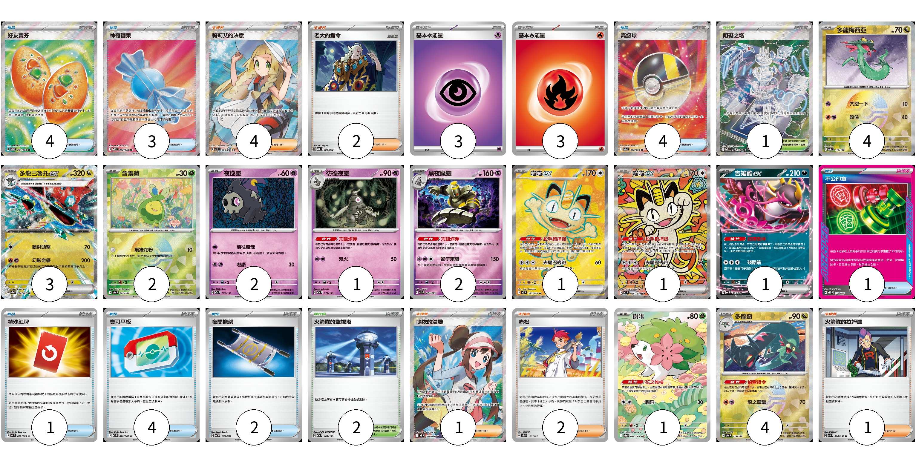 牌組構築方案 以此牌組為基礎新構築牌組 顯示卡面 顯示列表 寶可夢卡(22) 4 3 2 2 1 2 1 1 1 1 4 物品卡(19) 4 3 4 1 1 4 2 支援者卡(10) 4 2 1 2 1 競技場卡(3) 1 2 能量卡(6) 3 3 寶可夢卡(22) 卡牌名稱 張數 卡牌名稱 張數 多龍梅西亞 SV8a 118/187 04 多龍巴魯托ex SV8a 120/187 03 含羞苞 SV8a 001/187 02 夜巡靈 M2a 072/193 02 彷徨夜靈 M2a 073/193 01 黑夜魔靈 M2a 074/193 02 喵喵ex M3 100/080 01 喵喵ex M3 114/080 01 吉雉雞ex MC 489/742 01 謝米 SV9a 066/063 01 多龍奇 SV8a 119/187 04 物品卡(19) 卡牌名稱 張數 卡牌名稱 張數 好友寶芬 M1S 081/063 04 神奇糖果 M1S 082/063 03 高級球 M2a 216/193 04 不公印章 MBD 011/022 01 特殊紅牌 M4 072/083 01 寶可平板 M3 070/080 04 夜間擔架 MC 670/742 02 支援者卡(10) 卡牌名稱 張數 卡牌名稱 張數 莉莉艾的決意 M1L 086/063 04 老大的指令 MBD 020/022 02 鳴依的勉勵 M3 107/080 01 赤松 SV8a 163/187 02 火箭隊的拉姆達 SV10 094/098 01 競技場卡(3) 卡牌名稱 張數 卡牌名稱 張數 阻礙之塔 M2a 222/193 01 火箭隊的監視塔 M2a 189/193 02 能量卡(6) 卡牌名稱 張數 卡牌名稱 張數 基本【超】能量 SVB PSY 03 基本【火】能量 SVAL FIR 03 以此牌組為基礎新構築牌組 牌組編碼 srKsEw-zmKfBw-tIKgJu copy 列印牌組單 牌組編碼已複製 分享至SNS