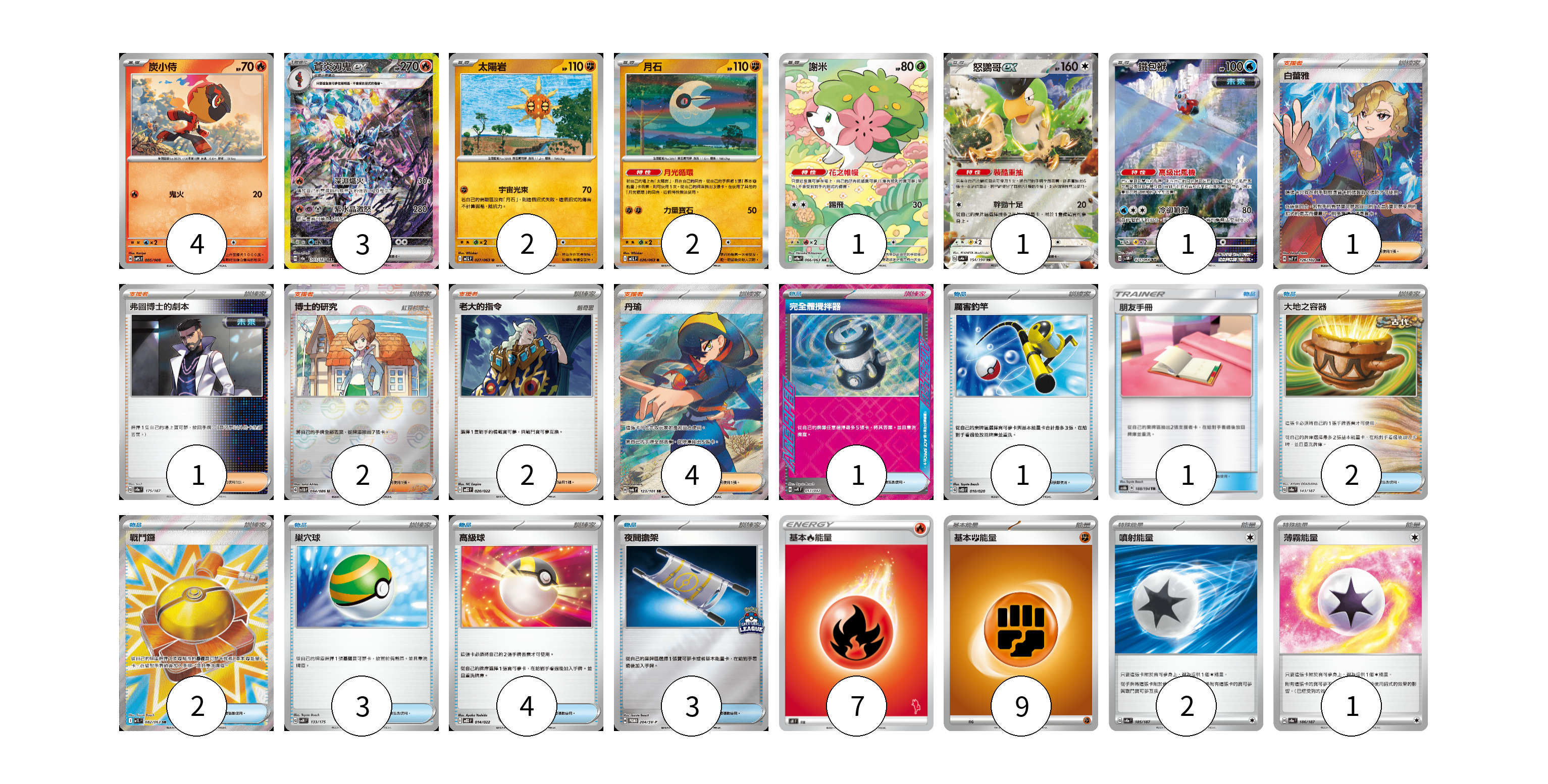 牌組構築方案 以此牌組為基礎新構築牌組 顯示卡面 顯示列表 寶可夢卡(14) 4 3 2 2 1 1 1 物品卡(17) 1 1 1 2 2 3 4 3 支援者卡(10) 1 1 2 2 4 能量卡(19) 7 9 2 1 寶可夢卡(14) 卡牌名稱 張數 卡牌名稱 張數 炭小侍 SVPS 005/008 04 蒼炎刃鬼ex SV8a 203/187 03 太陽岩 M1L 027/063 02 月石 M1L 026/063 02 謝米 SV9a 066/063 01 怒鸚哥ex SV4a 154/190 01 鐵包袱 SV4M 071/066 01 物品卡(17) 卡牌名稱 張數 卡牌名稱 張數 完全體攪拌器 SVK 017/042 01 厲害釣竿 SVOD 010/020 01 朋友手冊 AS6b 188/194 01 大地之容器 SV8a 143/187 02 戰鬥鑼 M1L 082/063 02 巢穴球 SVM 133/175 03 高級球 MBD 014/022 04 夜間擔架 SV-P 204/SV-P 03 支援者卡(10) 卡牌名稱 張數 卡牌名稱 張數 白蕾雅 SV7 126/102 01 弗圖博士的劇本 SV8a 175/187 01 博士的研究 SV11B 084/086 02 老大的指令 MBD 020/022 02 丹瑜 SV6 123/101 04 能量卡(19) 卡牌名稱 張數 卡牌名稱 張數 基本火能量 SH FIR 07 基本鬥能量 sv-p FIG 09 噴射能量 SV8a 185/187 02 薄霧能量 SV8a 186/187 01 以此牌組為基礎新構築牌組 牌組編碼 srObZK-qSzvKs-GRlUka copy 列印牌組單 牌組編碼已複製 分享至SNS