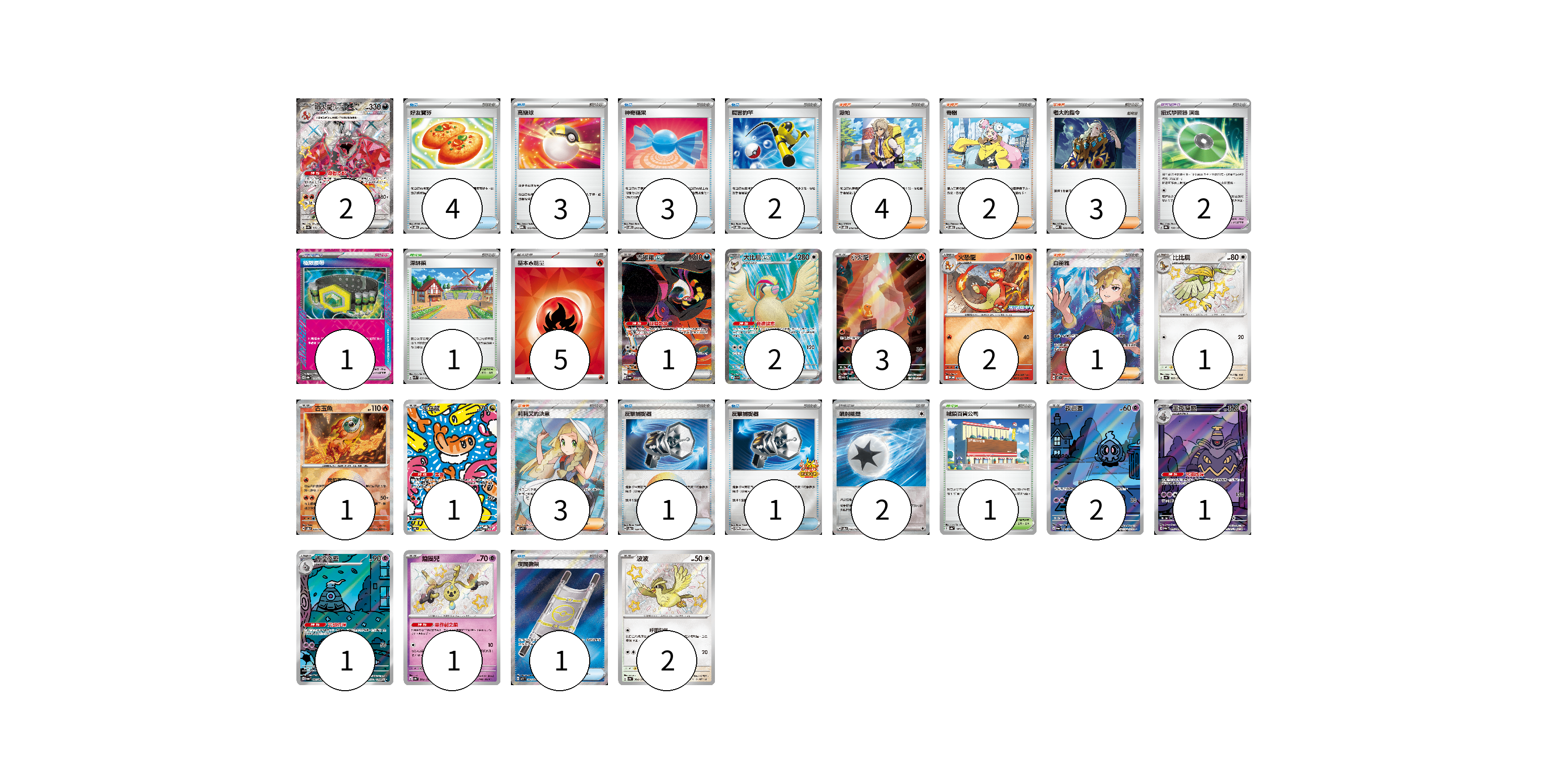 牌組構築方案 以此牌組為基礎新構築牌組 顯示卡面 顯示列表 寶可夢卡(20) 2 1 2 3 2 1 1 1 2 1 1 1 2 寶可夢道具(3) 2 1 物品卡(15) 4 3 3 2 1 1 1 支援者卡(13) 4 2 3 1 3 競技場卡(2) 1 1 能量卡(7) 5 2 寶可夢卡(20) 卡牌名稱 張數 卡牌名稱 張數 噴火龍ex SV4a 331/190 02 吉雉雞ex SV6a 089/064 01 大比鳥ex SV3 128/108 02 小火龍 SV2a 168/165 03 火恐龍 M-P 021/M-P 02 比比鳥 SV4a 305/190 01 古玉魚 SV8a 025/187 01 米立龍 SV6 112/101 01 夜巡靈 SV6a 068/064 02 黑夜魔靈 SV6a 070/064 01 彷徨夜靈 SV6a 069/064 01 鑰圈兒 SV4a 264/190 01 波波 SV4a 304/190 02 寶可夢道具(3) 卡牌名稱 張數 卡牌名稱 張數 招式學習器 演進 SV8a 160/187 02 極限腰帶 SV8a 159/187 01 物品卡(15) 卡牌名稱 張數 卡牌名稱 張數 好友寶芬 SVOD 011/020 04 高級球 MBG 012/022 03 神奇糖果 SVOM 014/021 03 厲害釣竿 SVOD 010/020 02 反擊捕捉器 SV8a 139/187 01 反擊捕捉器 SV-P 083/SV-P 01 夜間擔架 M1L 083/063 01 支援者卡(13) 卡牌名稱 張數 卡牌名稱 張數 派帕 SVOD 018/020 04 奇樹 SVOD 016/020 02 老大的指令 MBD 020/022 03 白蕾雅 SV7 126/102 01 莉莉艾的決意 M1L 086/063 03 競技場卡(2) 卡牌名稱 張數 卡牌名稱 張數 深缽鎮 SVK 039/042 01 城鎮百貨公司 SV4a 183/190 01 能量卡(7) 卡牌名稱 張數 卡牌名稱 張數 基本【火】能量 SVQL FIR 05 噴射能量 SV8a 185/187 02 以此牌組為基礎新構築牌組 牌組編碼 styfVy-MKSmQK-ZFZGaP copy 列印牌組單 牌組編碼已複製 分享至SNS