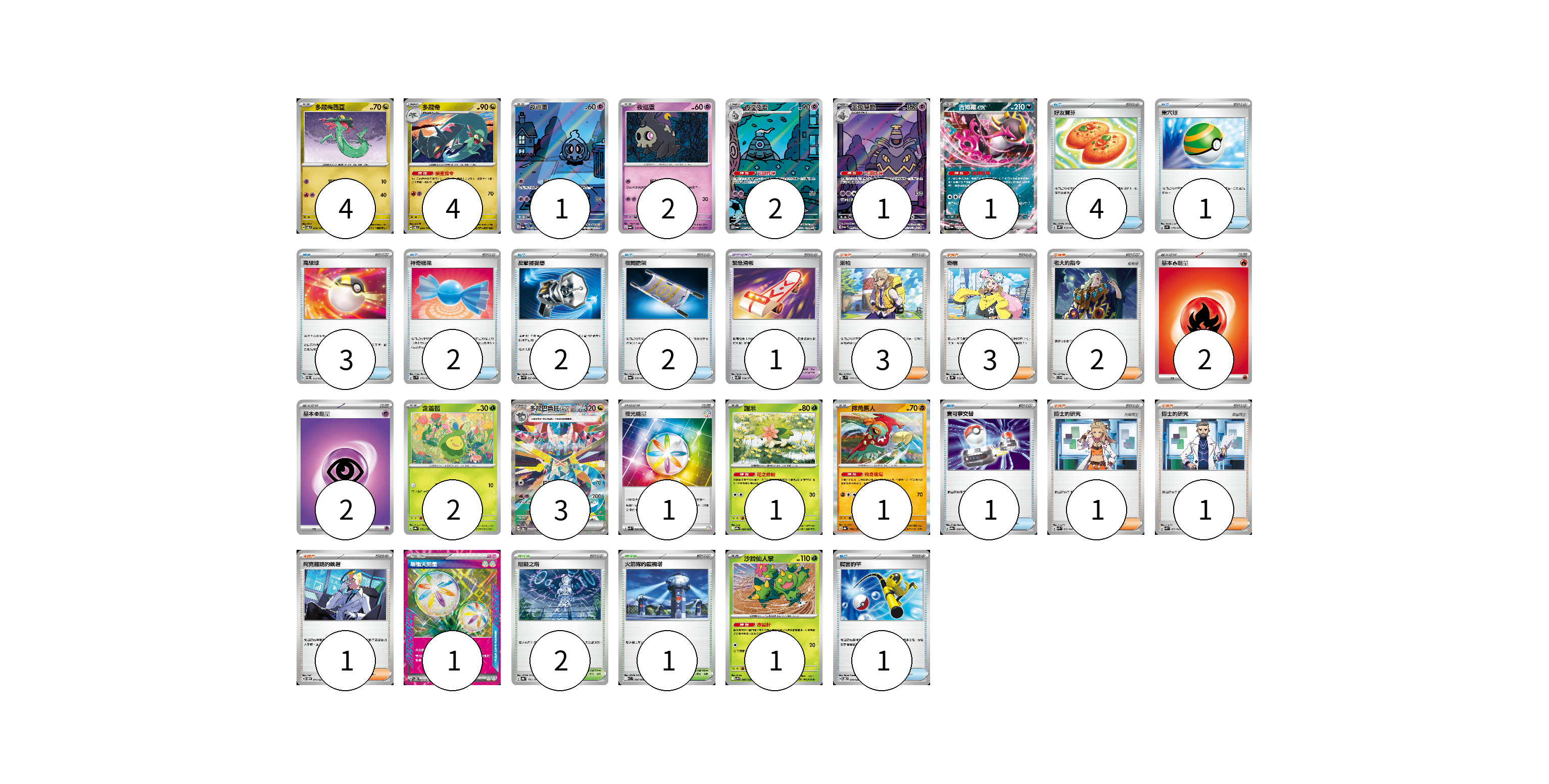 牌組構築方案 以此牌組為基礎新構築牌組 顯示卡面 顯示列表 寶可夢卡(23) 4 4 1 2 2 1 1 2 3 1 1 1 寶可夢道具(1) 1 物品卡(16) 4 1 3 2 2 2 1 1 支援者卡(11) 3 3 2 1 1 1 競技場卡(3) 2 1 能量卡(6) 2 2 1 1 寶可夢卡(23) 卡牌名稱 張數 卡牌名稱 張數 多龍梅西亞 SV6 079/101 04 多龍奇 SV6 080/101 04 夜巡靈 SV6a 068/064 01 夜巡靈 SV6a 018/064 02 彷徨夜靈 SV6a 069/064 02 黑夜魔靈 SV6a 070/064 01 吉雉雞ex SV6a 038/064 01 含羞苞 SV8a 001/187 02 多龍巴魯托ex SV8a 221/187 03 謝米 SV9a 006/063 01 摔角鷹人 SV8a 084/187 01 沙鈴仙人掌 SV9 006/100 01 寶可夢道具(1) 卡牌名稱 張數 卡牌名稱 張數 緊急滑板 SV5K 064/071 01 物品卡(16) 卡牌名稱 張數 卡牌名稱 張數 好友寶芬 SV5K 063/071 04 巢穴球 SV1S 070/078 01 高級球 SVEM 013/020 03 神奇糖果 SV1V 072/078 02 反擊捕捉器 SV4M 059/066 02 夜間擔架 SV6a 056/064 02 寶可夢交替 SV9a 058/063 01 厲害釣竿 SVOD 010/020 01 支援者卡(11) 卡牌名稱 張數 卡牌名稱 張數 派帕 SV1V 076/078 03 奇樹 SV2D 069/071 03 老大的指令(魁奇思) SVD 138/139 02 博士的研究 SVK 032/042 01 博士的研究 SVK 033/042 01 阿克羅瑪的執著 SVOM 017/021 01 競技場卡(3) 卡牌名稱 張數 卡牌名稱 張數 阻礙之塔 SV8a 181/187 02 火箭隊的監視塔 SV10 096/098 01 能量卡(6) 卡牌名稱 張數 卡牌名稱 張數 基本火能量 sv-p FIR 02 基本超能量 sv-p PSY 02 夜光能量 SVK 042/042 01 新衝天能量 SV5K 071/071 01 以此牌組為基礎新構築牌組 牌組編碼 svCBOK-pAzUNI-jDKoOk copy 列印牌組單 牌組編碼已複製 分享至SNS
